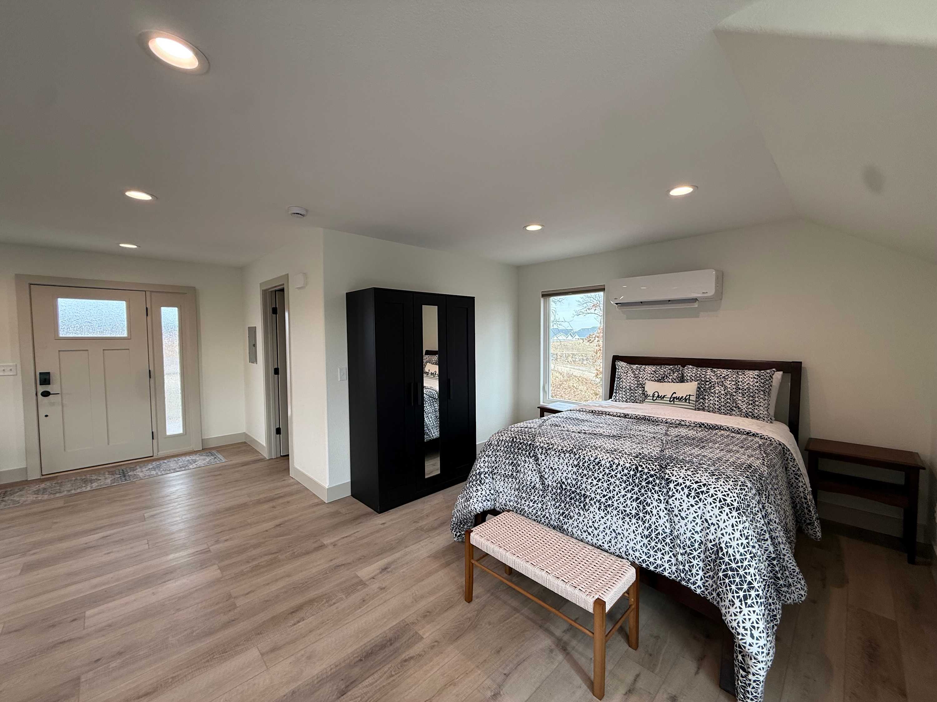 Bedroom #4 is an apartment-style room and includes a queen size bed, a queen size sleeper sofa, a smart TV, a living space, a kitchen, and an ensuite bathroom with a single vanity and a walk-in shower.