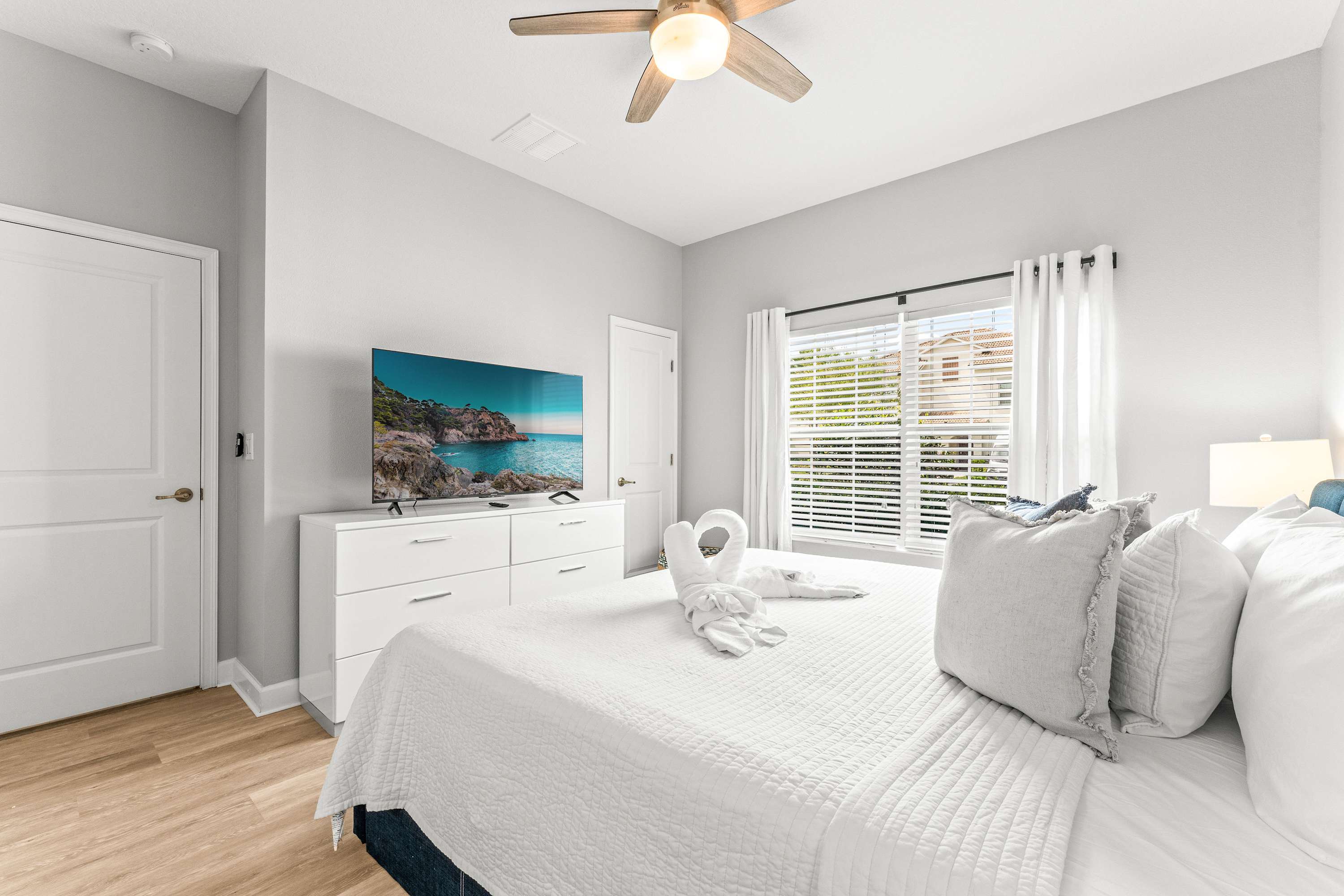 Bedroom #4 includes a king size bed, a smart TV, and an ensuite bathroom with a dual vanity and a shower/tub combo.