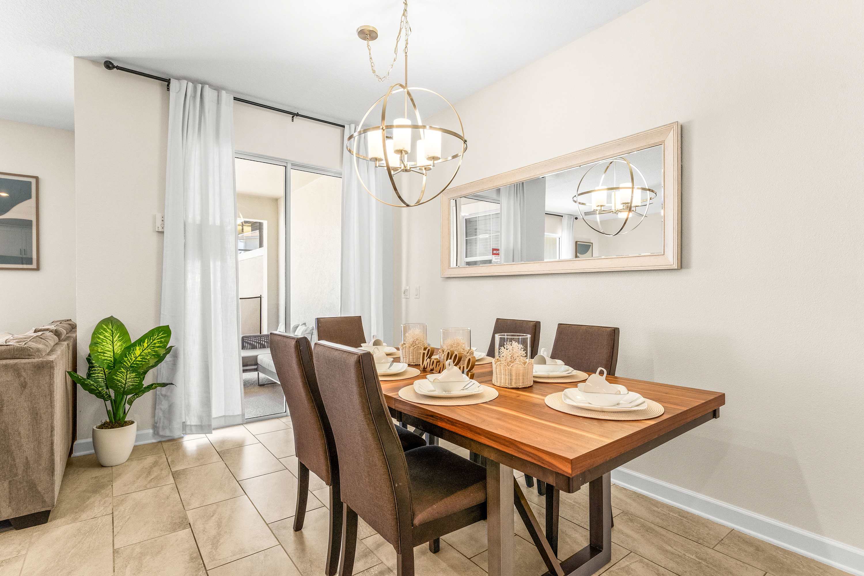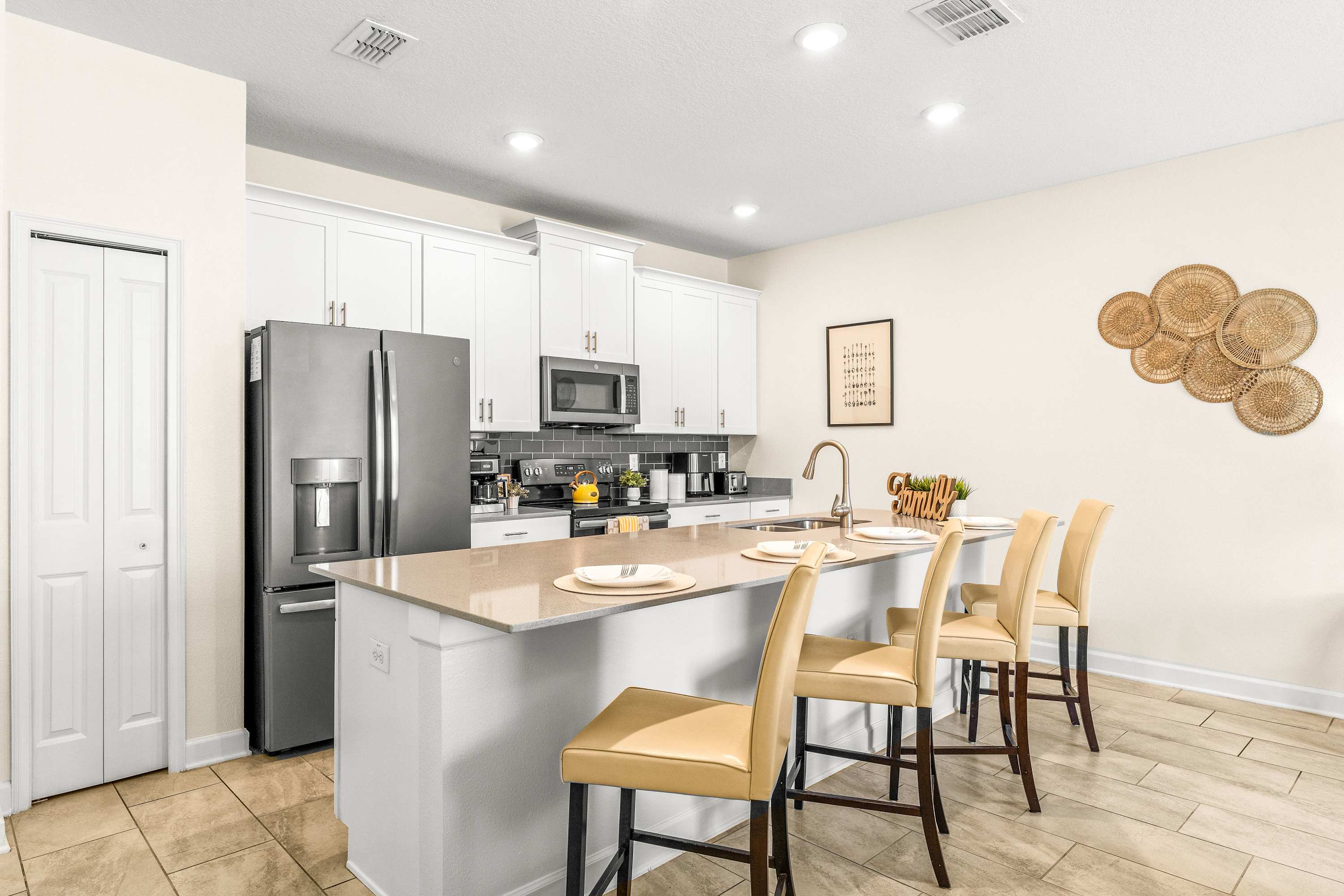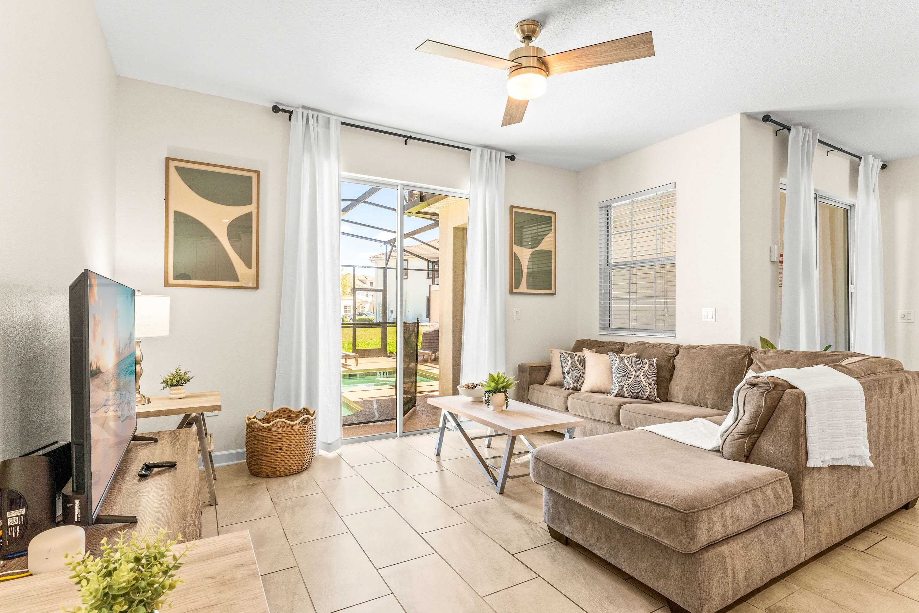 Step inside Bright Luxe At Championsgate and you’re welcomed into a bright, open-concept space designed for comfort and style. The kitchen immediately impresses with sleek granite countertops, charcoal stainless appliances, and an oversized island with seating for four—ideal for casual breakfasts or evening cocktails, especially with extras like an air fryer and espresso machine at your fingertips. Just beyond, the dining area comfortably seats six and overlooks the sparkling pool through sliding glass doors, creating a seamless indoor-outdoor flow. The living room blends cozy and modern with boho-inspired touches, an L-shaped sofa perfect for lounging, a smart TV, and even an Xbox for added entertainment, all opening directly to the patio.