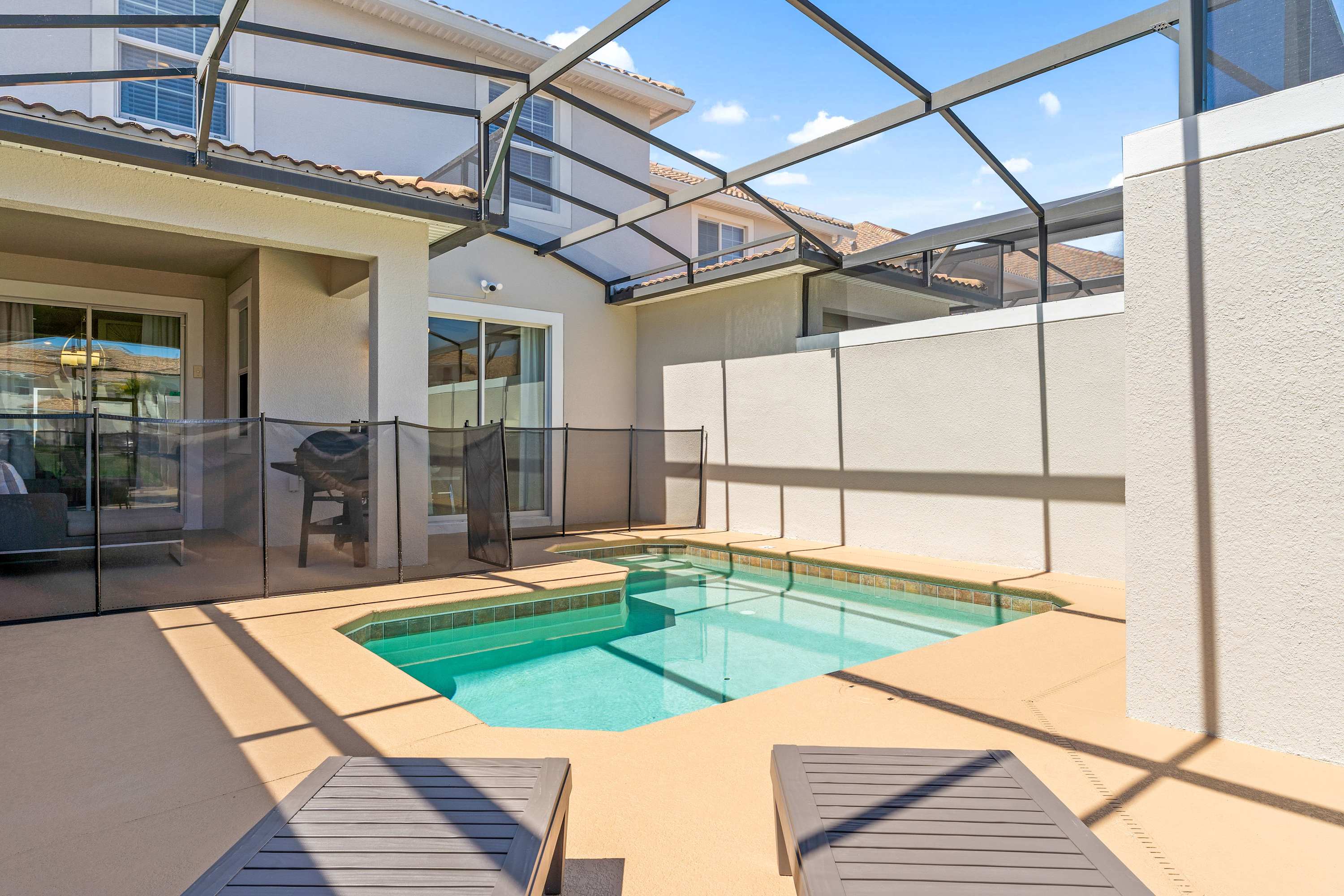Outside, your private oasis awaits. The covered patio features a shaded overhang with a loveseat and chaise seating for three—perfect for escaping the Florida sun while still enjoying the warm breeze. The plunge pool invites you to cool off anytime, while two chaise loungers provide the perfect spot to unwind, sip a drink, and soak in the relaxed, resort-style atmosphere.