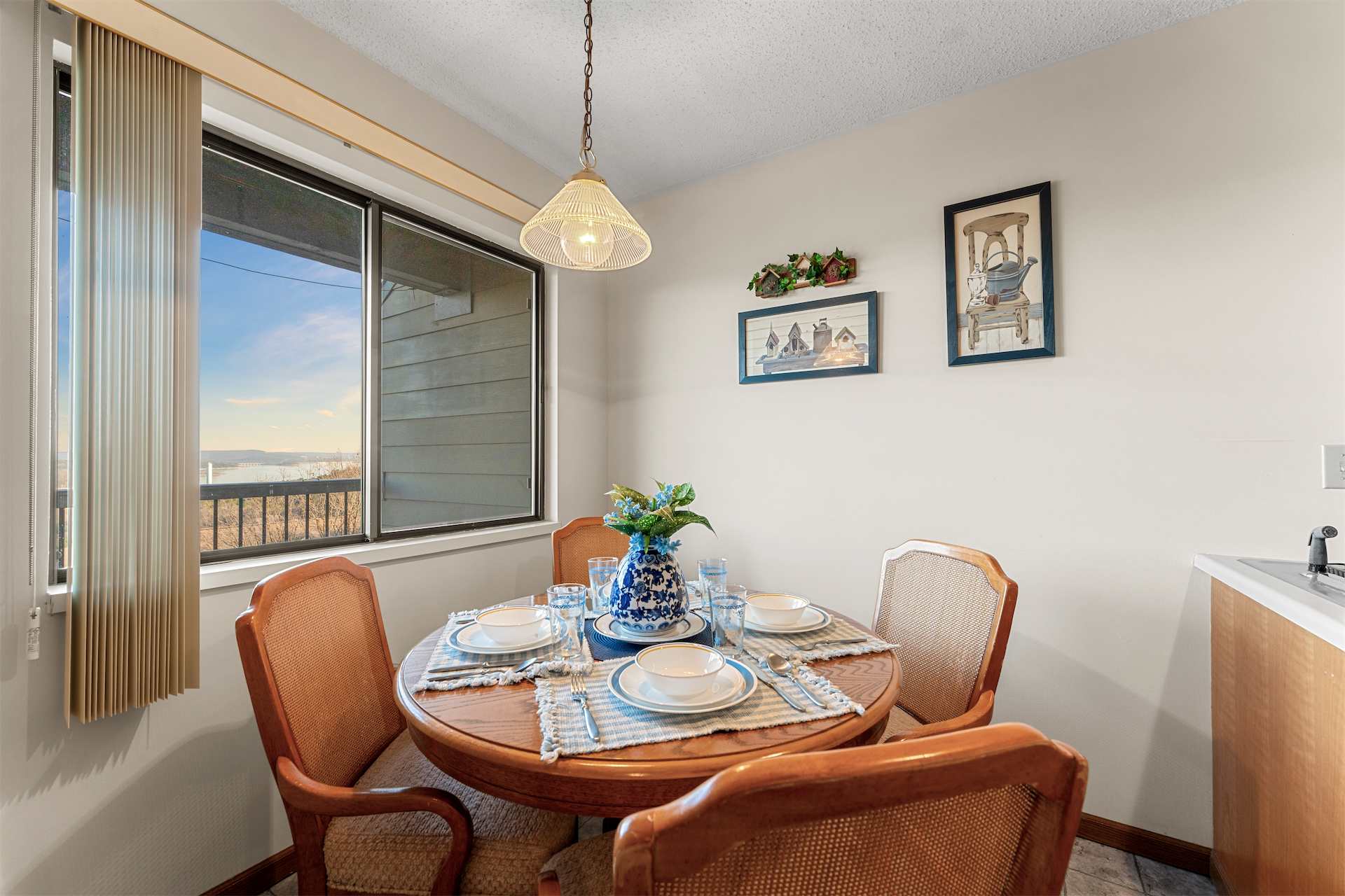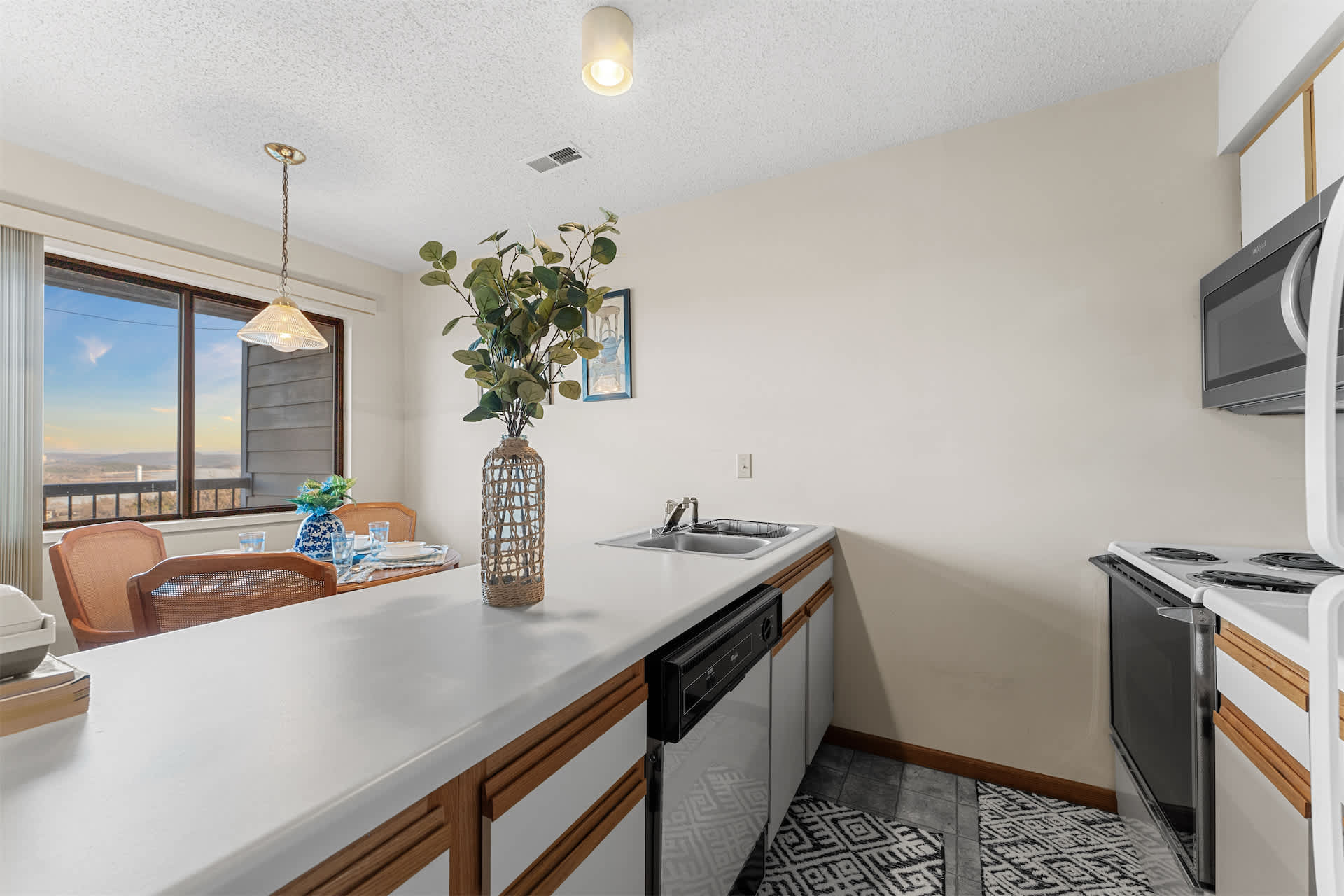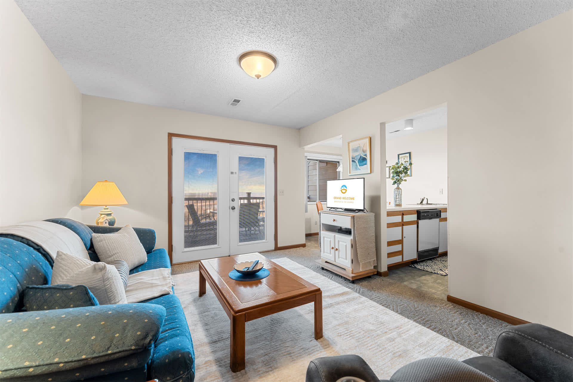 Step inside Little Treehouse on the Lake and you’re immediately drawn to the natural light and breathtaking views. The kitchen is thoughtfully equipped with all the essentials and comforts of home, making it easy to prepare anything from quick breakfasts to cozy dinners. Just beside it, a dining table for four sits next to a large window that perfectly frames the stunning water and mountain scenery—turning every meal into a memorable moment. The living room invites you to unwind with a comfortable couch, armchair, and cable TV, while elegant French doors open out to your private deck. Here, a table for four sets the stage for unforgettable al fresco dining, where you can soak in sweeping lake and mountain views as the sun sets and the peaceful surroundings take over.