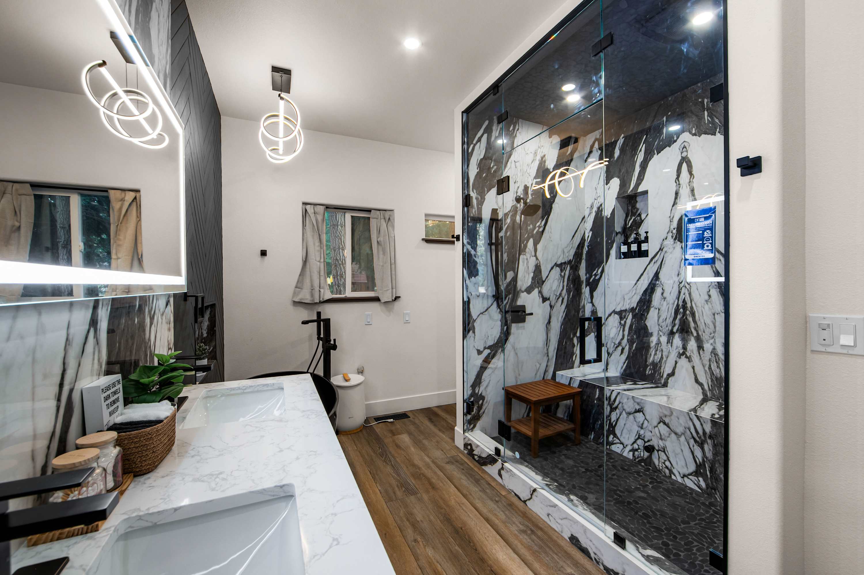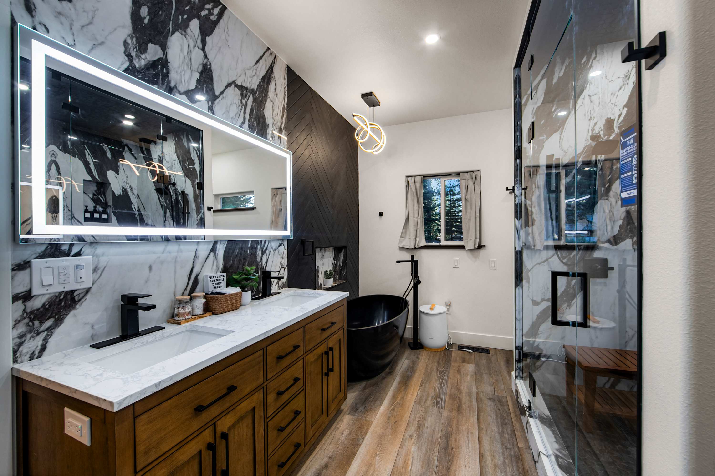 Bedroom #1 includes a king size bed, a smart TV, a desk, and an ensuite bathroom with a dual vanity, a soaking tub, and a walk-in shower.