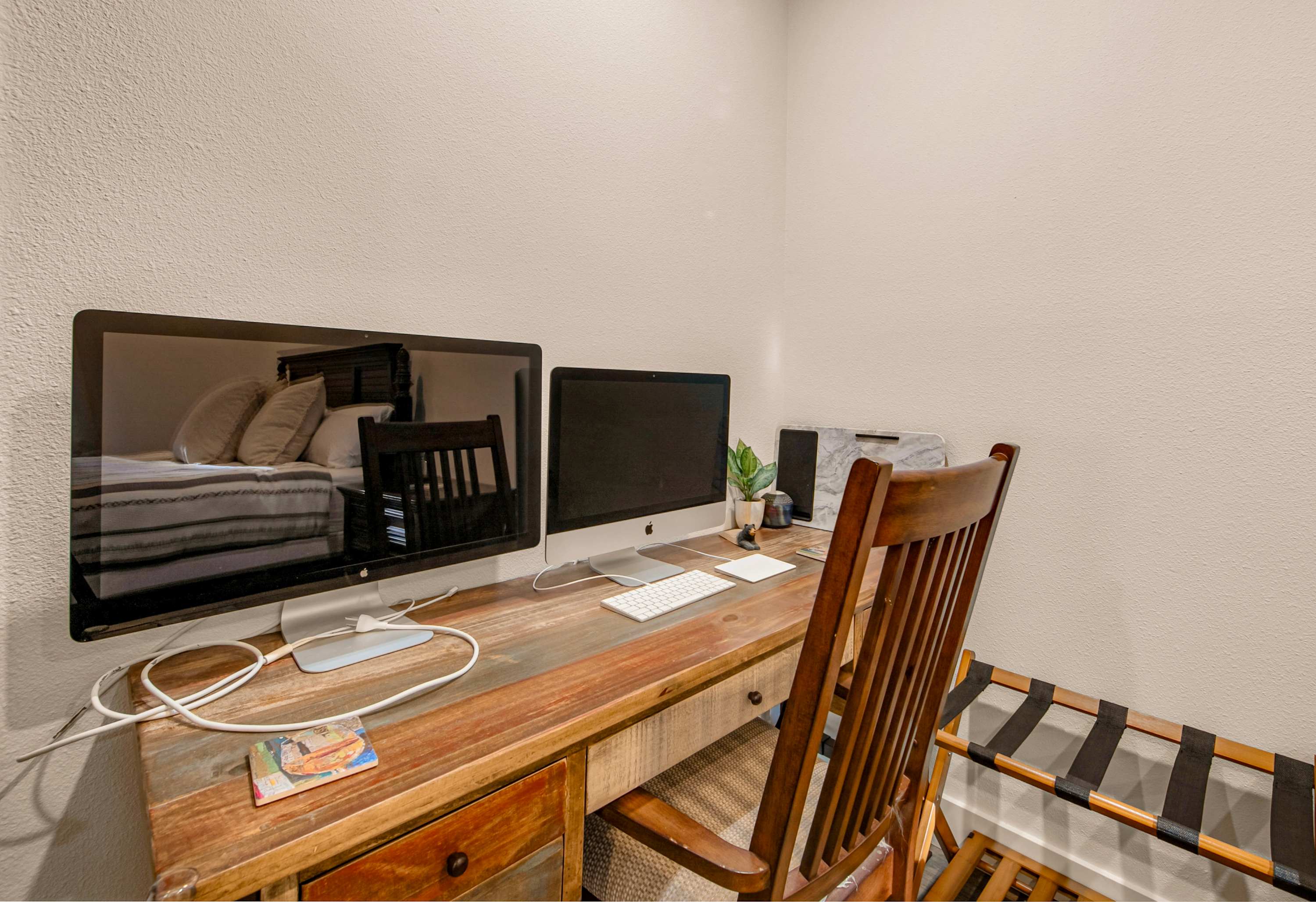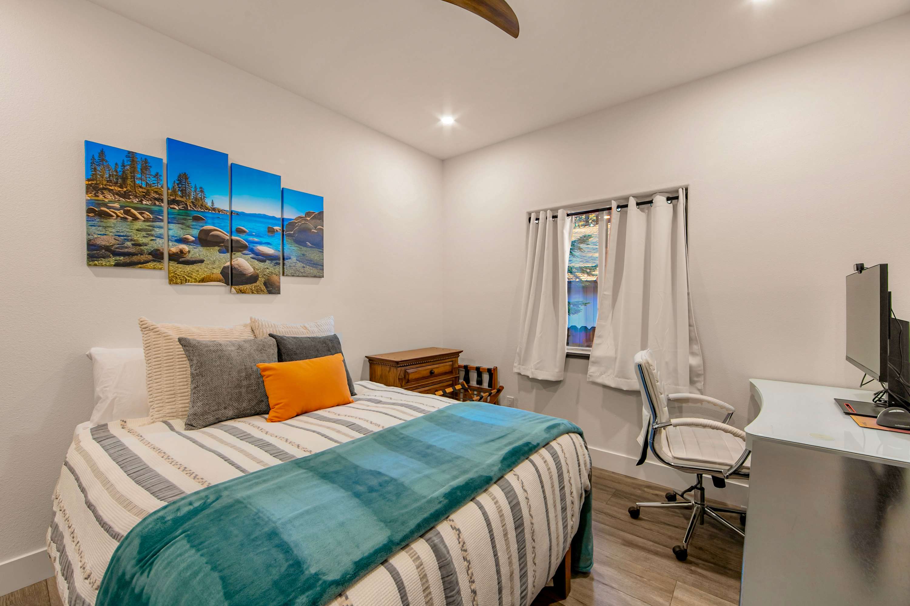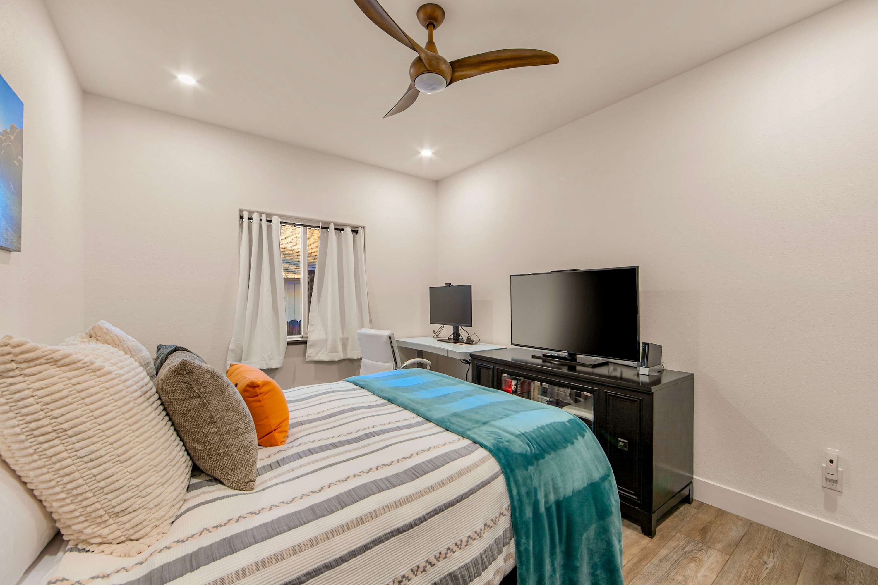 Bedroom #3 includes a full size bed, a smart TV, and a standing desk.