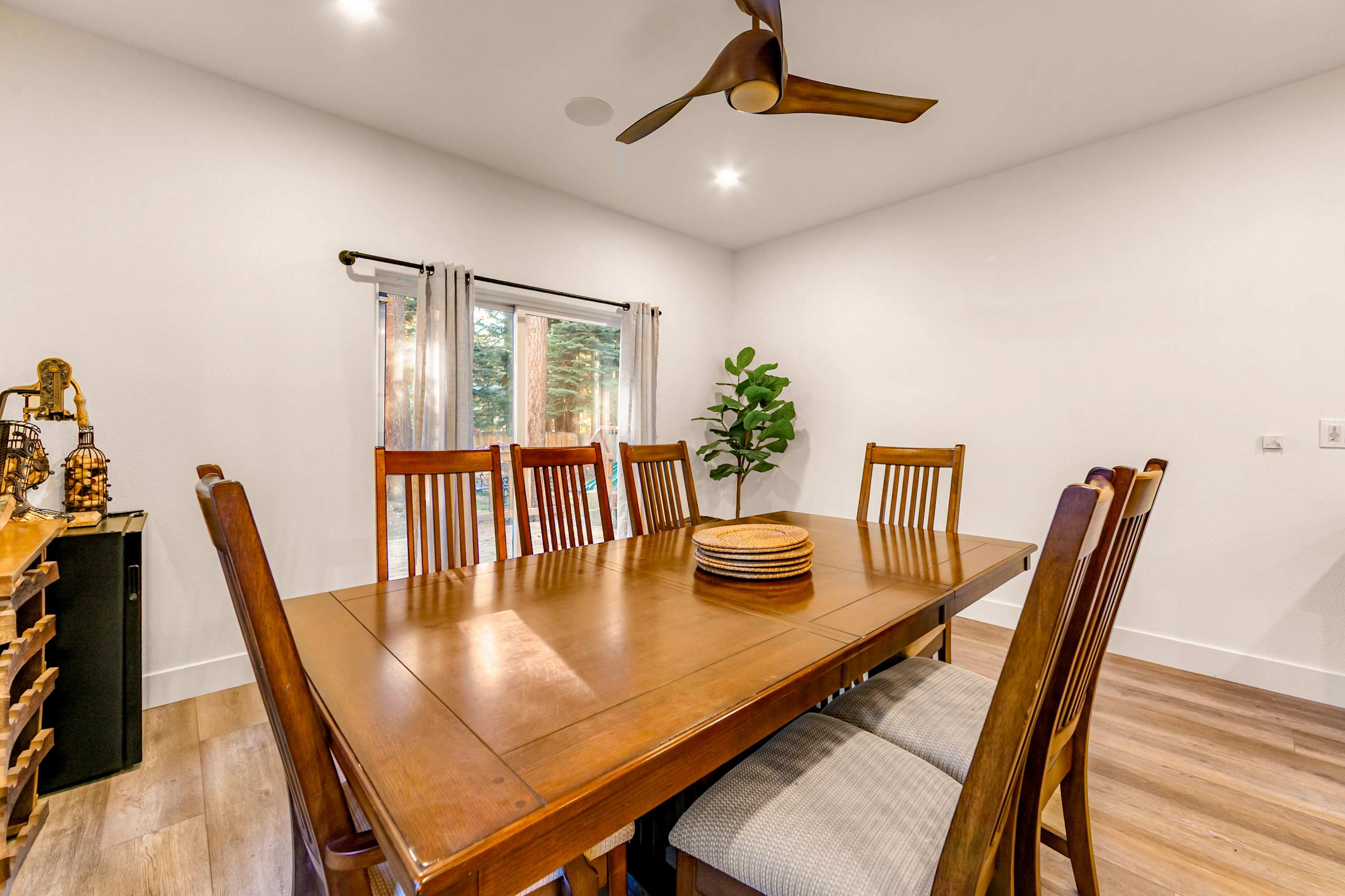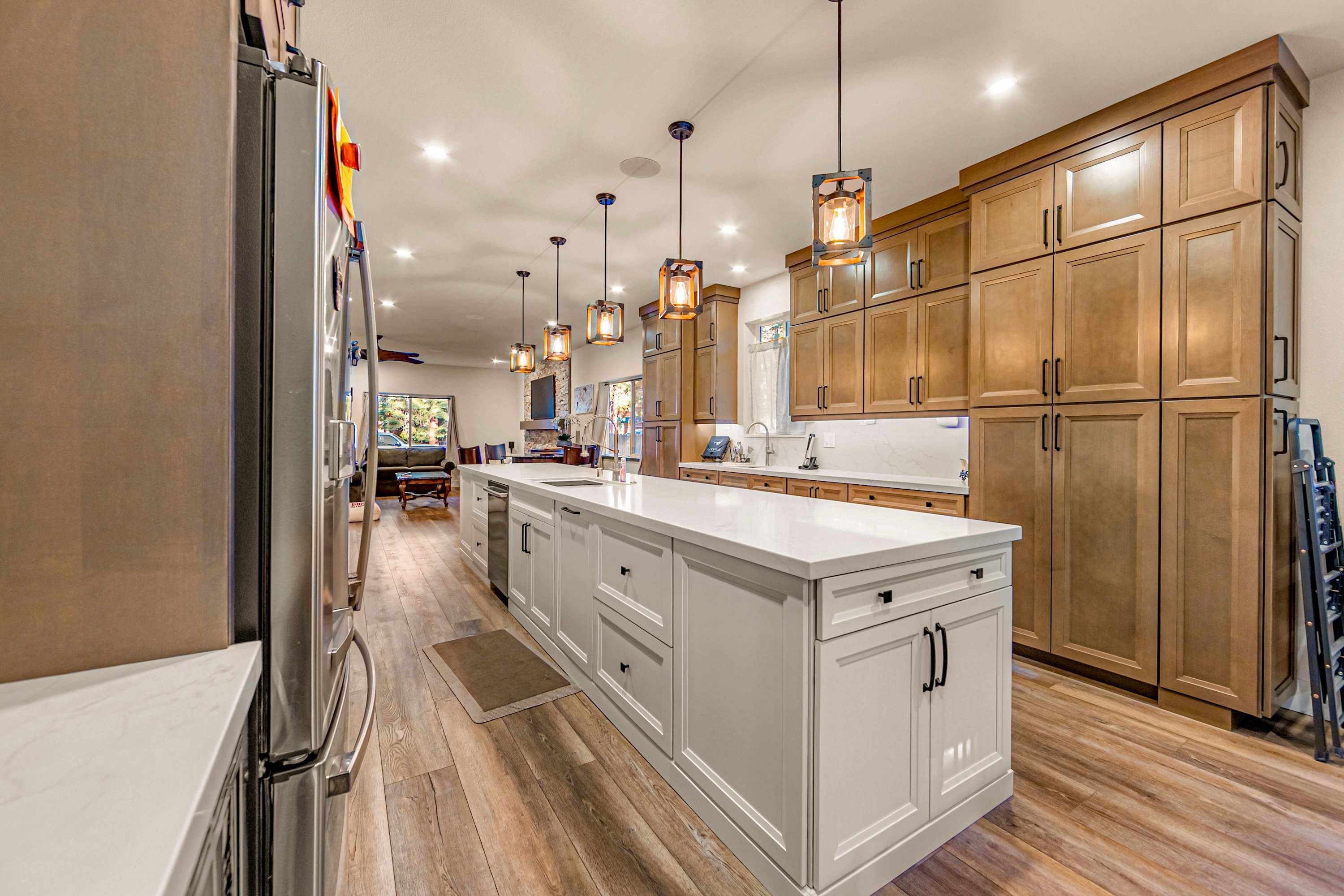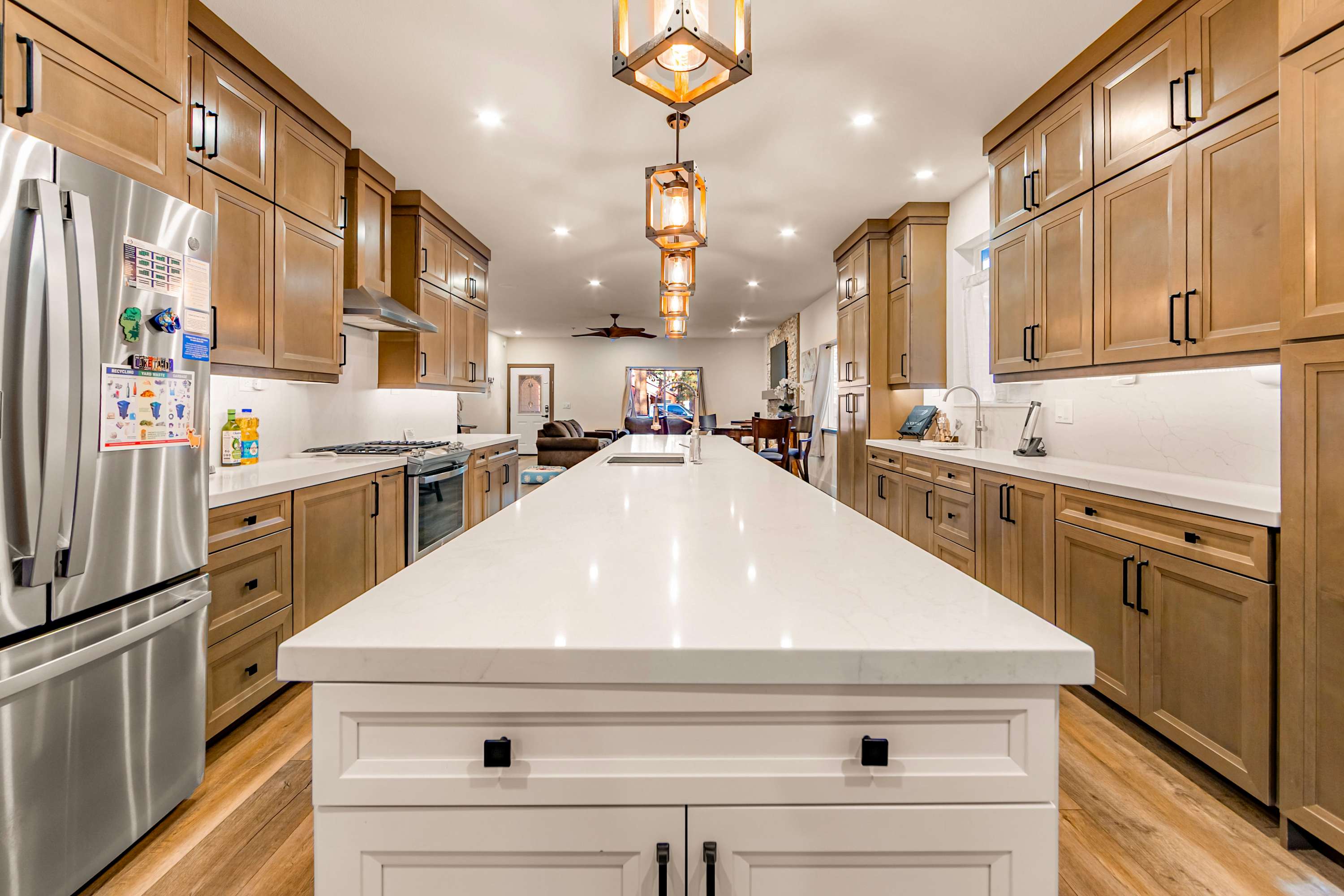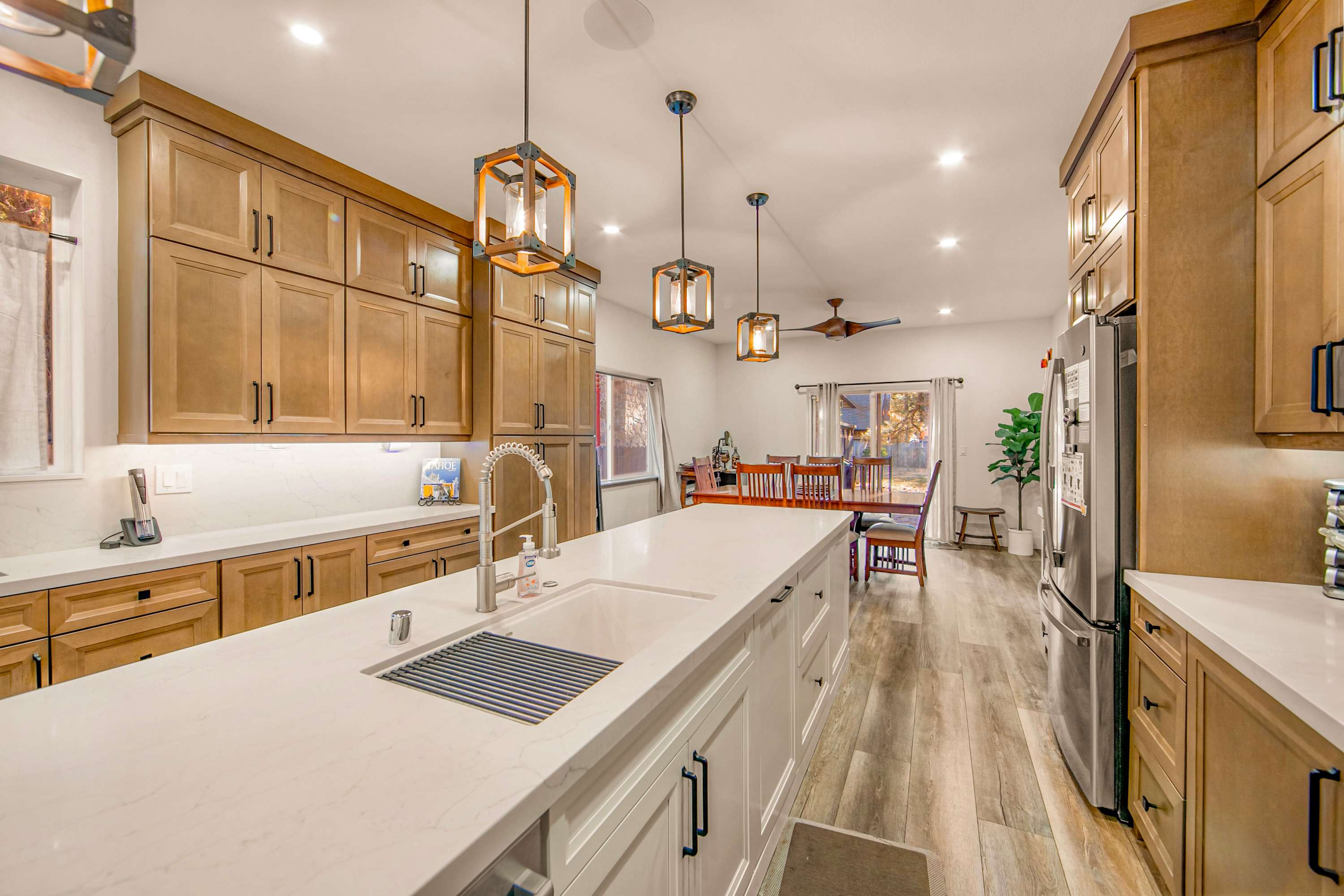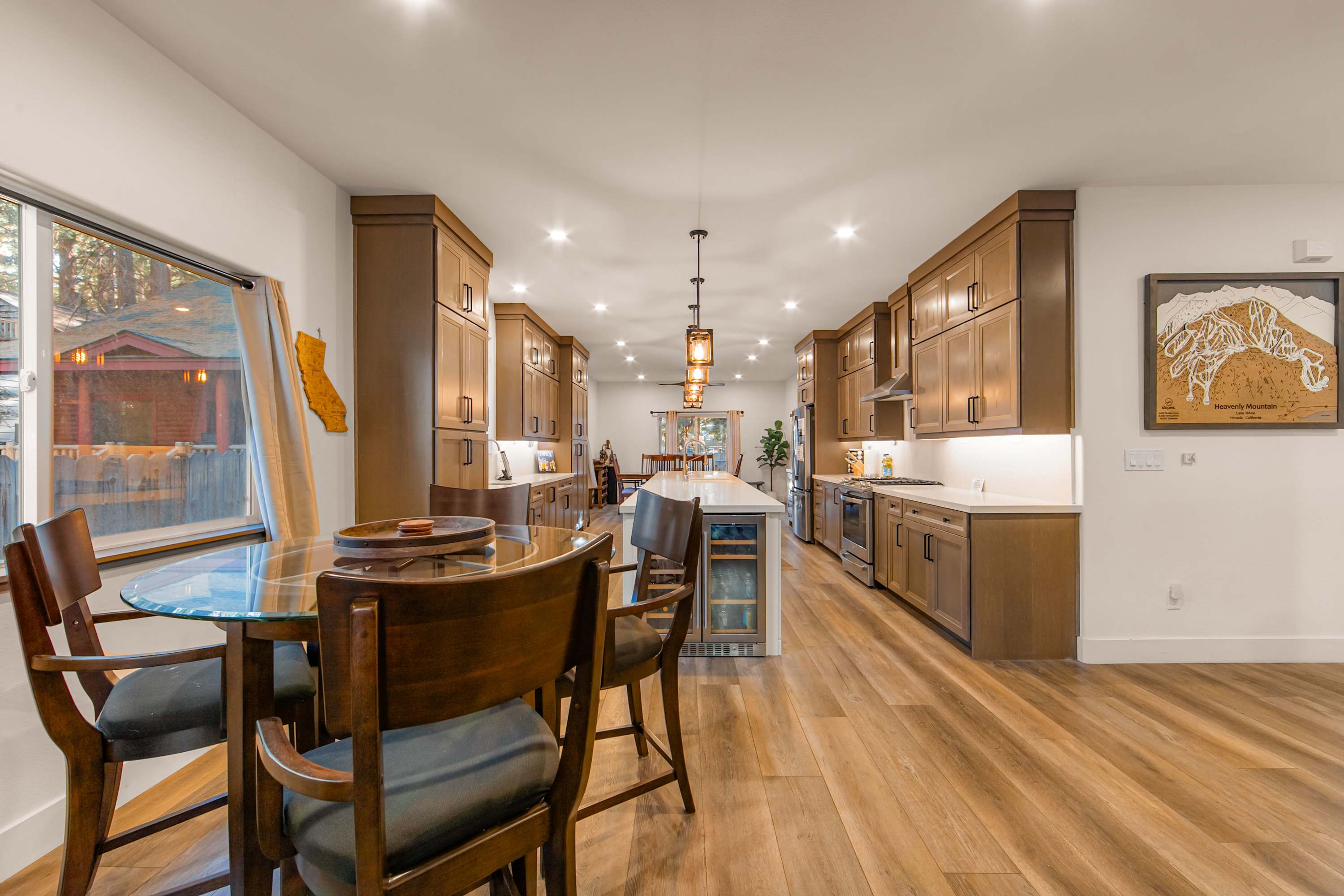 Step inside Tres Ositos and you’re welcomed by a warm, inviting living space where a plush couch and loveseat surround a cozy gas-burning fireplace—perfect for unwinding after a day outdoors while streaming your favorite shows on the smart TV. The home flows effortlessly into a large, open-concept kitchen designed to impress, featuring sophisticated finishes, top-of-the-line appliances, a double sink, wet bar, and a Nespresso machine for your morning routine. A spacious island with seating for five makes it easy to gather, while the adjacent dining table for six sets the stage for shared meals and memorable conversations.