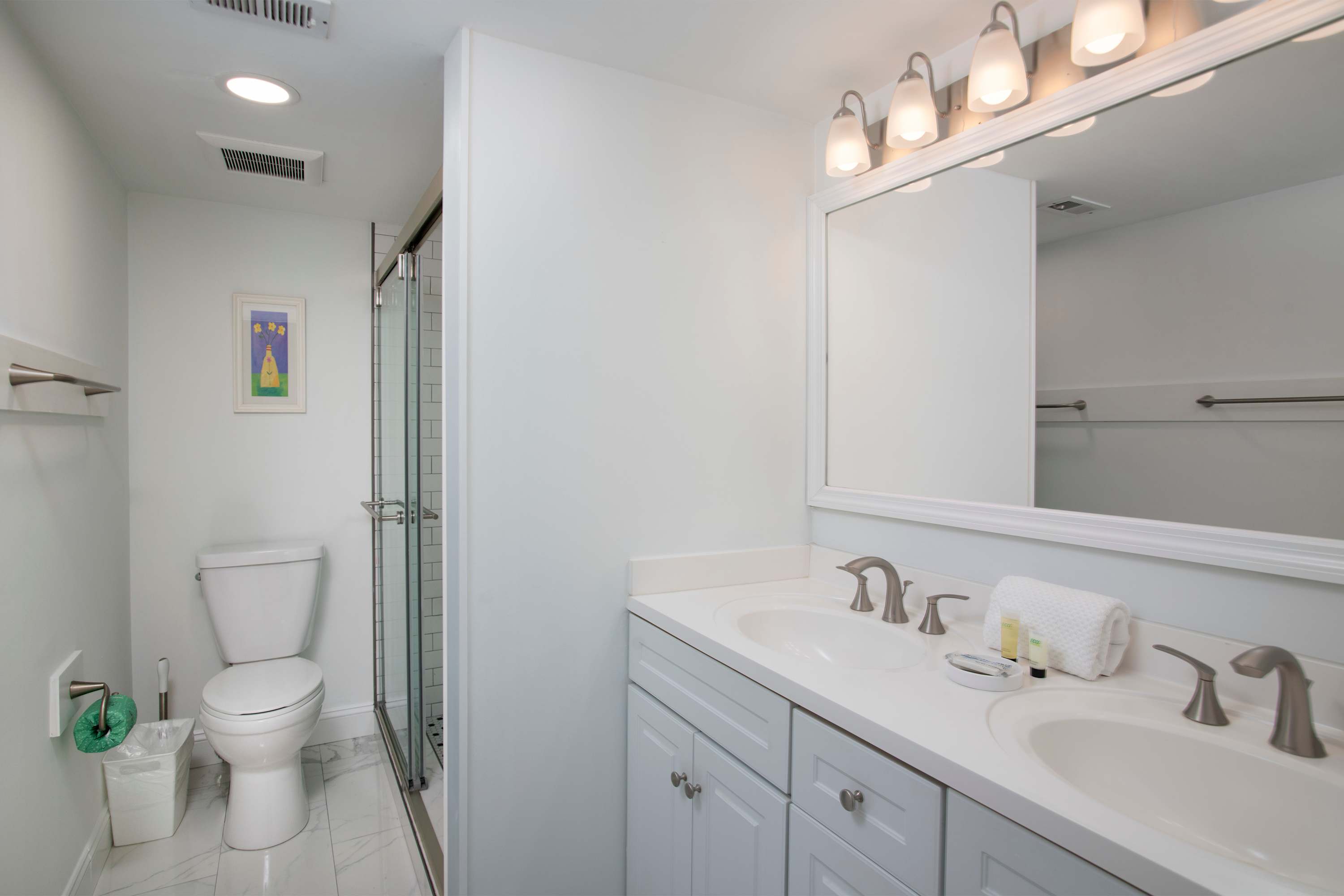 • Bedroom 1 (Primary): King bed, smart TV, sleeps 2; ensuite bathroom with dual vanity and walk-in shower