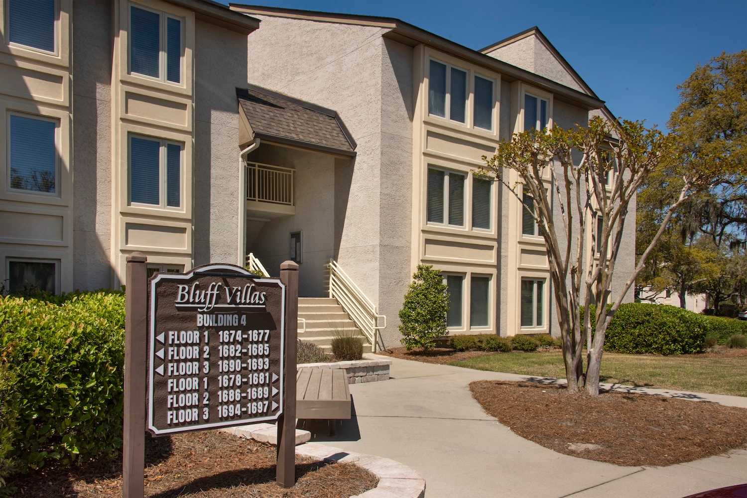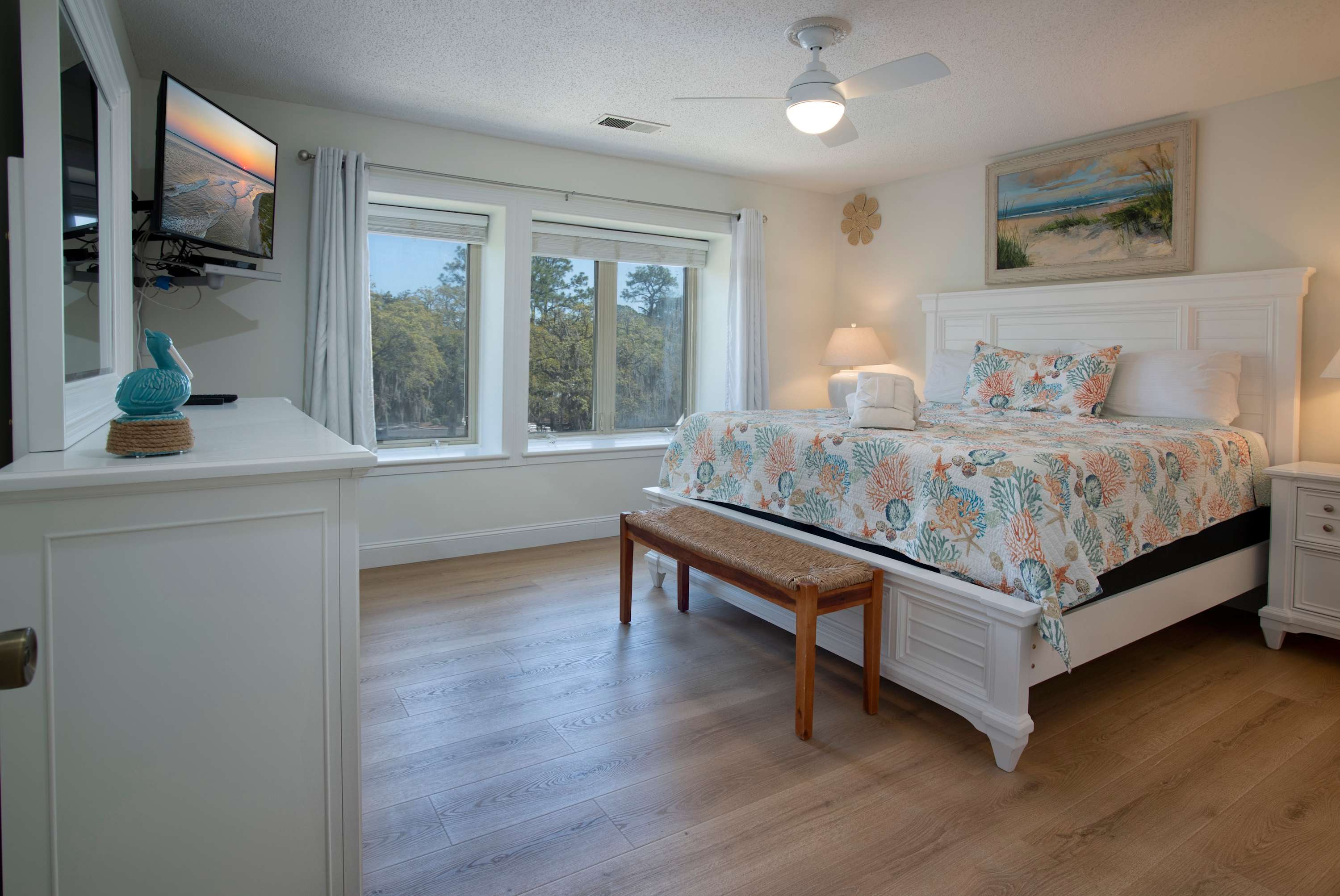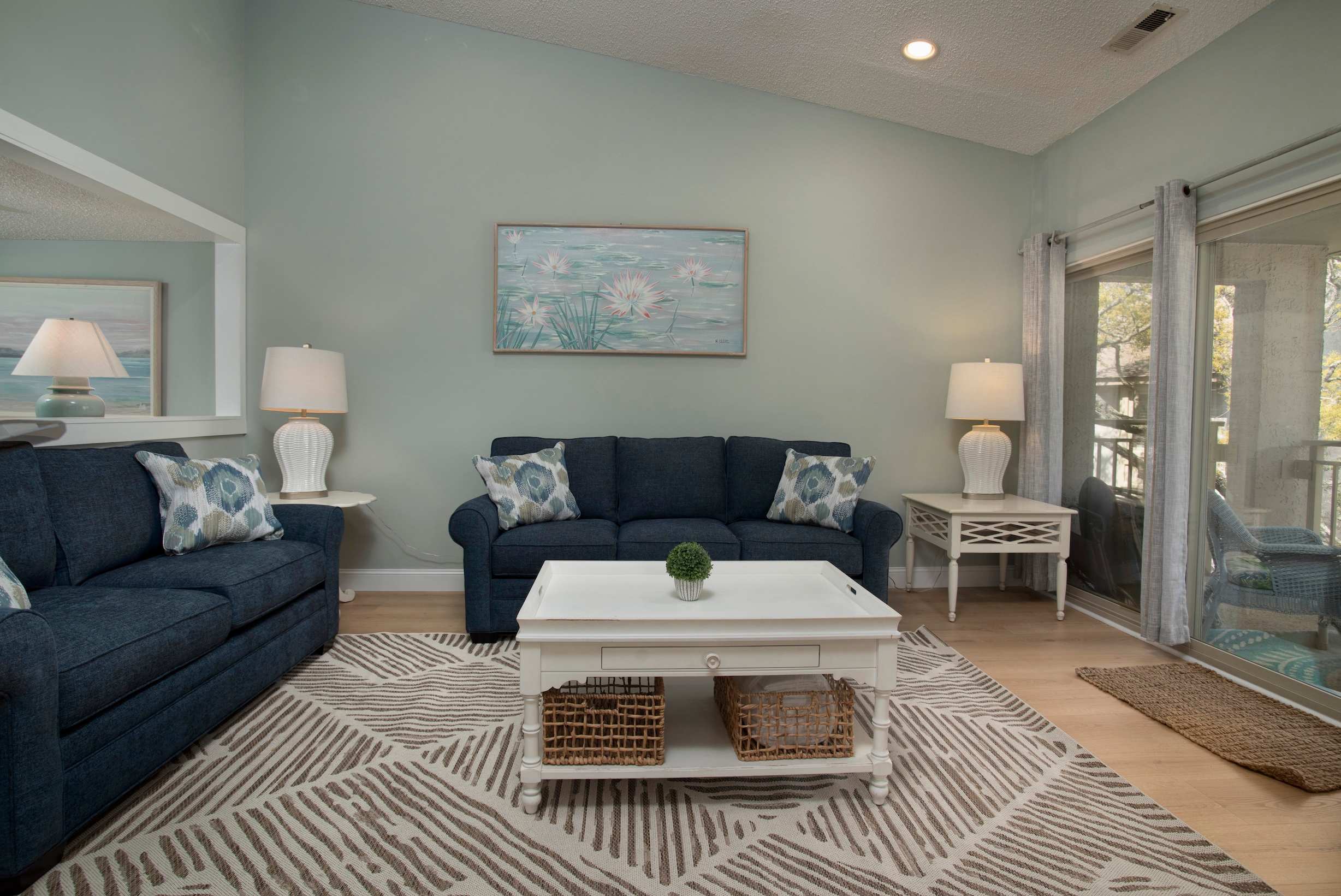 Settle into an open, inviting 3rd-floor villa with the largest 2-bedroom floor plan in Bluff Villas. The cathedral-ceiling living room offers a smart TV, a full-size sleeper sofa, and sliding doors to a private balcony with outdoor seating and a slight peek of Calibogue Sound.