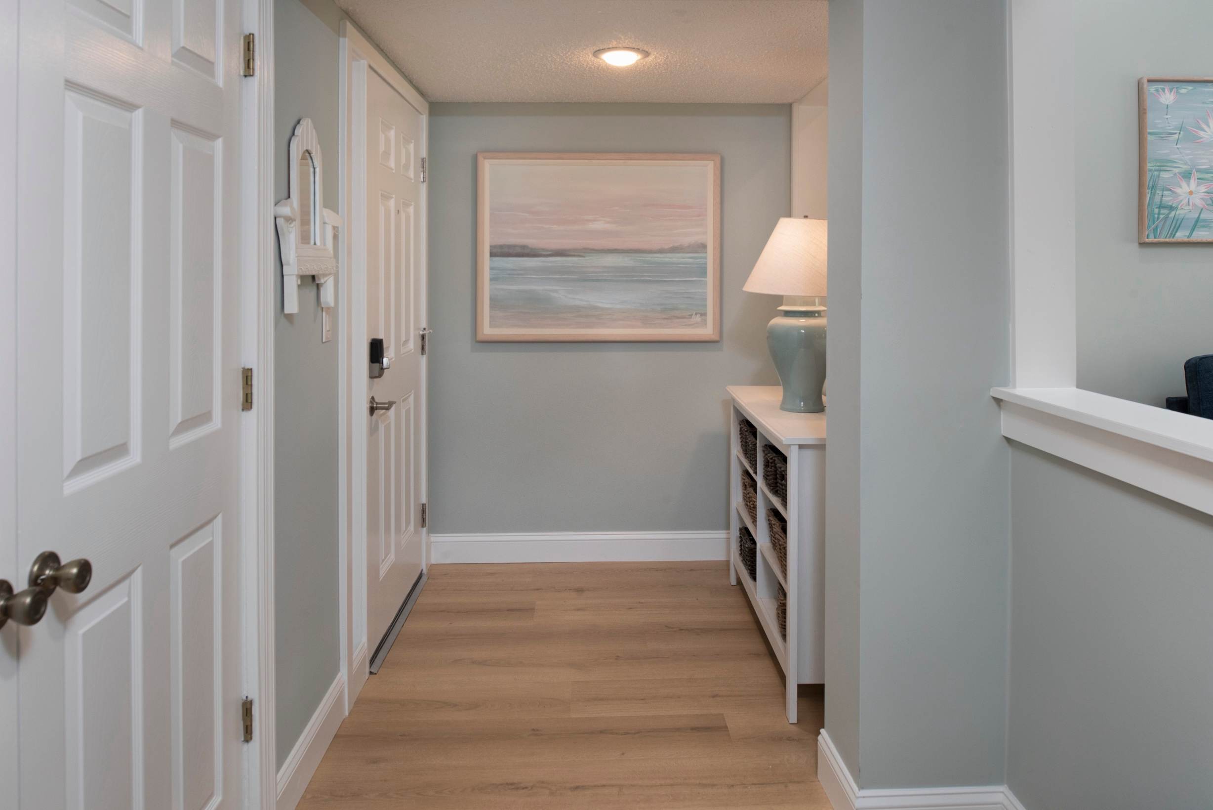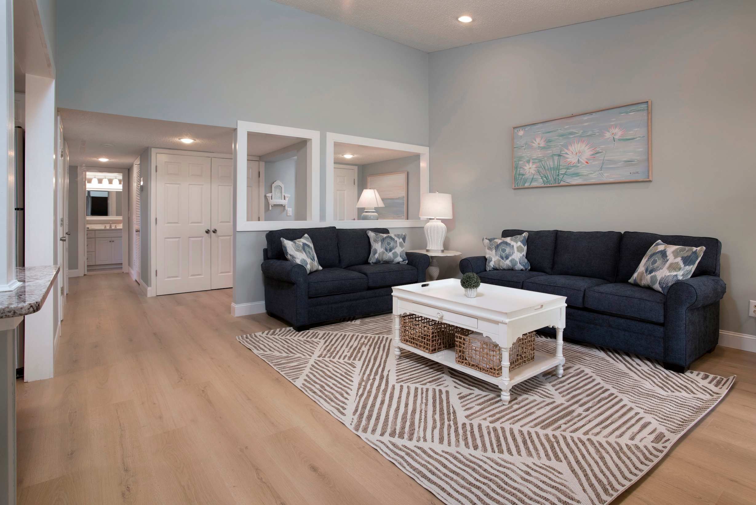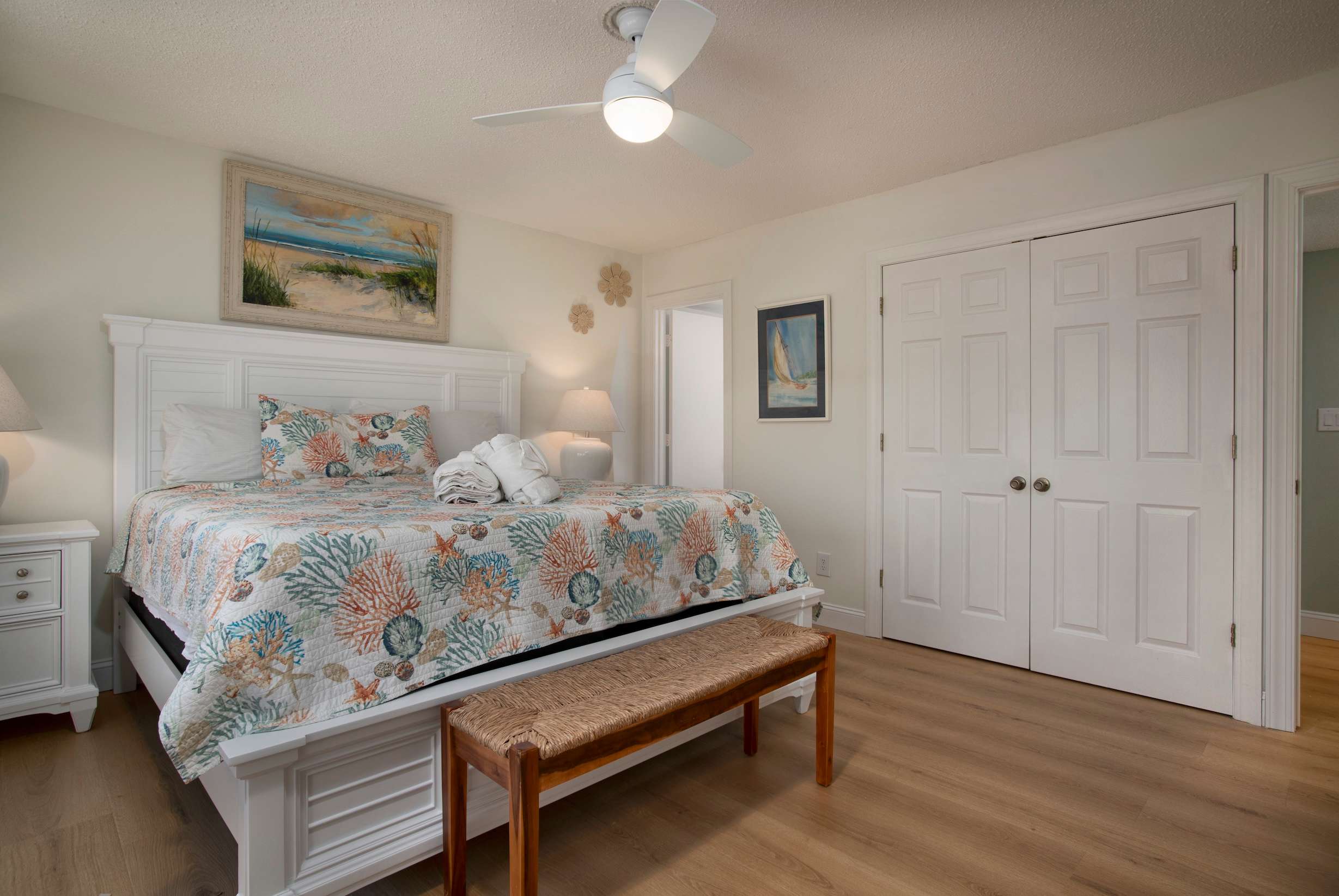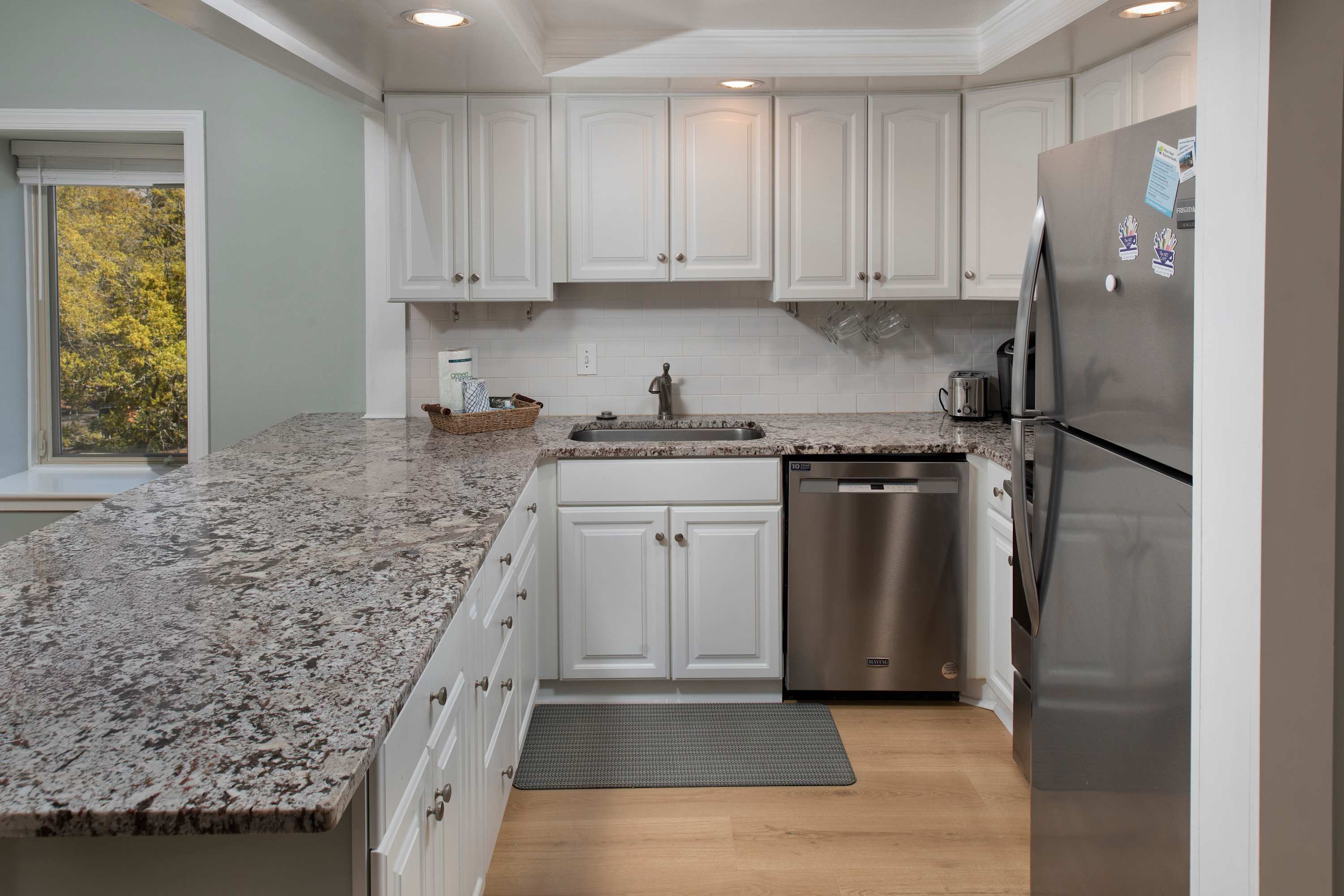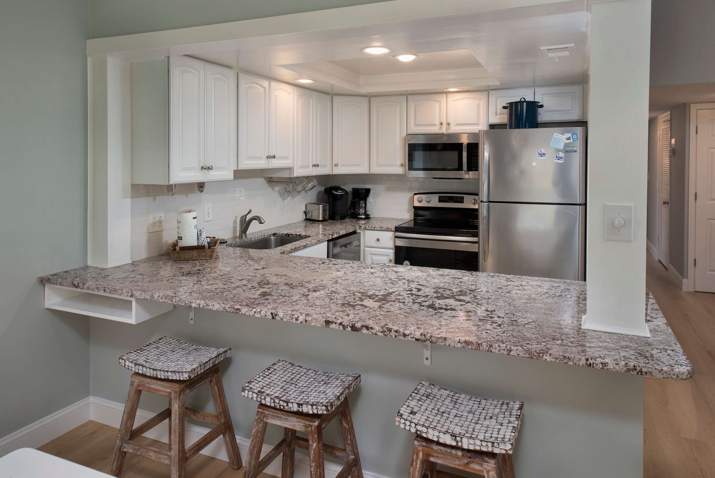 The kitchen is fully equipped with newer appliances, granite counters, a Keurig,drip coffee maker, and bar seating for three. Share meals at the dining table for six, then head out for a stroll to the marina or unwind on the balcony. When it’s time to turn in, two comfortable bedrooms and two full bathrooms make it easy for your group to spread out. A laundry closet with a washer and dryer off the foyer adds everyday convenience.