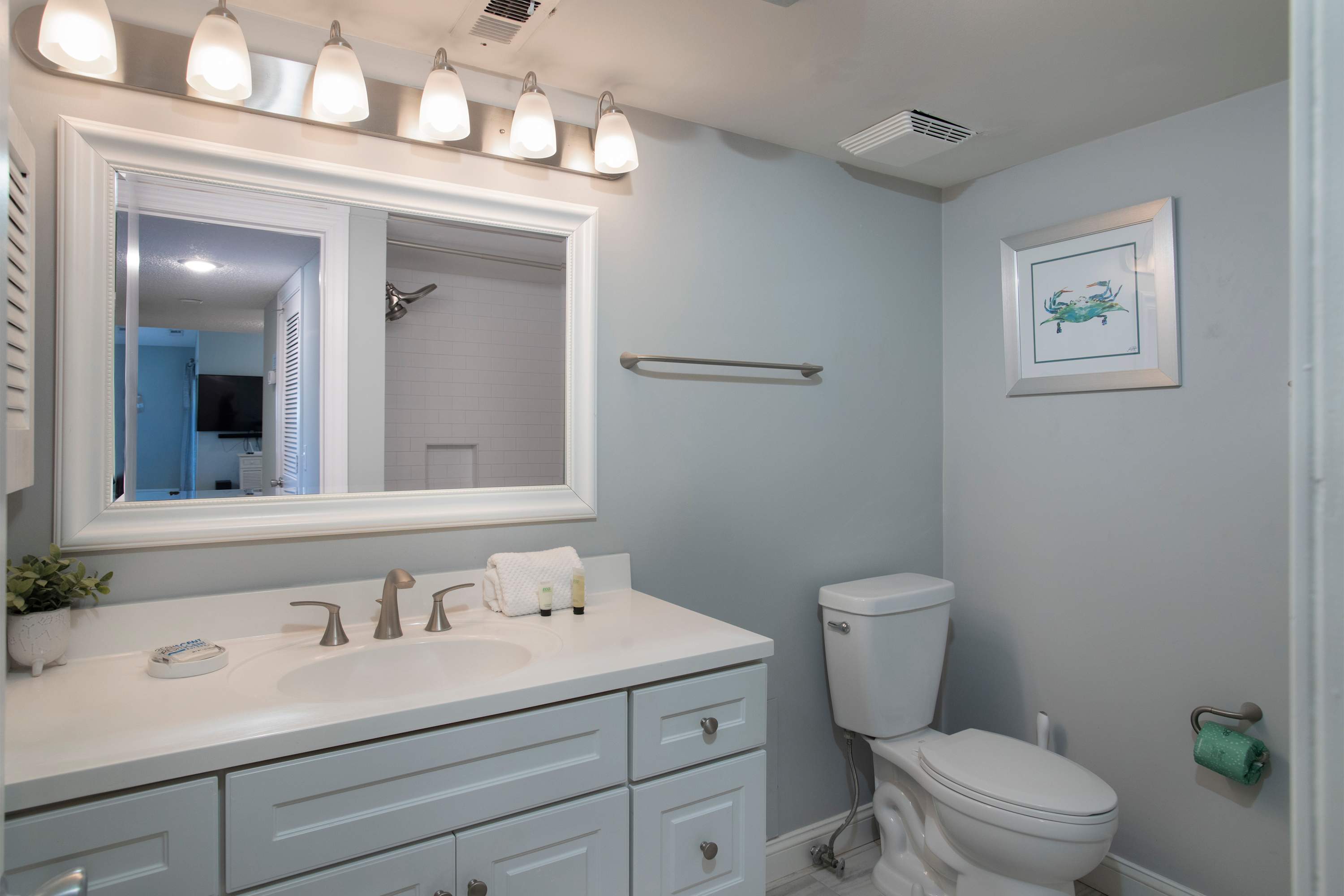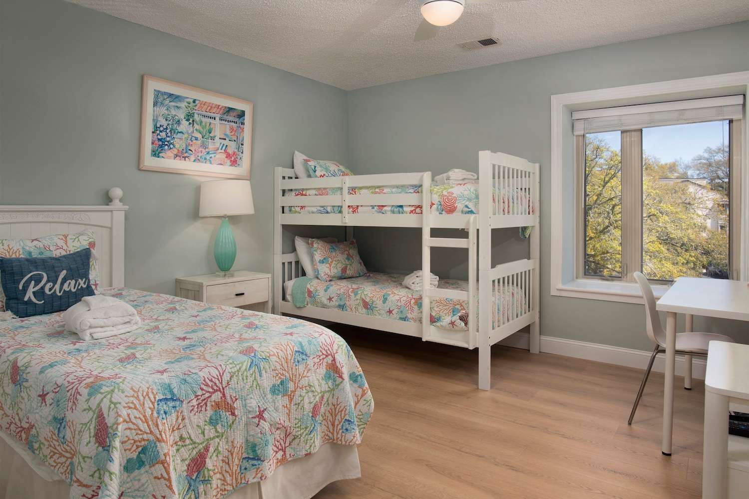 • Bedroom 2: Twin-over-twin bunk bed plus an additional twin bed, smart TV, desk; sleeps 3