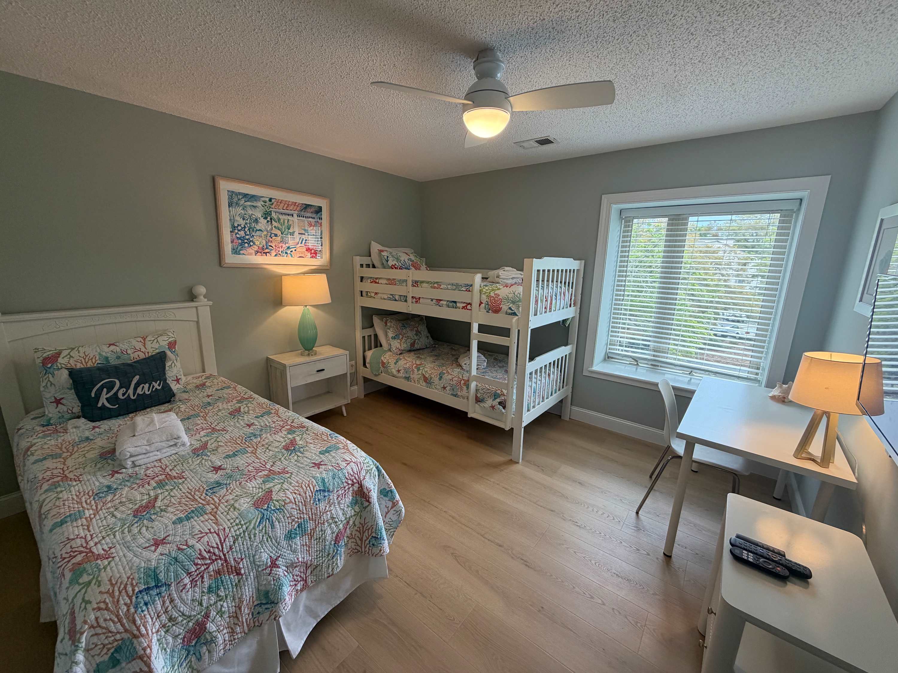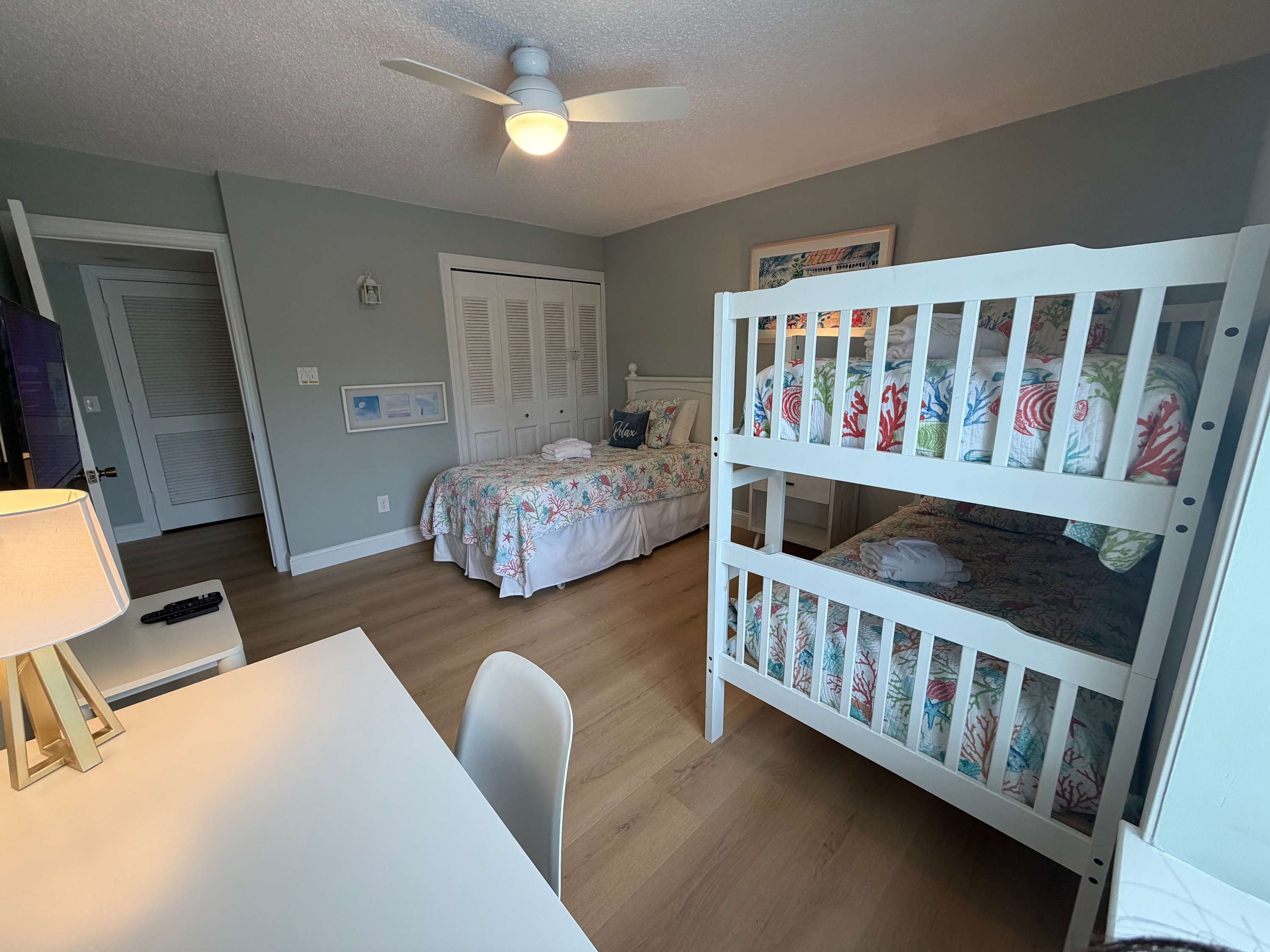 • Bedroom 2: Twin-over-twin bunk bed plus an additional twin bed, Smart TV, desk; sleeps 3