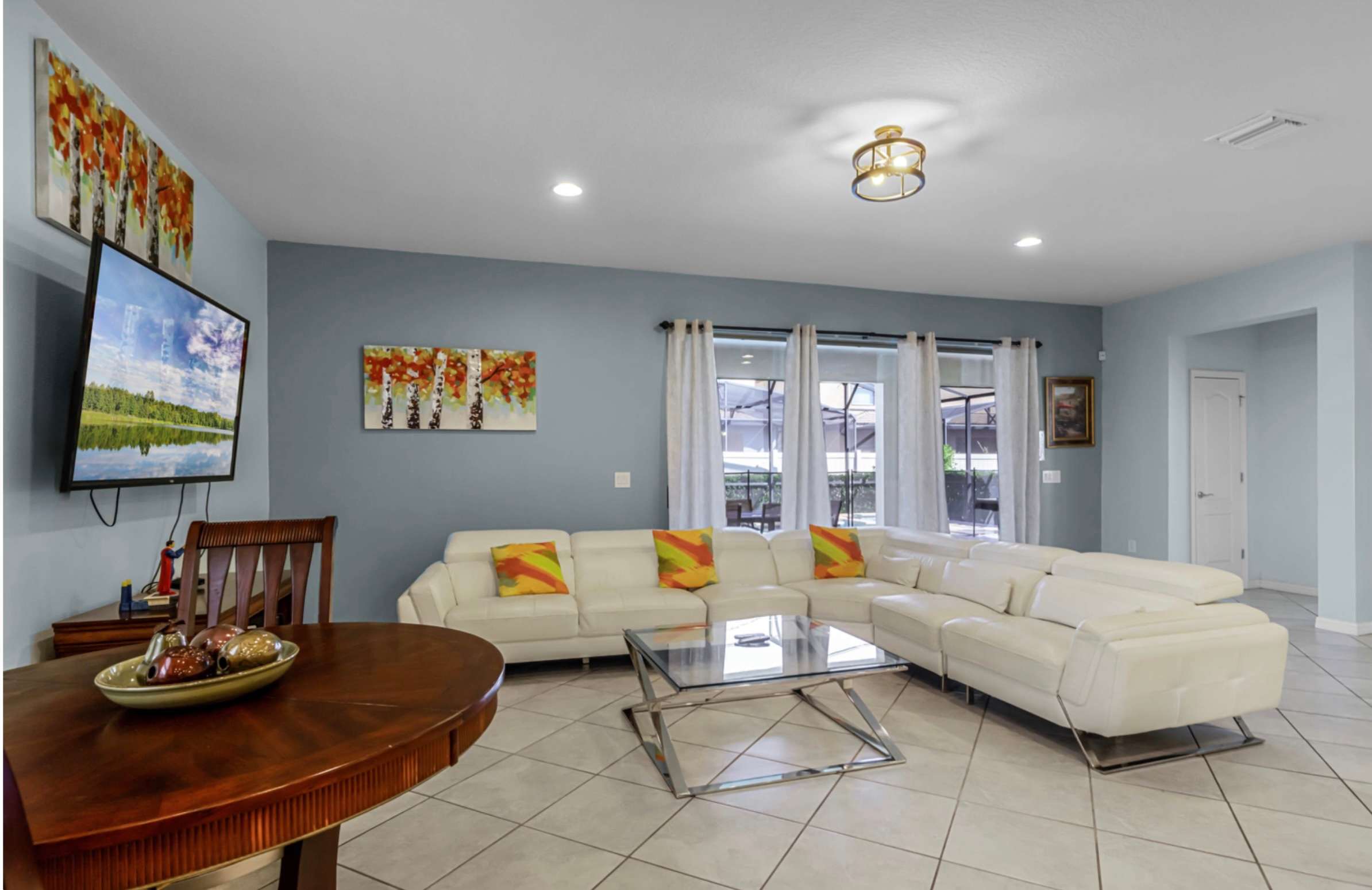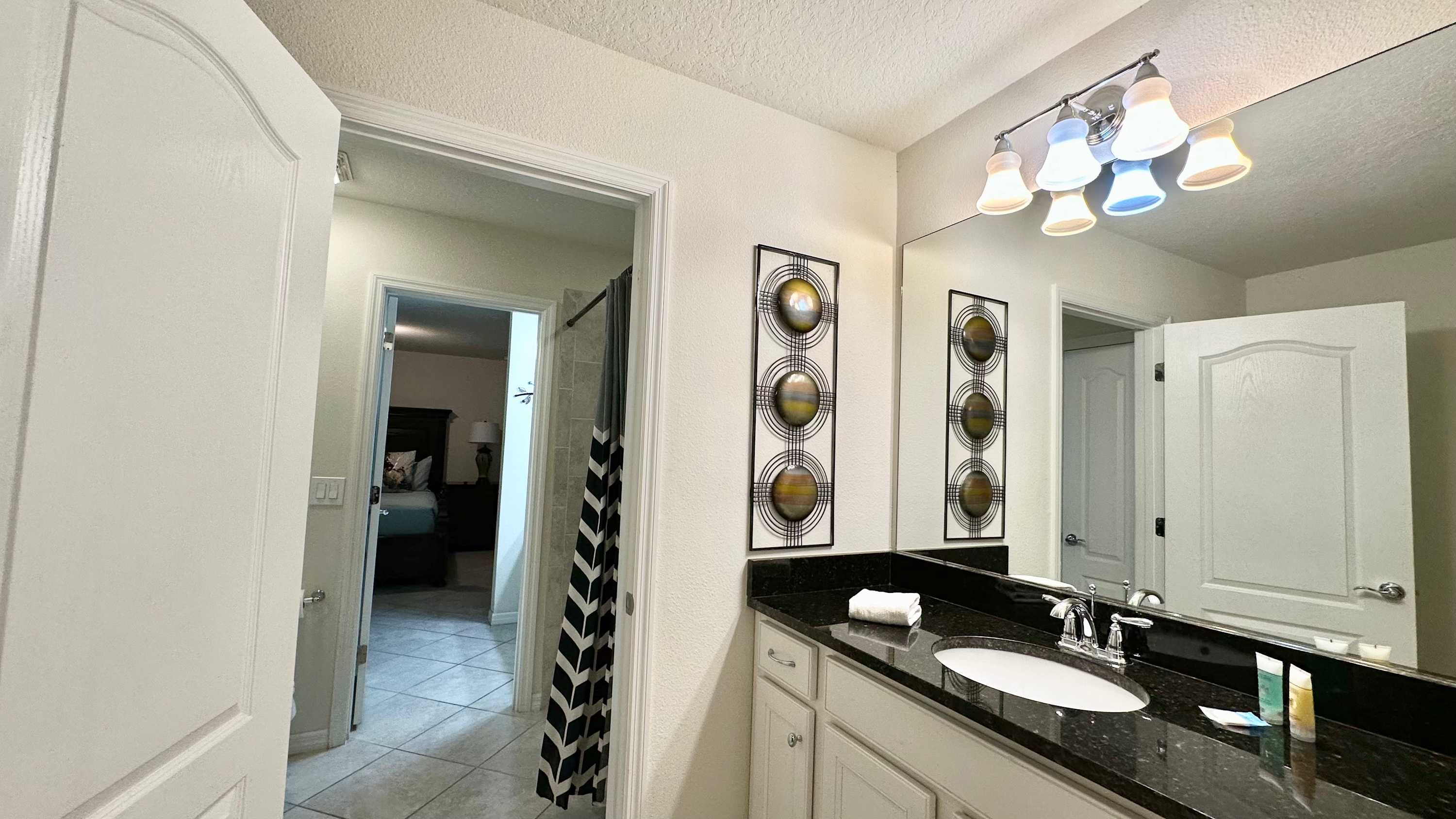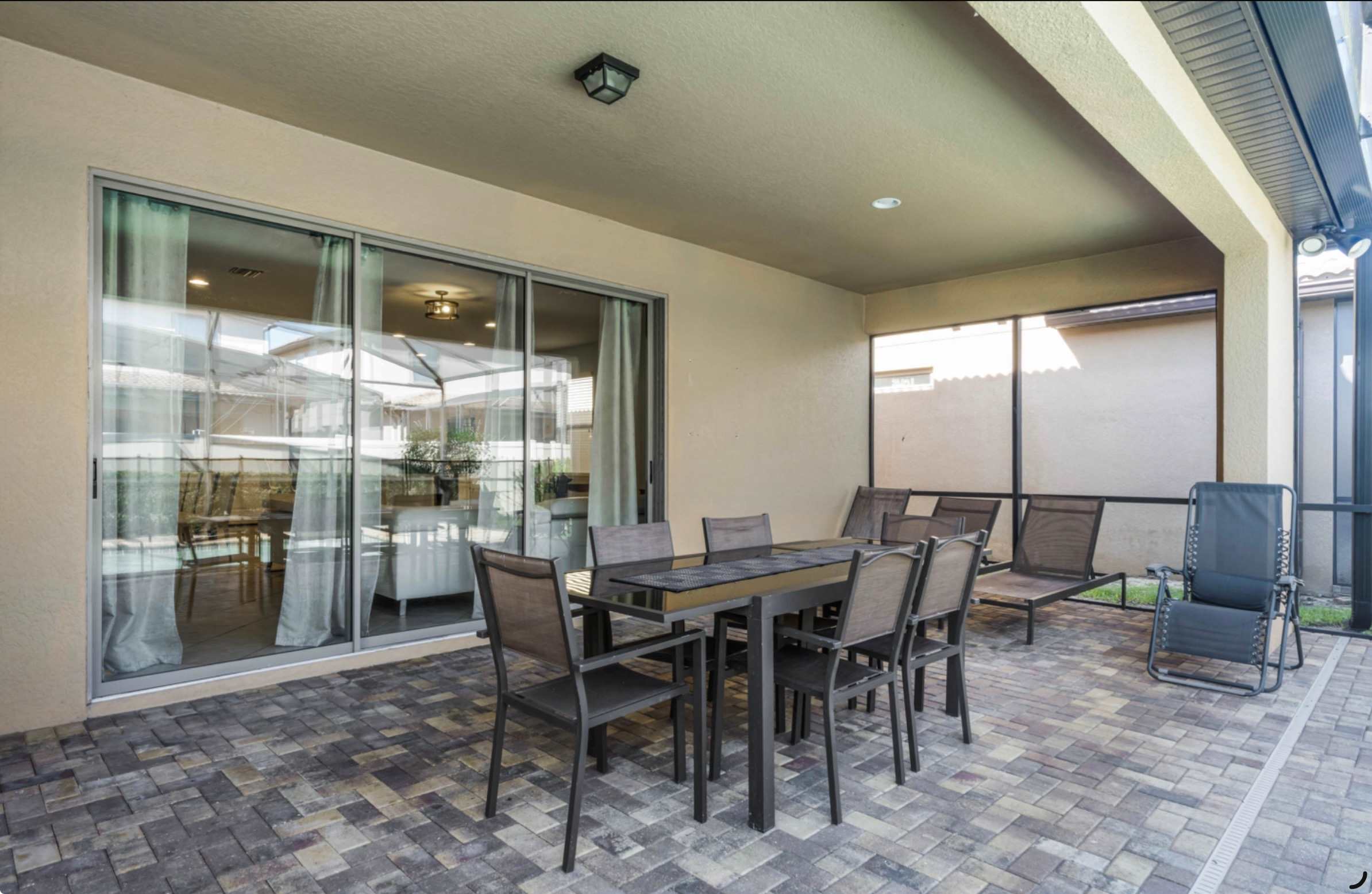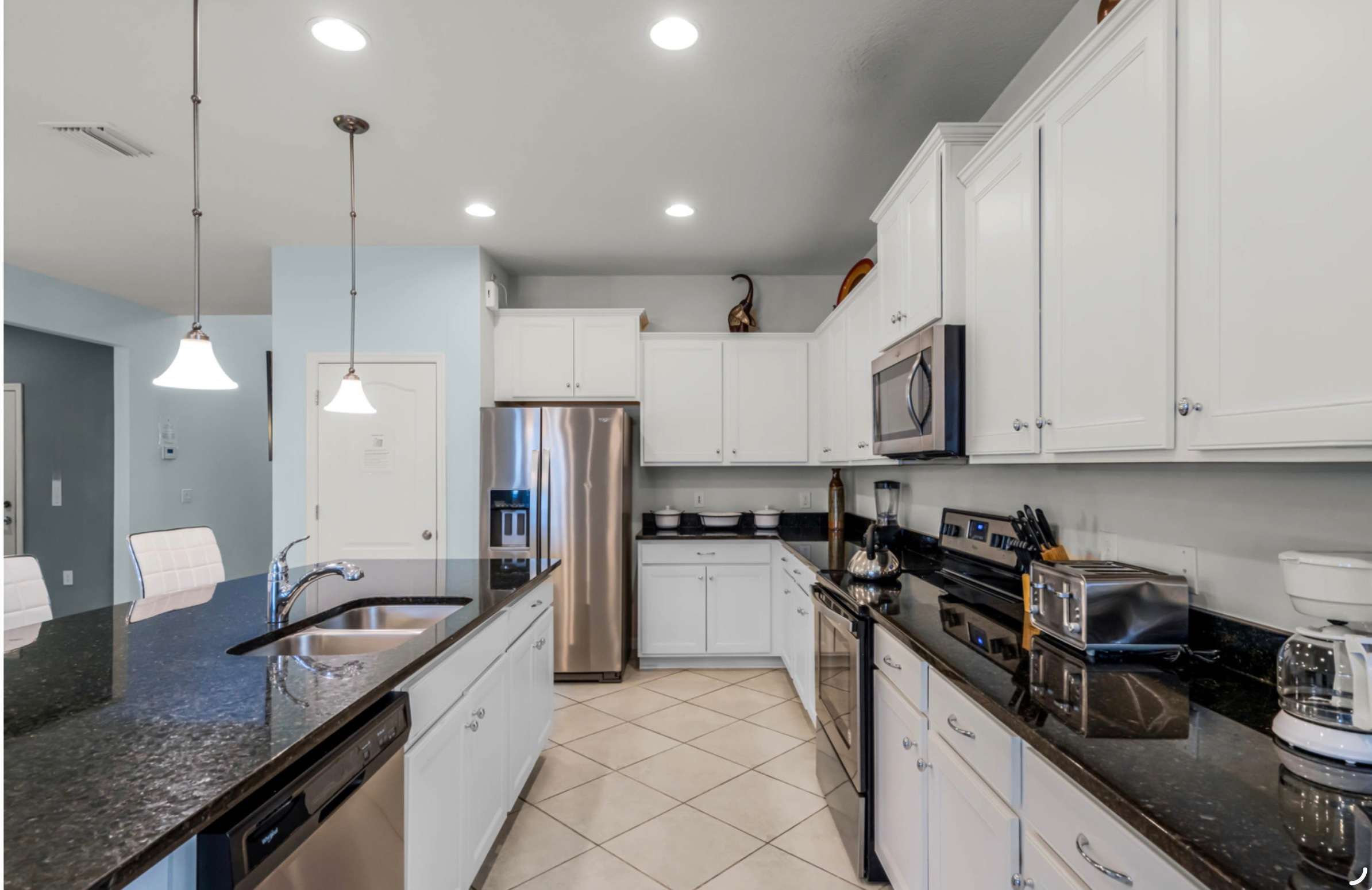 You’re welcomed by a thoughtfully designed entry featuring a mud room with built-in storage and bench seating—perfect for dropping off beach bags and theme park gear. The home opens into a bright, inviting living space where an L-shaped couch and smart TV create the ideal spot to unwind, with oversized sliding glass doors leading straight out to your private lanai. The kitchen is both stylish and functional, showcasing black granite countertops, stainless steel appliances, a cozy nook for two, and an oversized island with seating for three. Just beyond, a large dining table for 11 brings everyone together for memorable meals and late-night conversations.