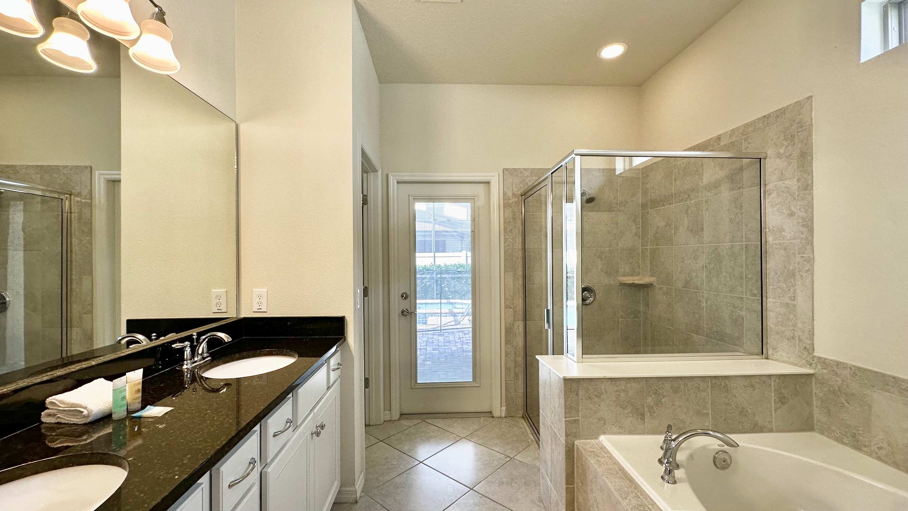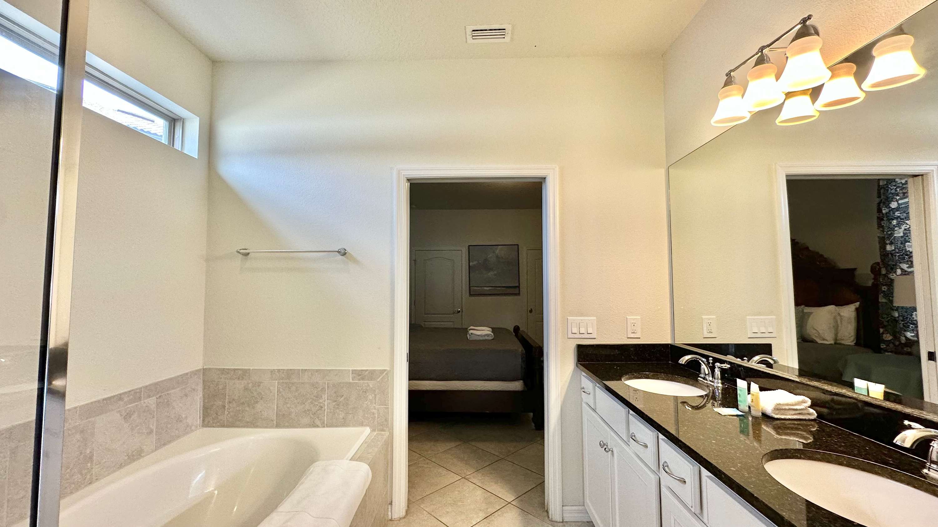 Bedroom #1 includes a king size bed, a smart TV also equipped with cable TV, patio access, and an ensuite bathroom with a dual vanity, a soaking tub, and a walk-in shower.