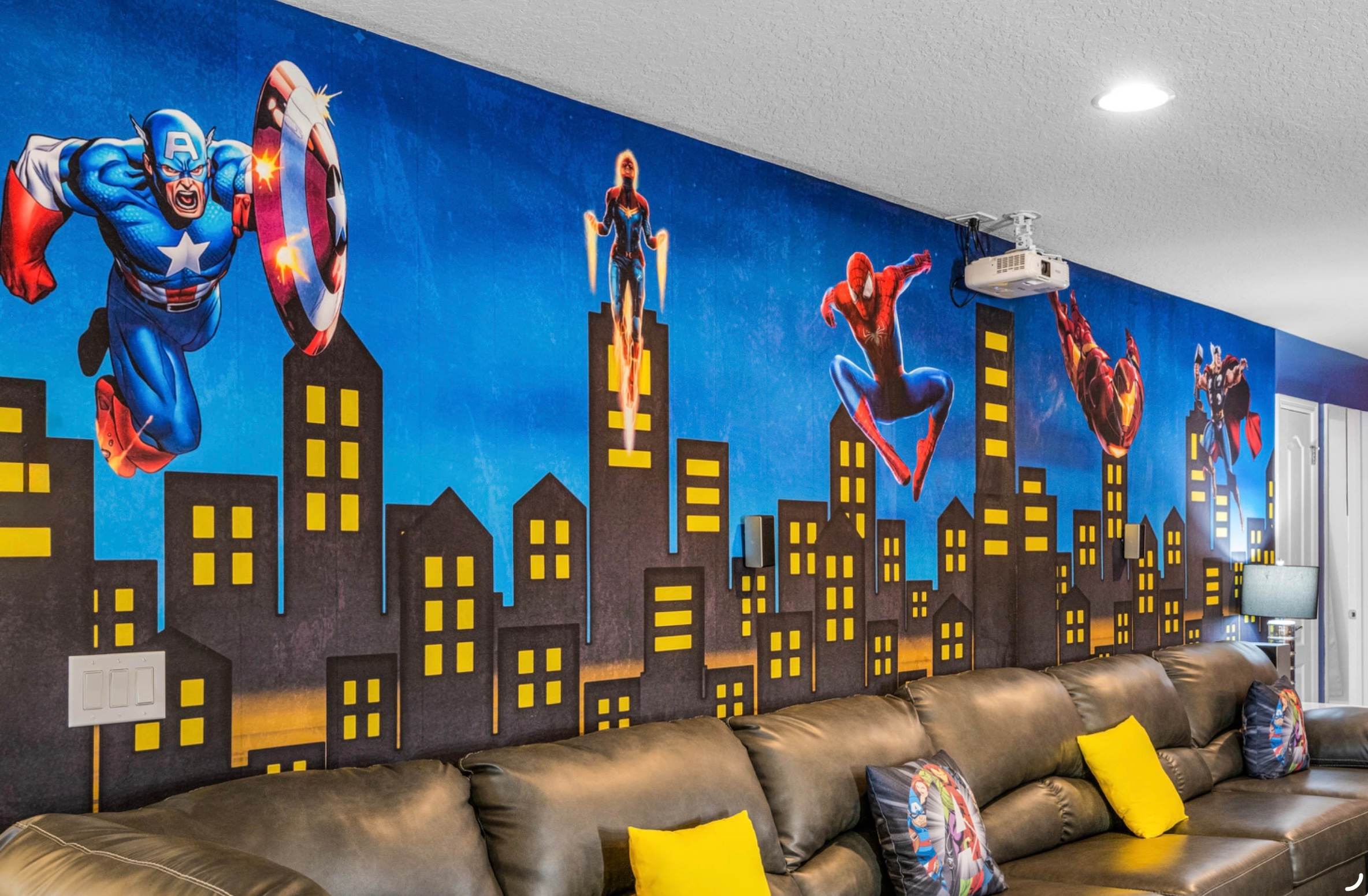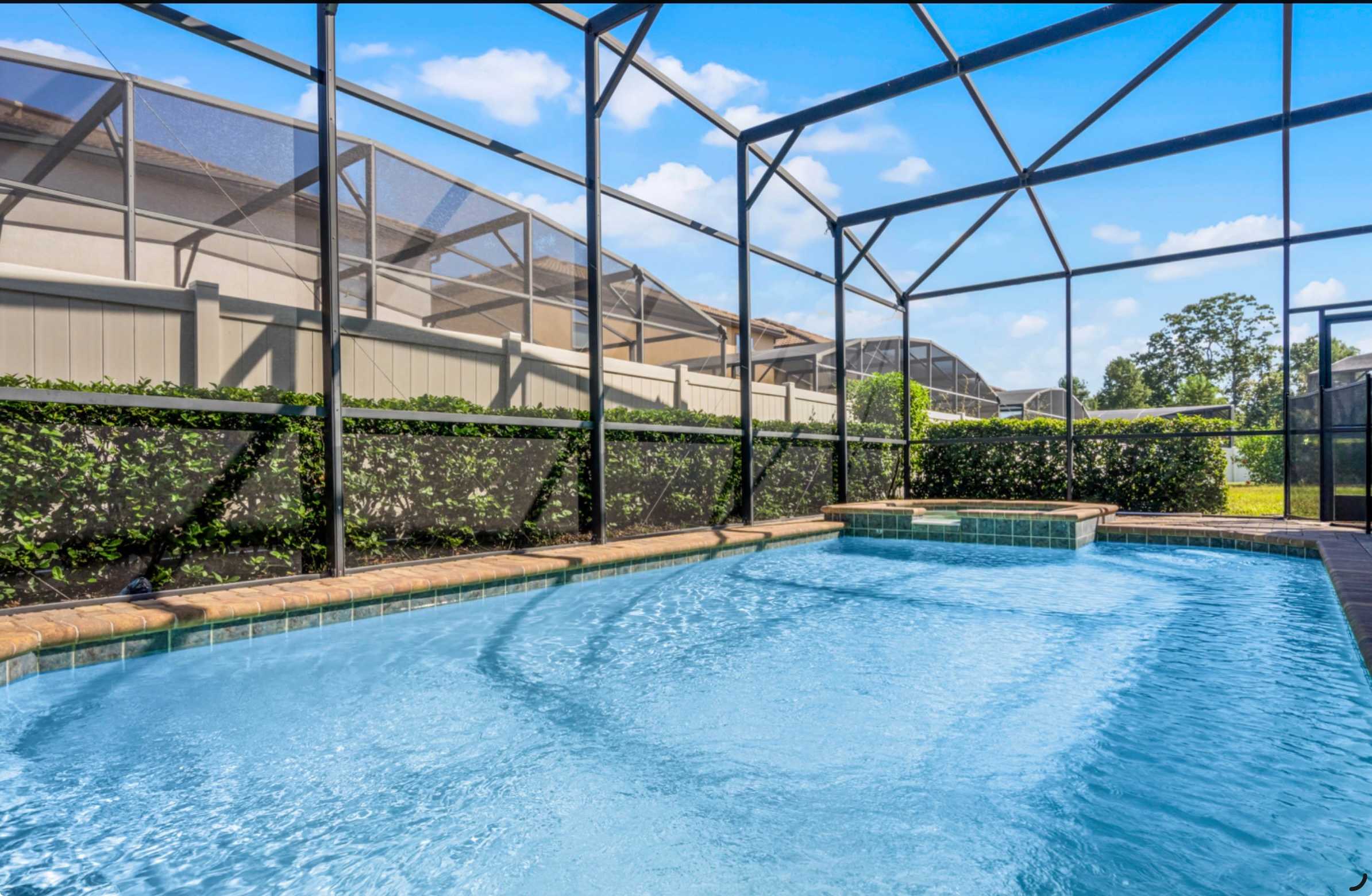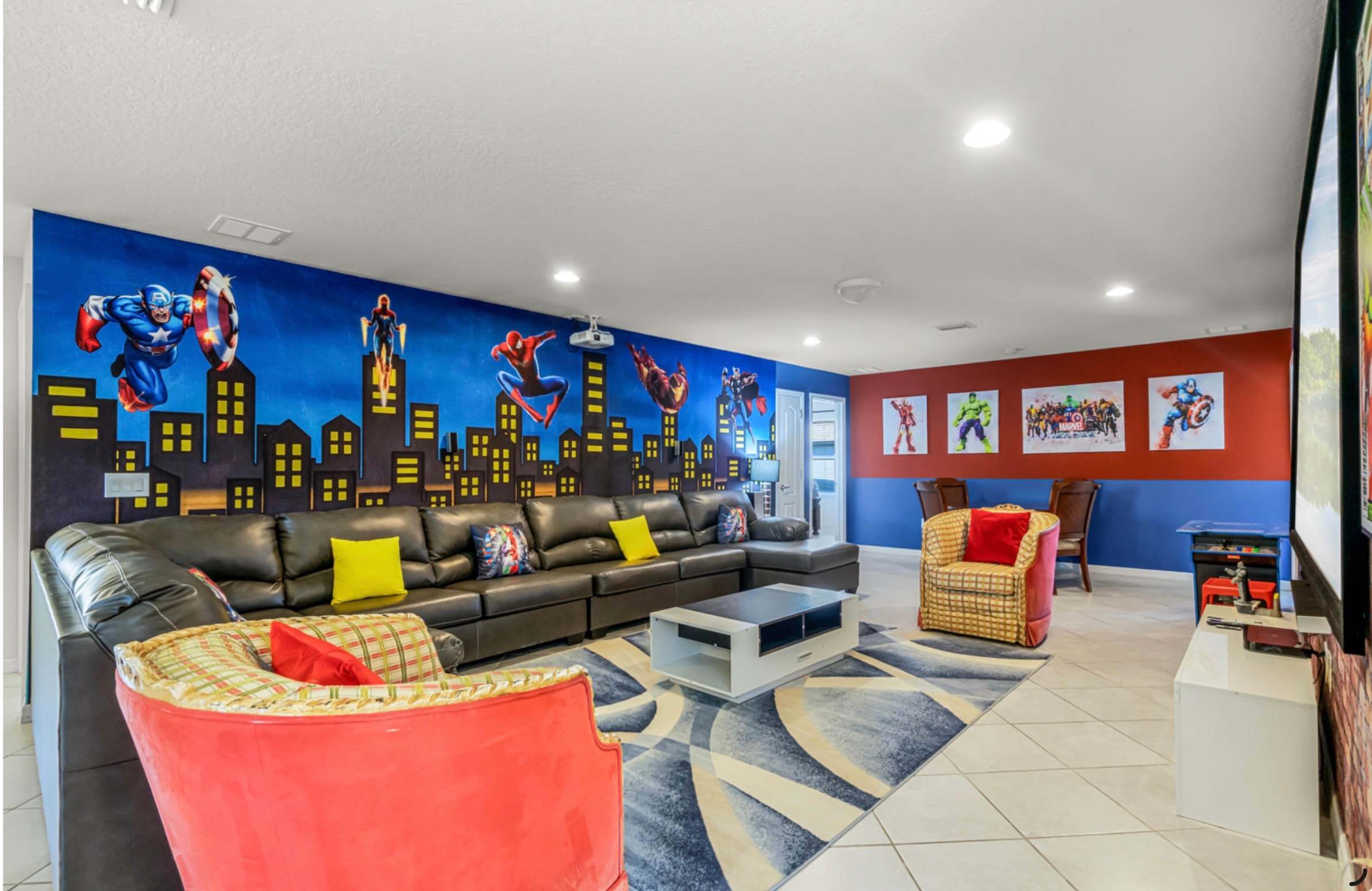 The fun continues throughout the home, starting with a fully loaded garage game room featuring air hockey, pool, foosball, and a high-top table for friendly competition. Upstairs, the loft transforms into an entertainment haven with a wraparound sofa, smart TV, Xbox streaming setup, dual sit-down arcade game, and bold Marvel-themed décor that adds an immersive, playful vibe. Outside, your private oasis awaits—an oversized, fully enclosed lanai with a sparkling pool and spa that overflows into the water, surrounded by a brick paver patio, dining table for six, and four chaise loungers. With added privacy fencing and open green space nearby, Legends Lounge at Windsor at Westside is the perfect blend of excitement, comfort, and laid-back Florida luxury.