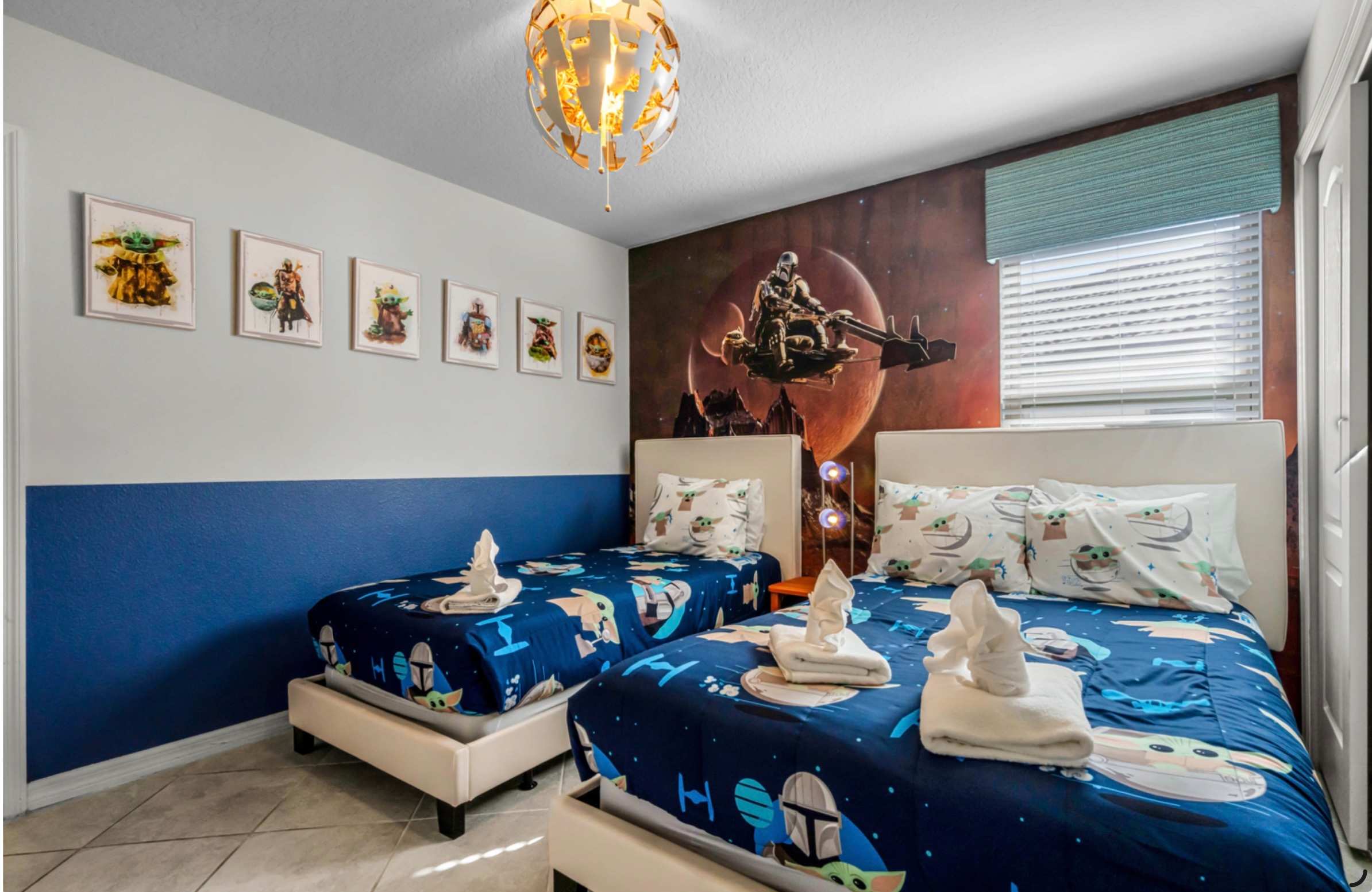 Bedroom #4 is Star Wars themed and includes a twin size bed, a full size bed, and a smart TV.