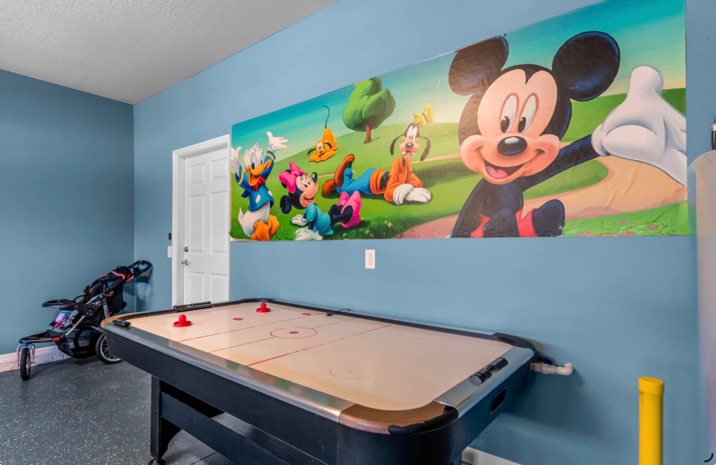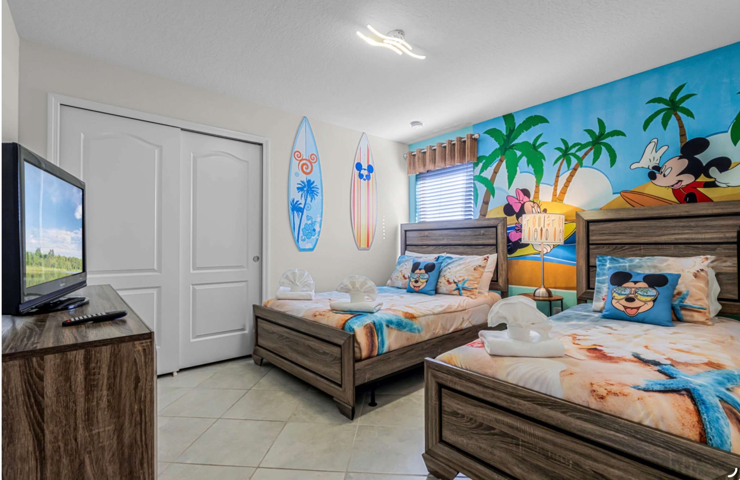 Bedroom #5 is Mickey themed and includes a twin size bed, a full size bed, and a smart TV also equipped with cable.