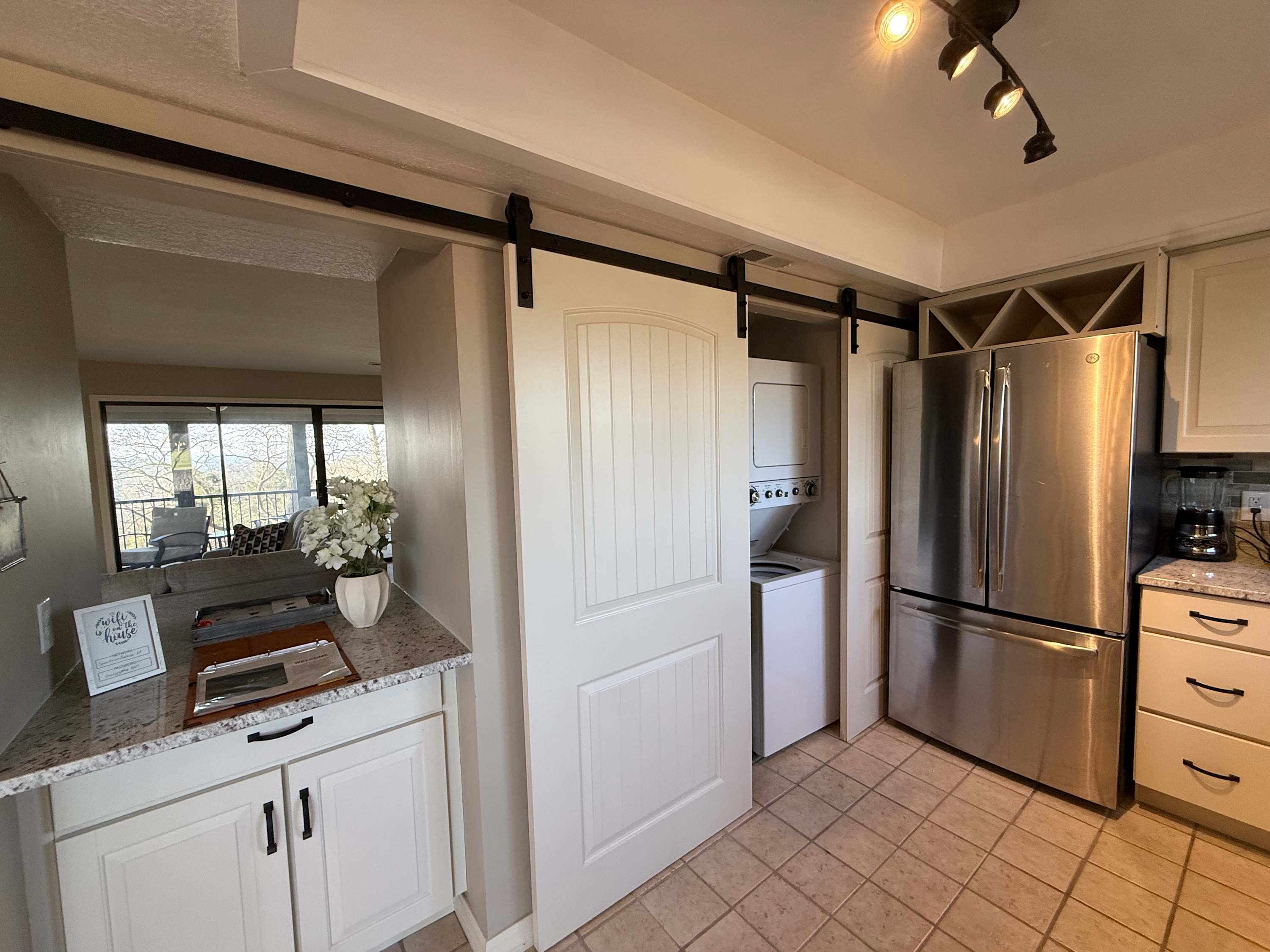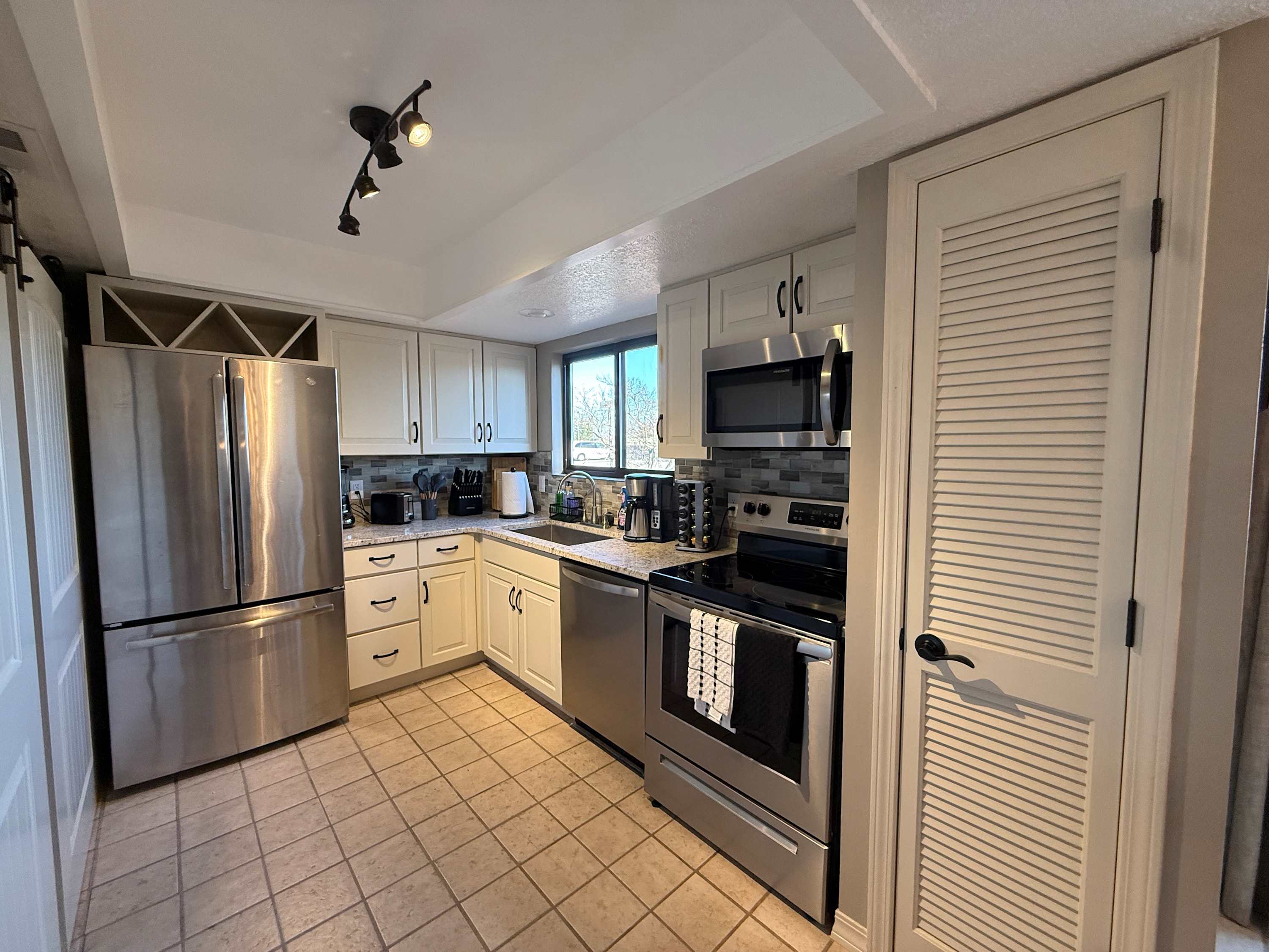 Step inside and discover a welcoming, open-concept space designed for comfort and connection. The living room invites you to unwind with an L-shaped couch featuring a chaise lounge, a smart TV, and board games for laid-back evenings in. The fully equipped kitchen showcases stainless steel appliances and stone countertops, flowing seamlessly into a dining area with seating for six—perfect for shared meals and conversation. Step out onto your private, spacious balcony where comfortable seating creates the ideal spot to sip your morning coffee or relax after a day on the water, taking in the peaceful surroundings that make this getaway truly special.