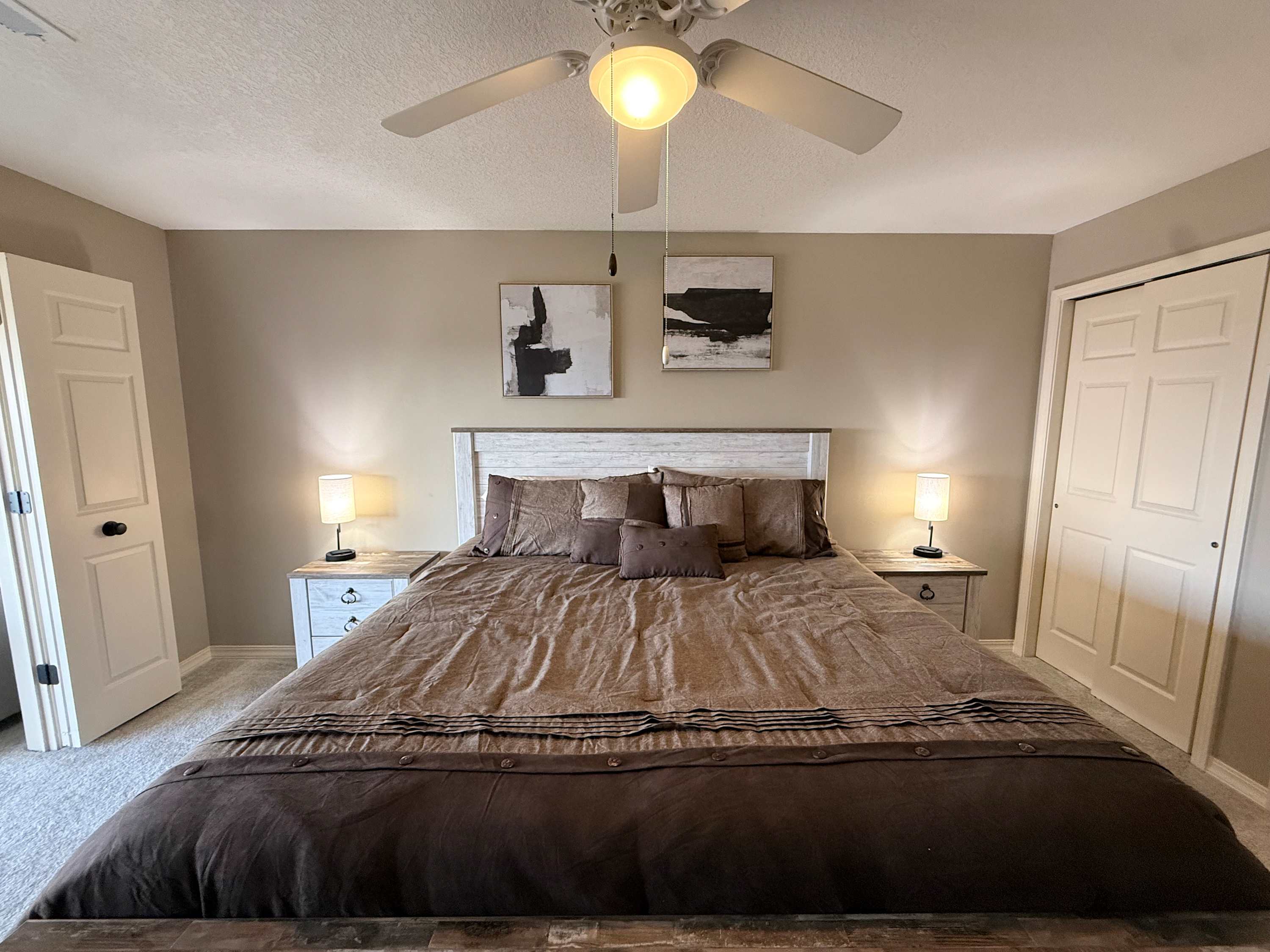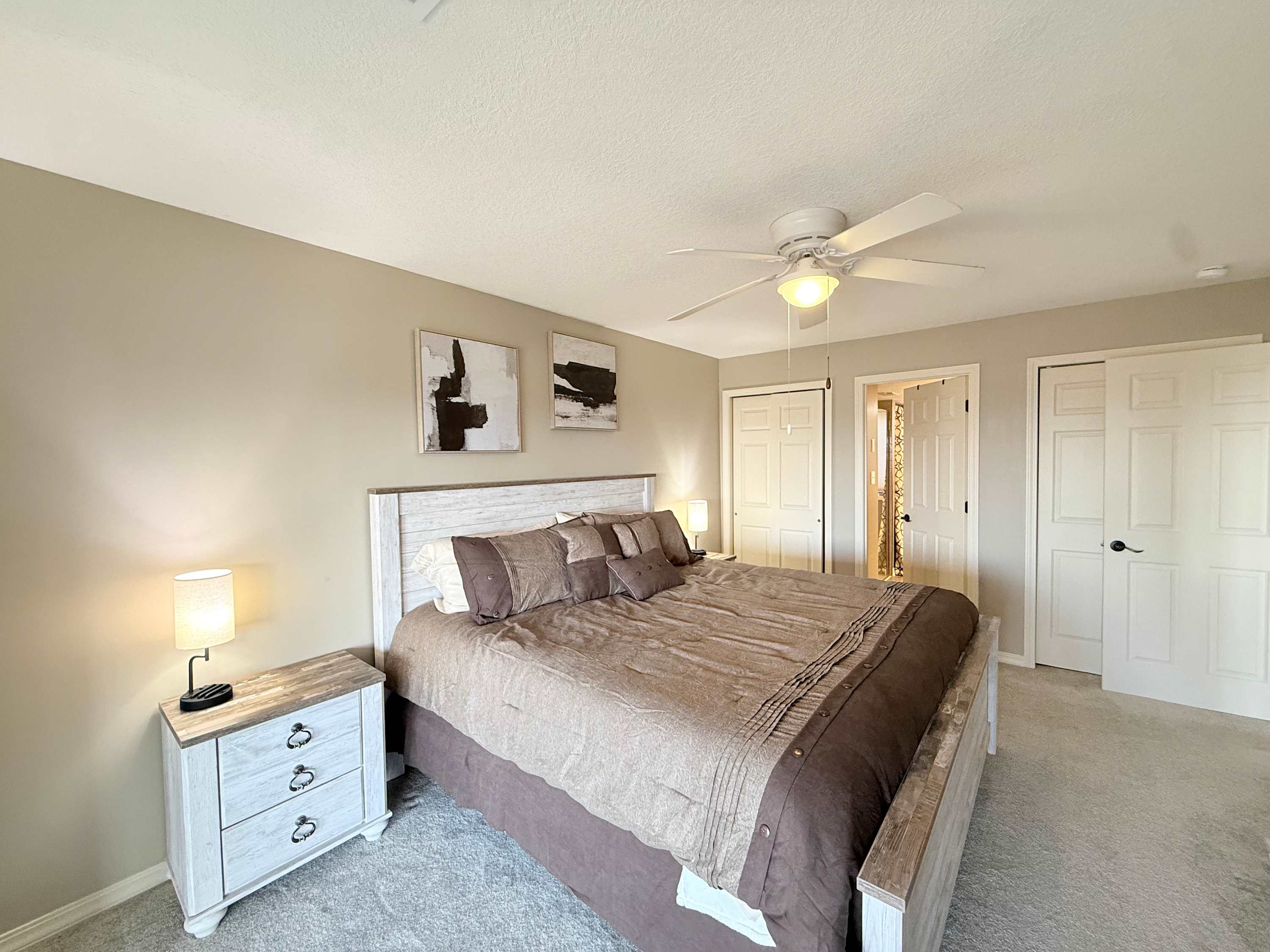 Bedroom #1 includes a king size bed, a sitting area, and an ensuite bathroom with a dual vanity and a walk-in shower.