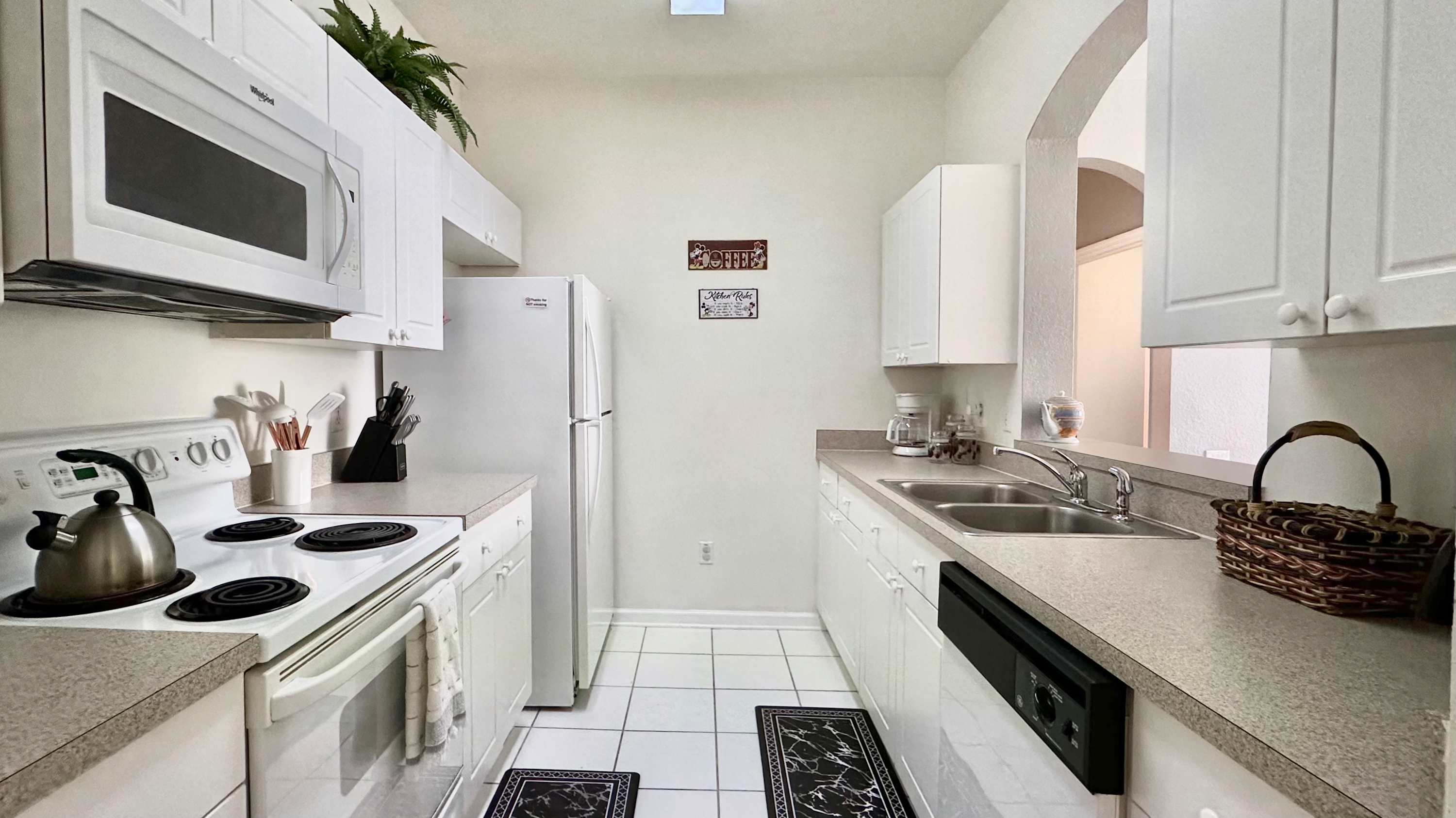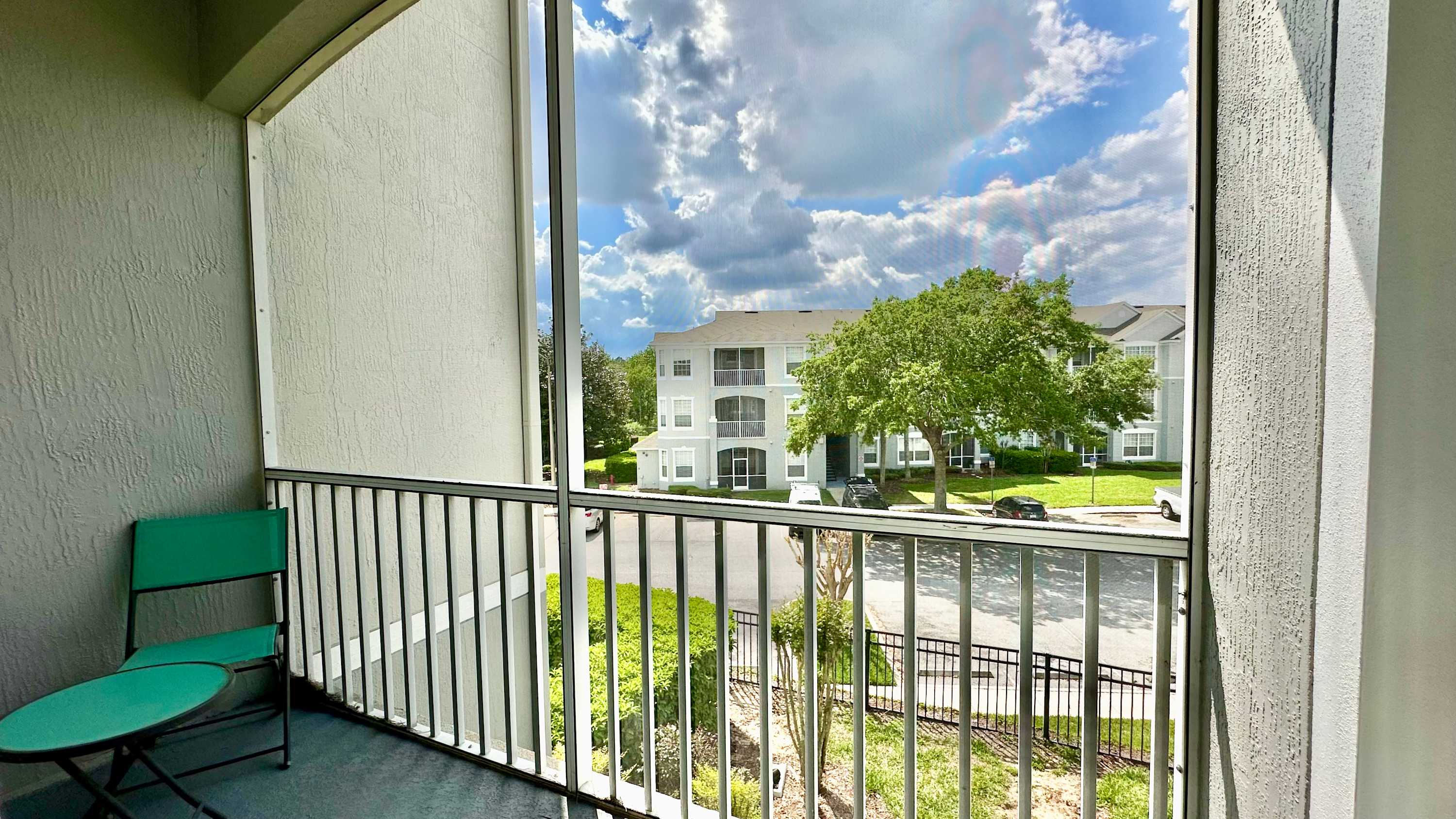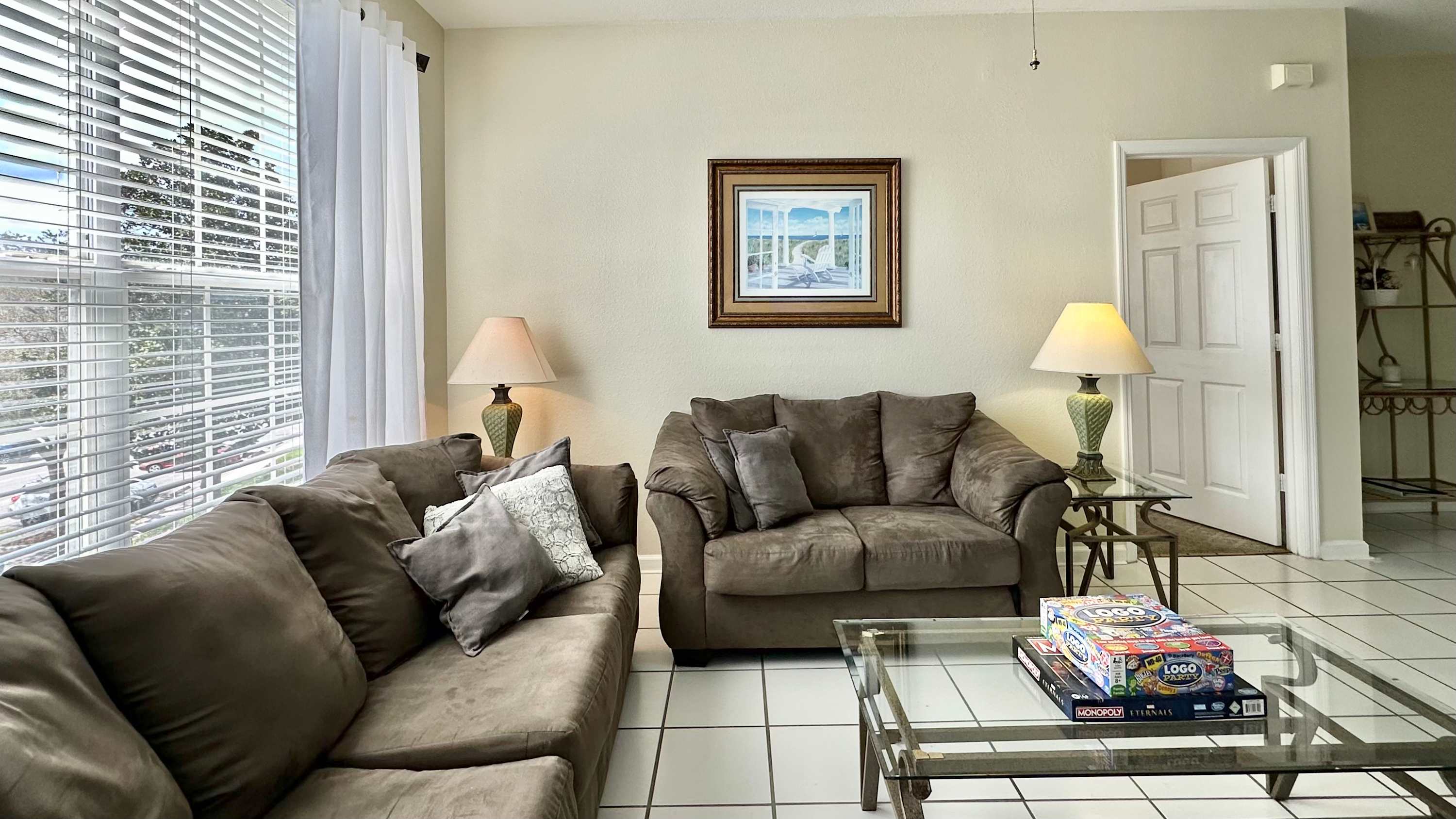 Inside, the condo welcomes you and your family with a bright, comfortable layout designed for easy living. The kitchen features crisp white cabinetry, plenty of counter space for preparing meals, and both drip and on-demand coffee so mornings start exactly how you like them. Just beyond, a dining table for four creates a cozy spot for breakfast before heading out or a relaxed dinner after a full day. The living room invites you to unwind with a couch, loveseat, and cable TV, while sliding doors open to a screened-in balcony complete with chairs and tables — the perfect place to sip coffee in the morning or enjoy warm Florida evenings. Whether you're planning busy park days or slow afternoons by the pool, this inviting retreat makes it easy to settle in and stay awhile.