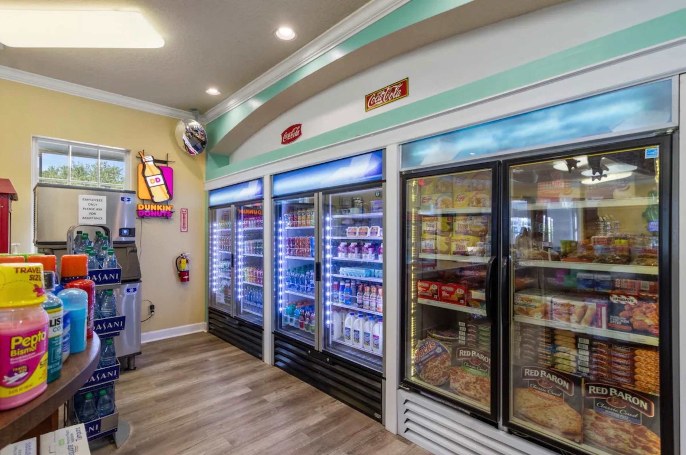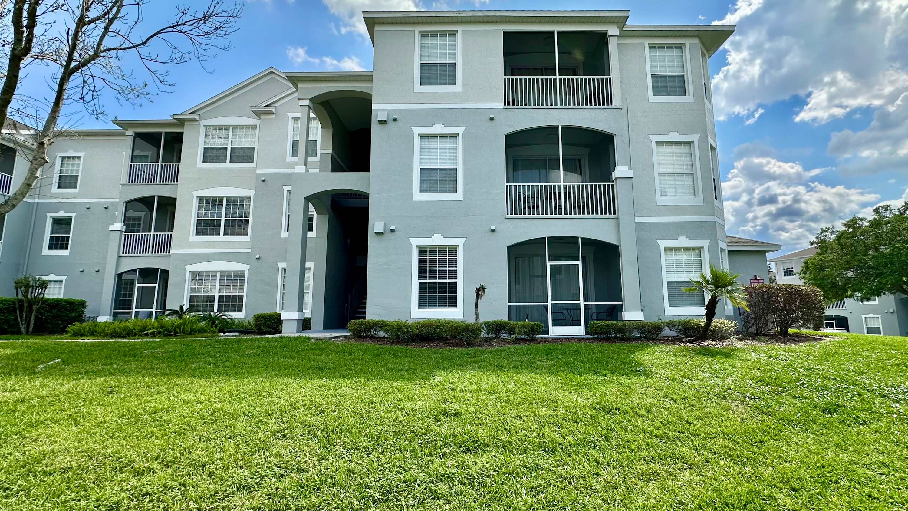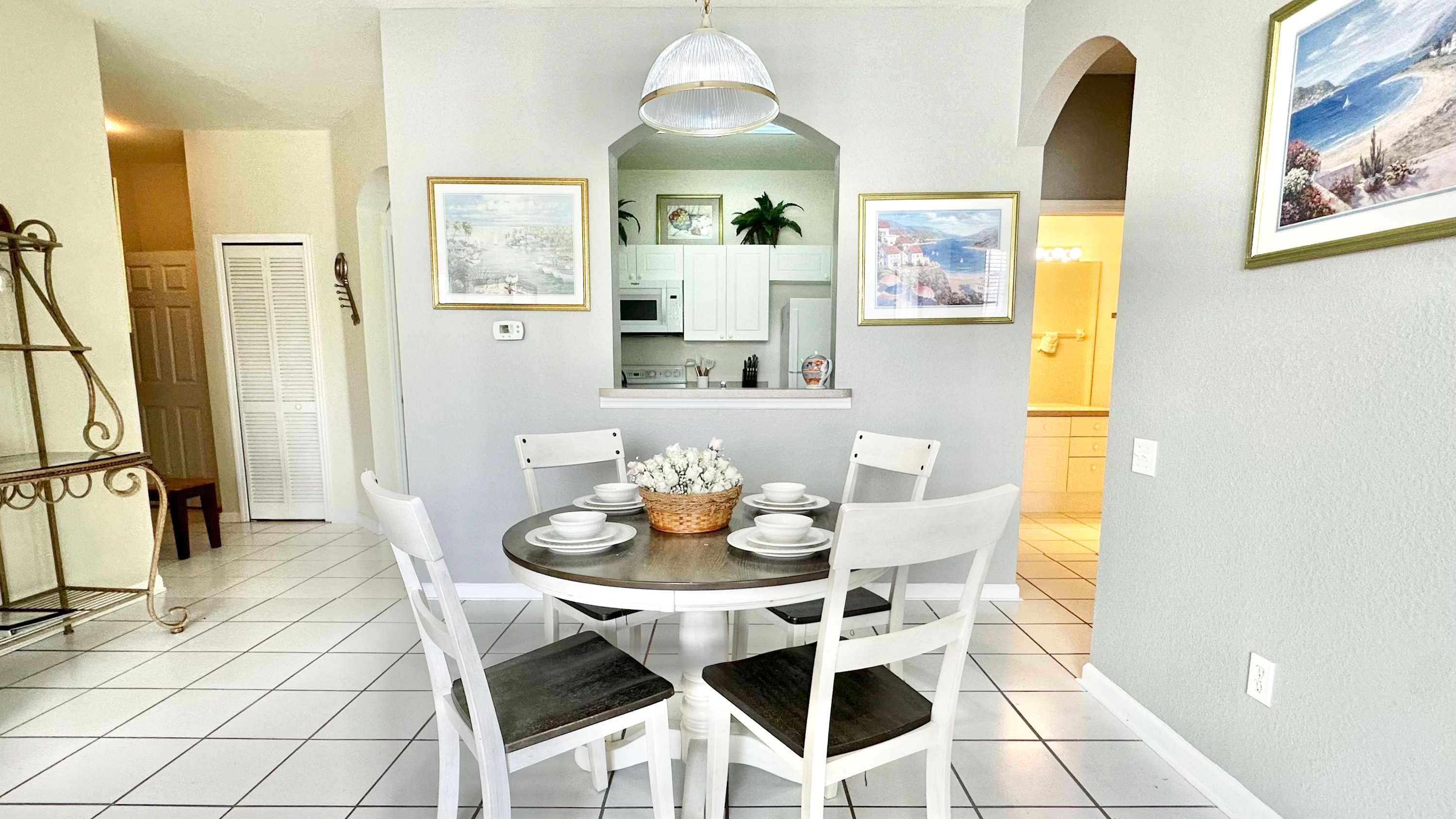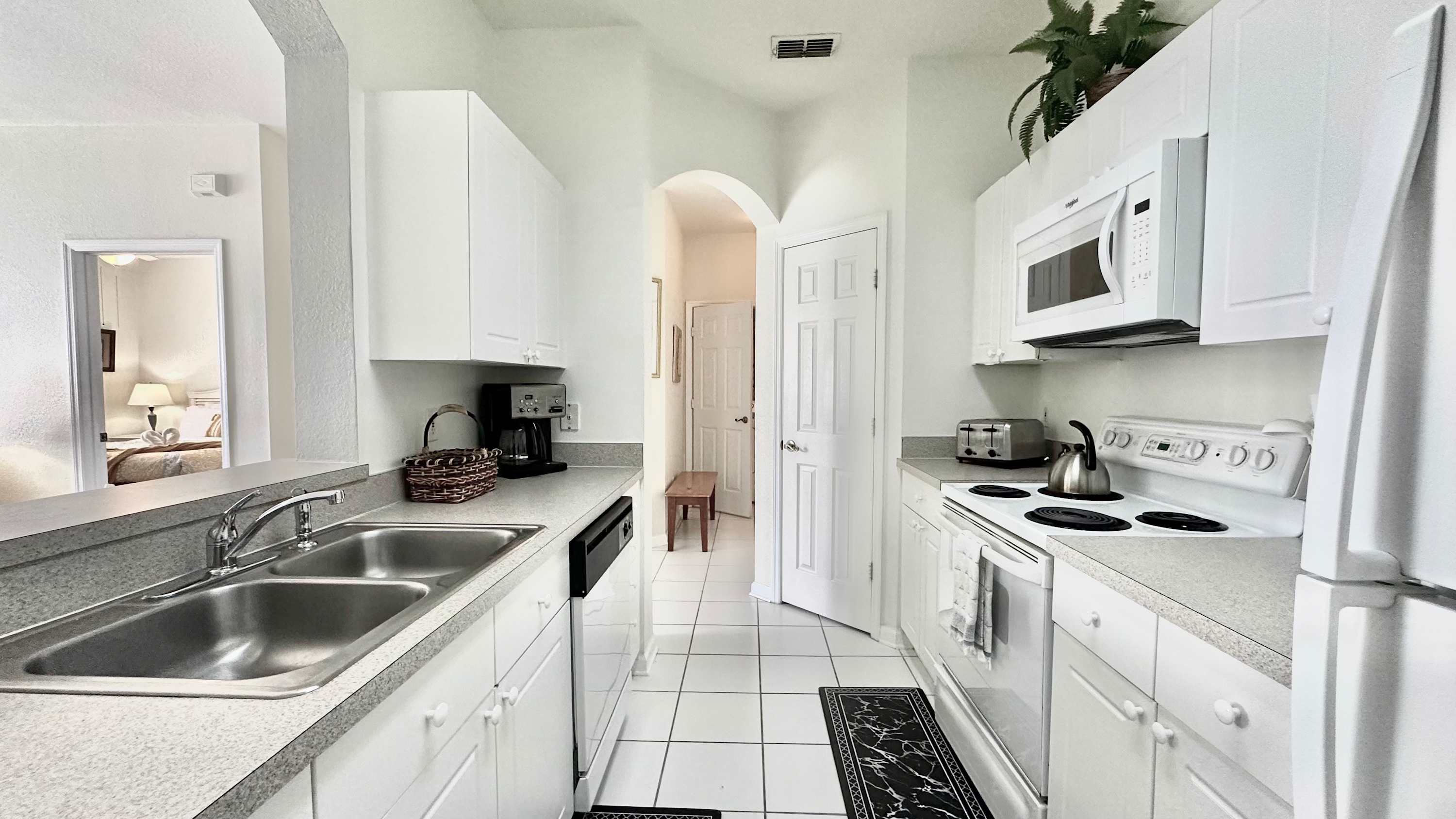 Inside, the condo welcomes you and your family with a bright, comfortable layout designed for easy living. The kitchen features crisp white cabinetry, plenty of counter space for preparing meals, and both drip and on-demand coffee so mornings start exactly how you like them. Just beyond, a dining table for four creates a cozy spot for breakfast before heading out or a relaxed dinner after a full day. The living room invites you to unwind with a couch, loveseat, and cable TV, while sliding doors open to a screened-in balcony complete with chairs and tables — the perfect place to sip coffee in the morning or enjoy warm Florida evenings. Whether you're planning busy park days or slow afternoons by the pool, this inviting retreat makes it easy to settle in and stay awhile.
