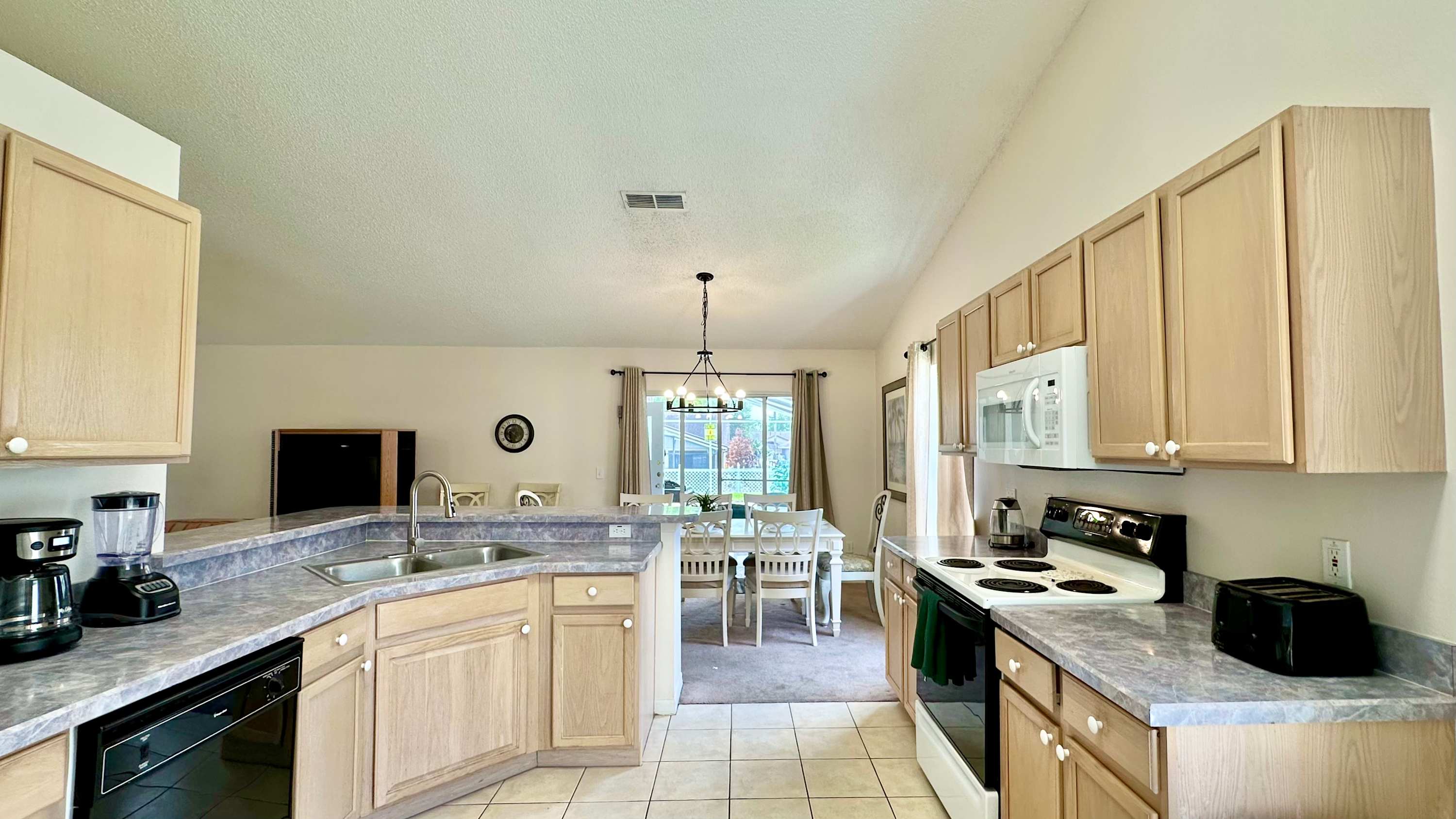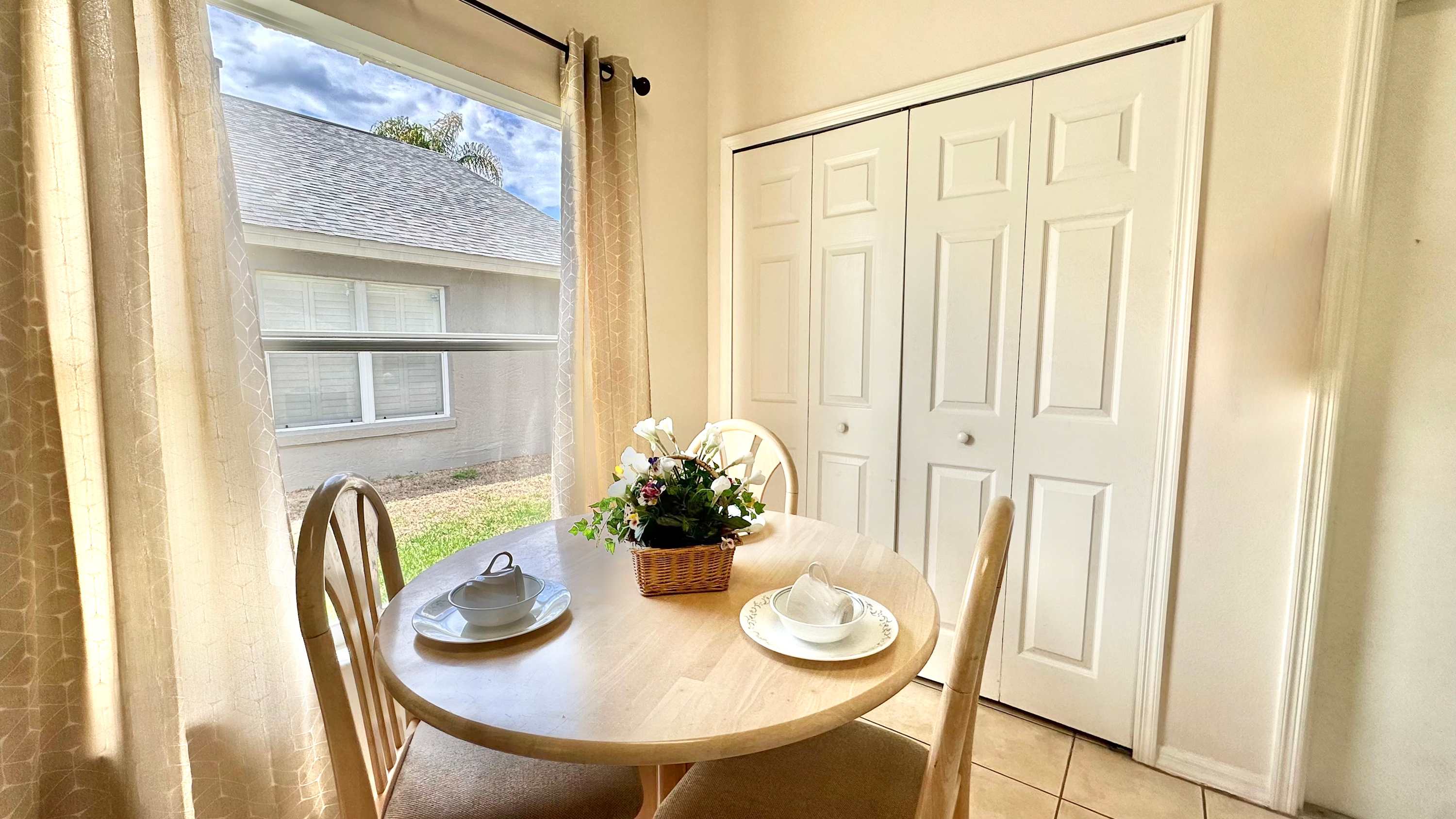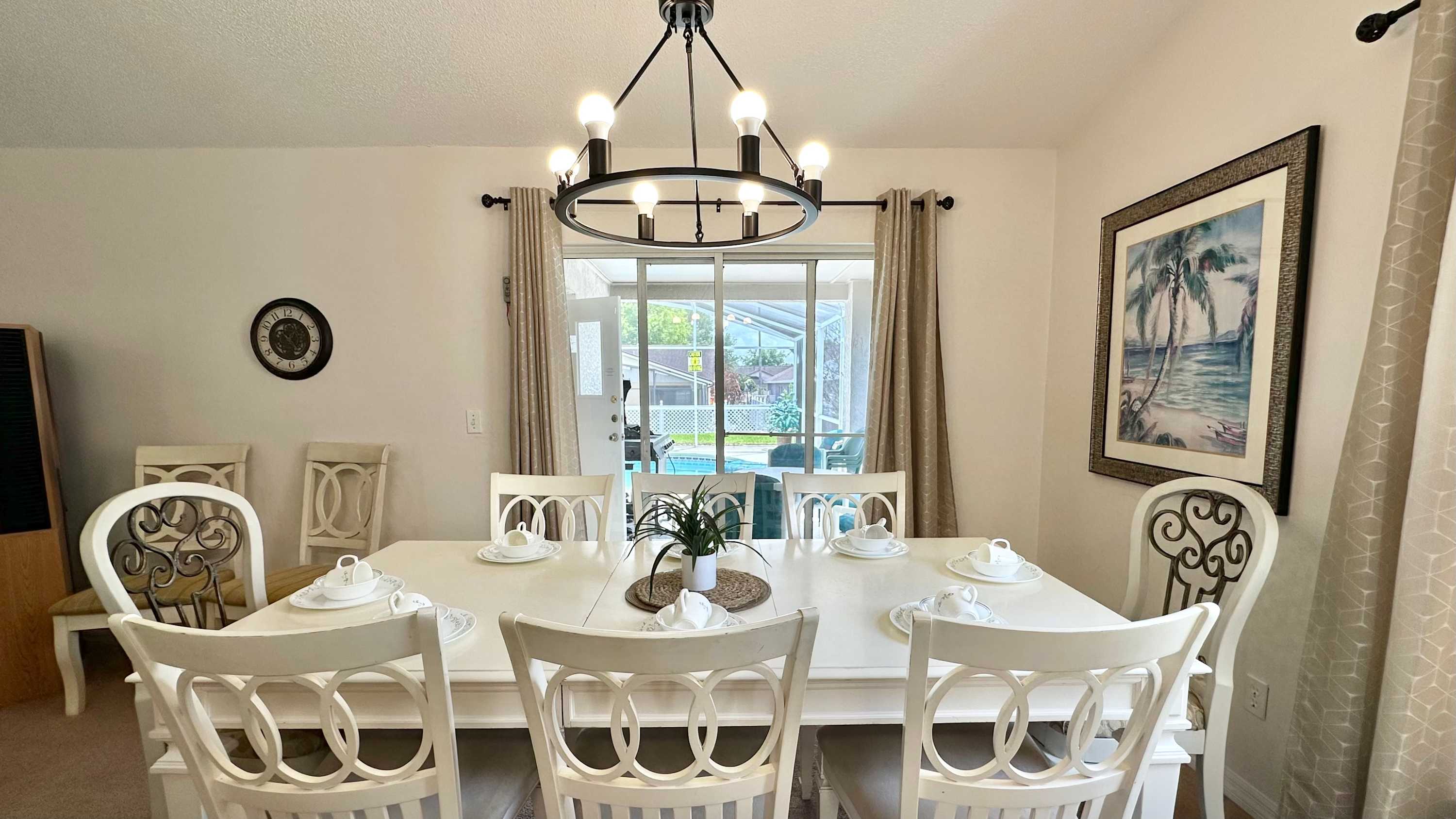 When you arrive, make your way outside first and you’ll quickly see why this home shines. The oversized screened lanai surrounds a bean-shaped private pool, framed by grassy areas that give the space an open, breezy feel. A shaded overhang provides a table for four and a chaise lounge — perfect for sipping morning coffee, reading in the afternoon, or winding down after a swim. Back inside, the dining table for eight makes gathering effortless, while the nearby kitchen features light wood cabinetry, gray countertops, and a cozy breakfast nook with seating for three, ideal for quick bites before heading out.