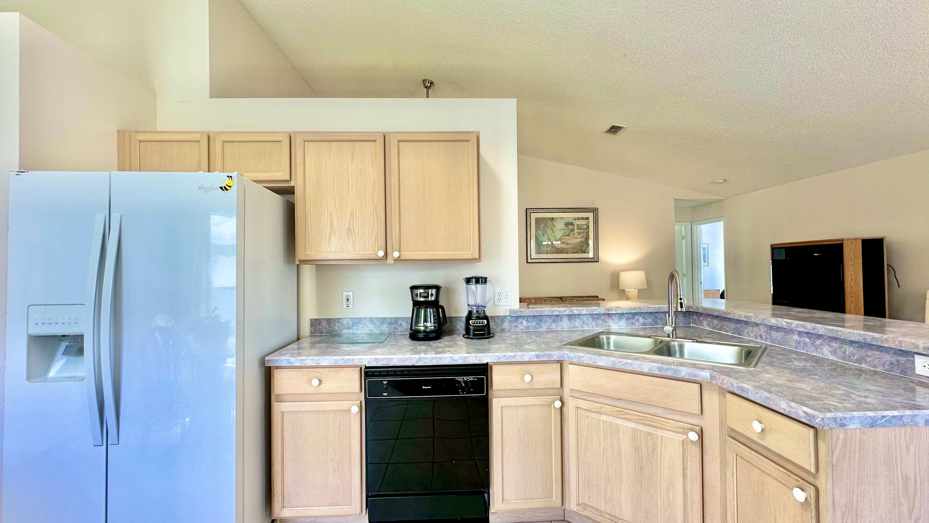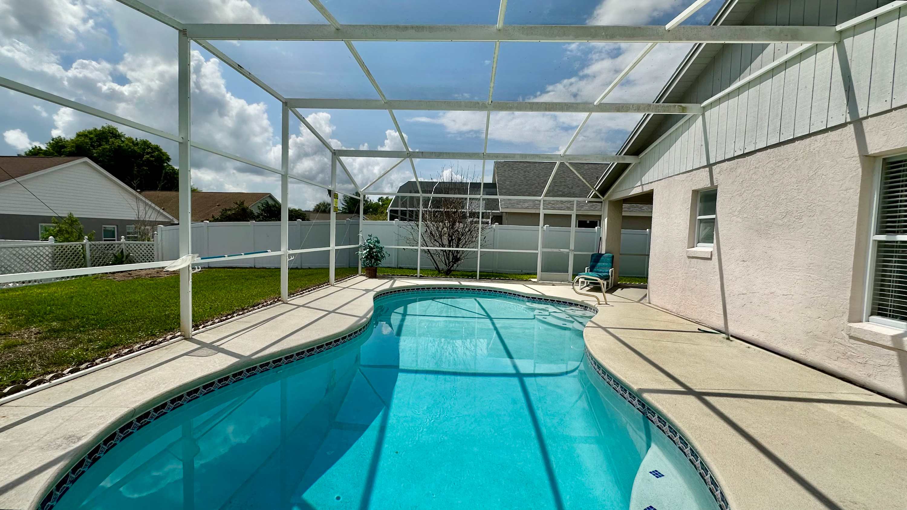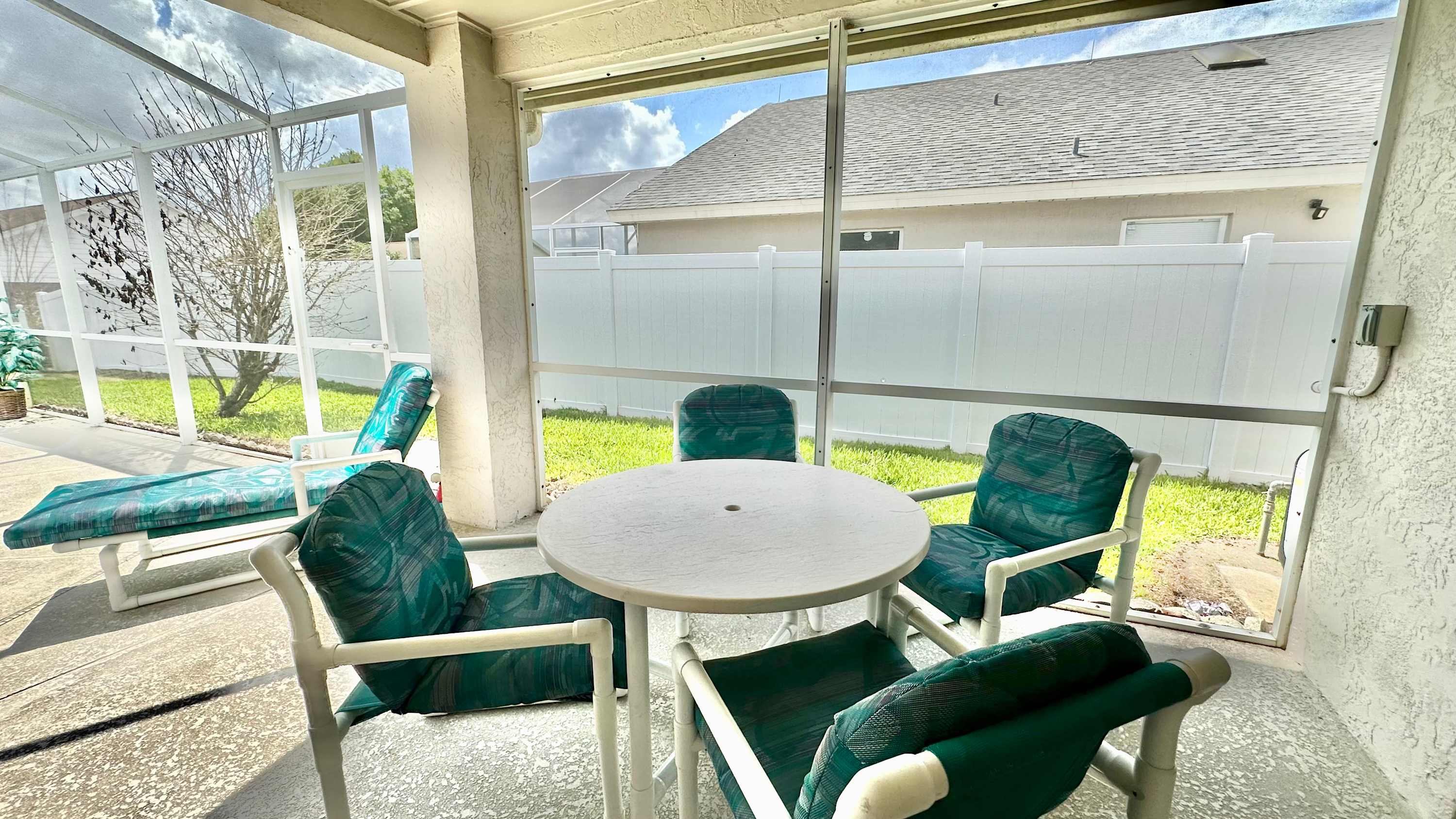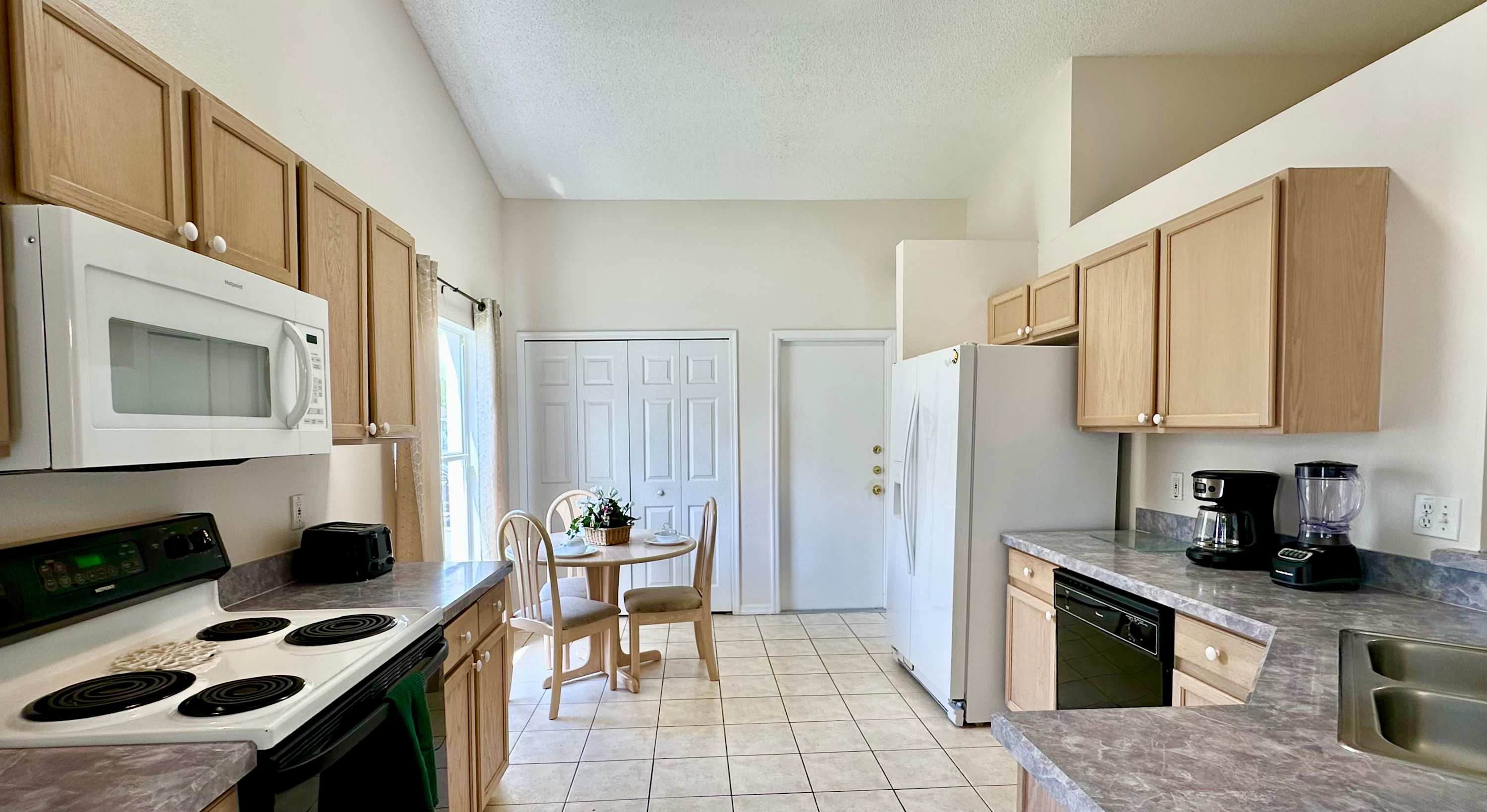 When you arrive, make your way outside first and you’ll quickly see why this home shines. The oversized screened lanai surrounds a bean-shaped private pool, framed by grassy areas that give the space an open, breezy feel. A shaded overhang provides a table for four and a chaise lounge — perfect for sipping morning coffee, reading in the afternoon, or winding down after a swim. Back inside, the dining table for eight makes gathering effortless, while the nearby kitchen features light wood cabinetry, gray countertops, and a cozy breakfast nook with seating for three, ideal for quick bites before heading out.