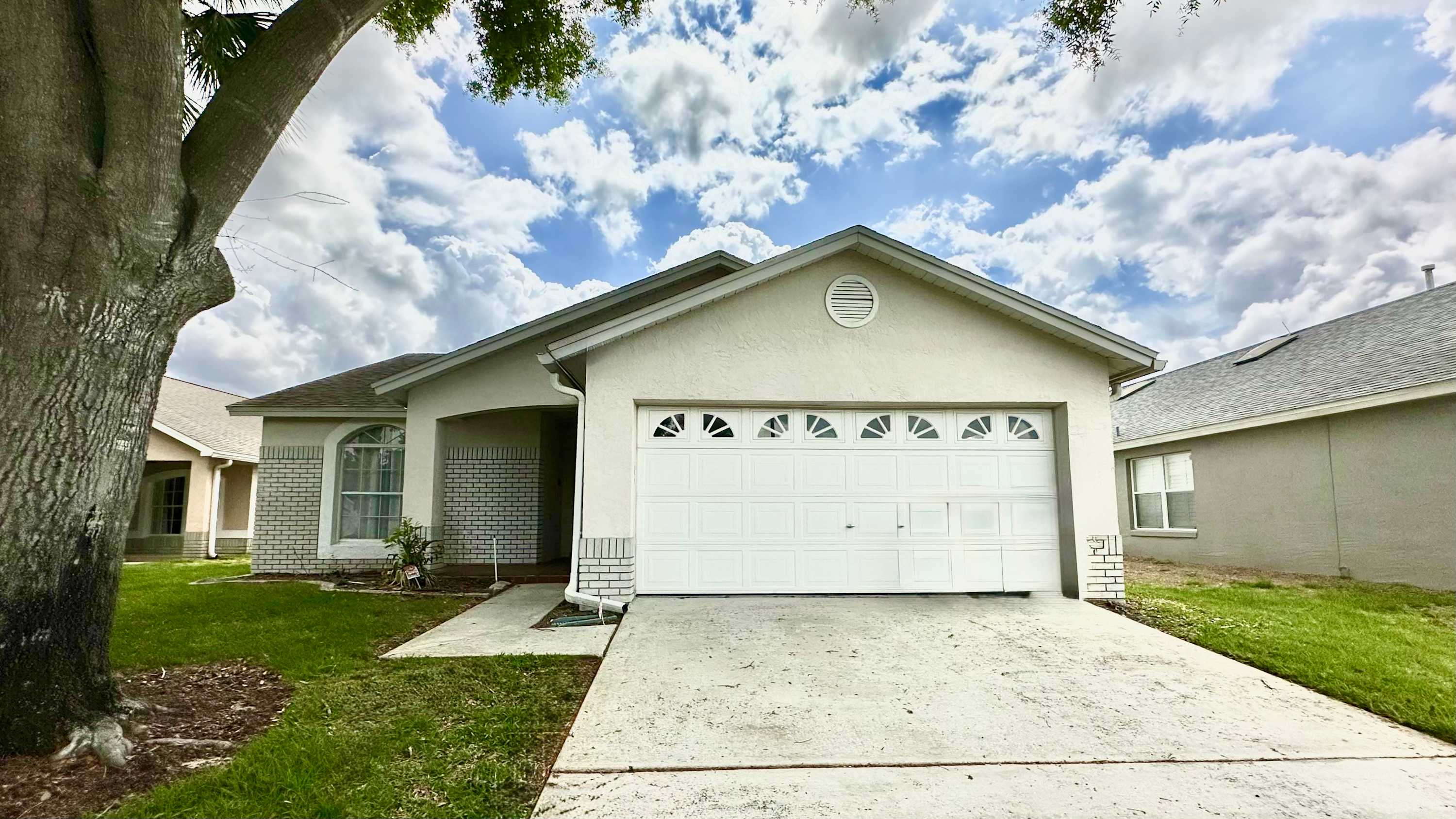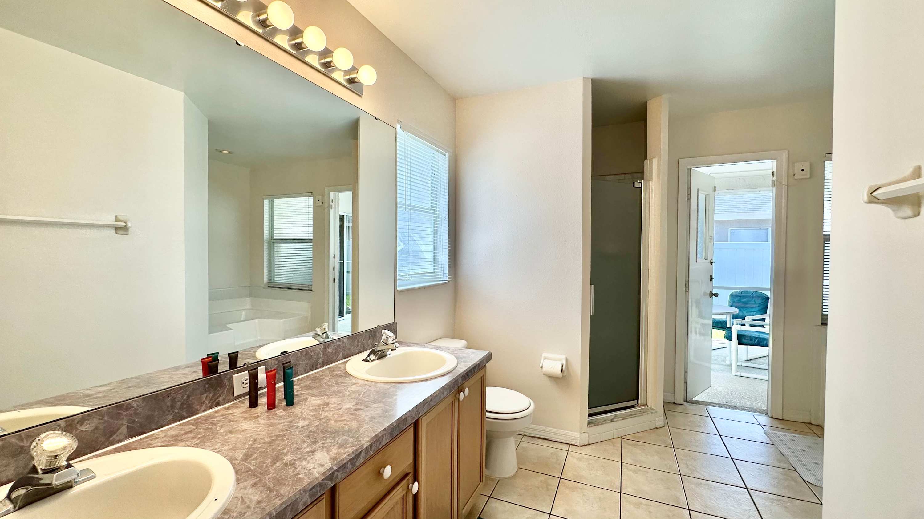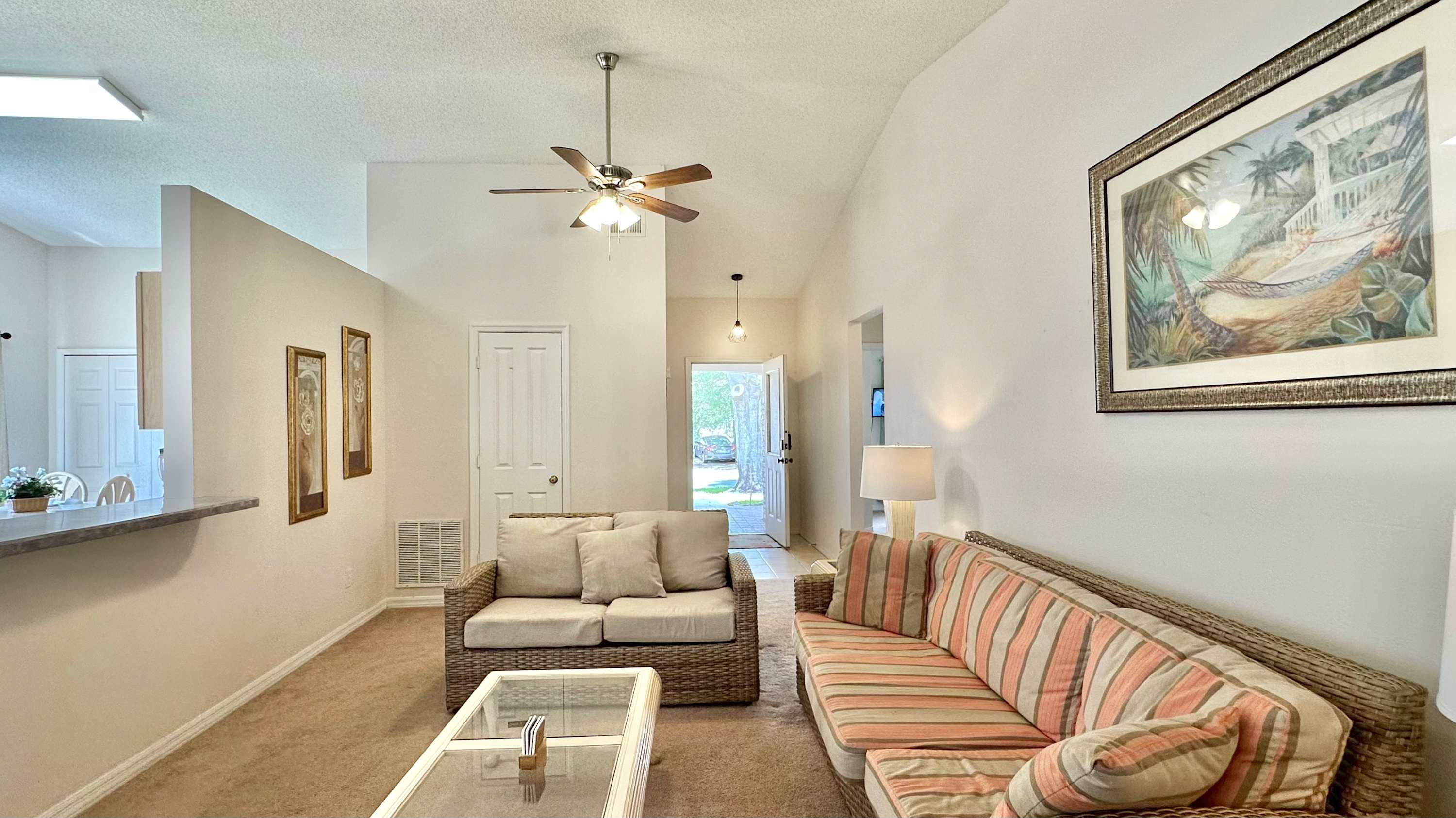 The living room continues the classic Florida styling with a smart TV and comfortable couch and loveseat in rattan-style coral and beige stripes, creating a cheerful space to relax after a day of adventure. For a little extra fun, the garage doubles as a game zone with a pool table, perfect for friendly competition. With its private pool, laid-back Florida charm, and convenient location near all the Kissimmee attractions, Sunlit Splash delivers an easygoing stay designed for both play and relaxation.