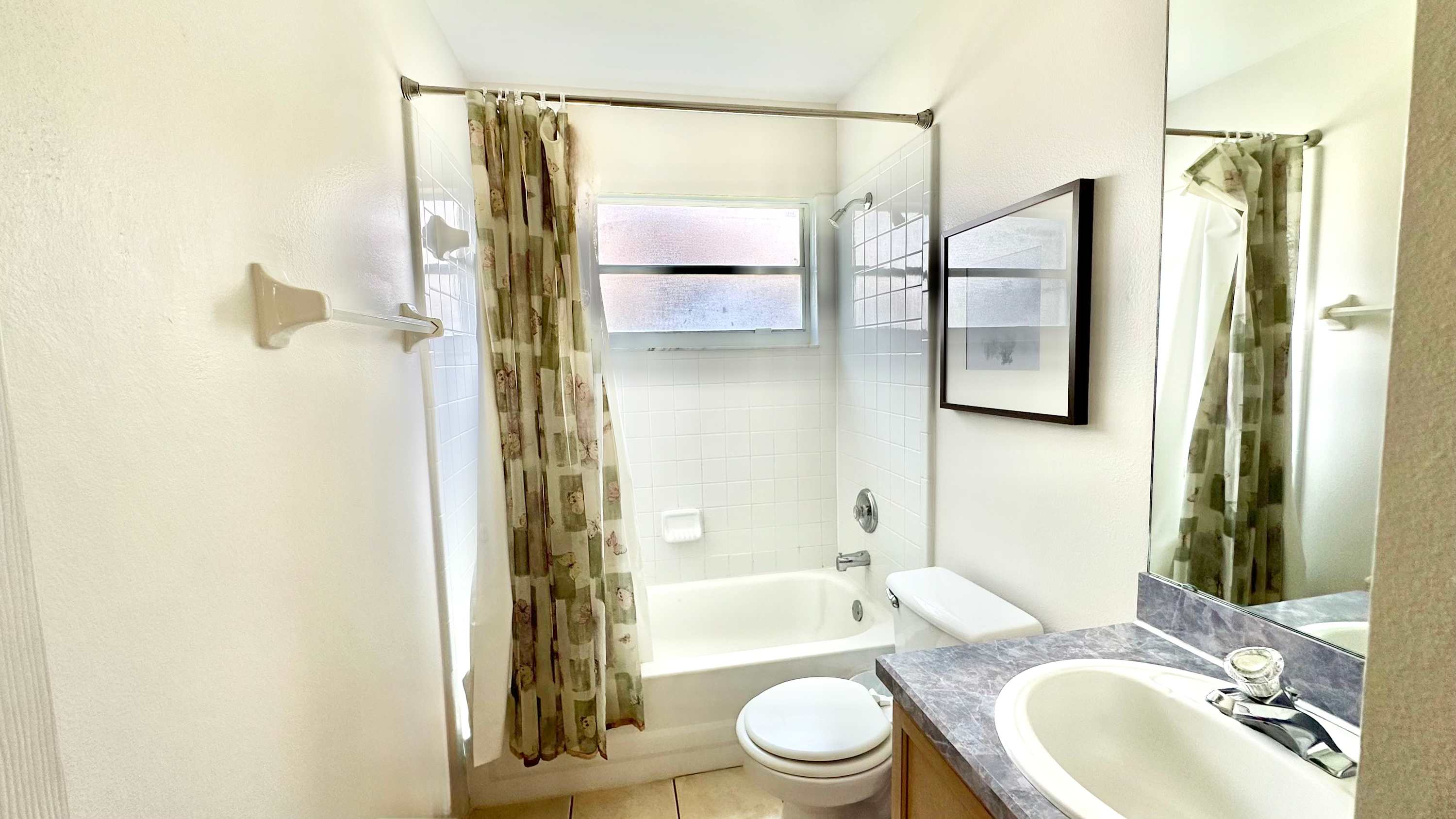 This home also includes an additional full guest bathroom with a single vanity and a shower/tub combo.
