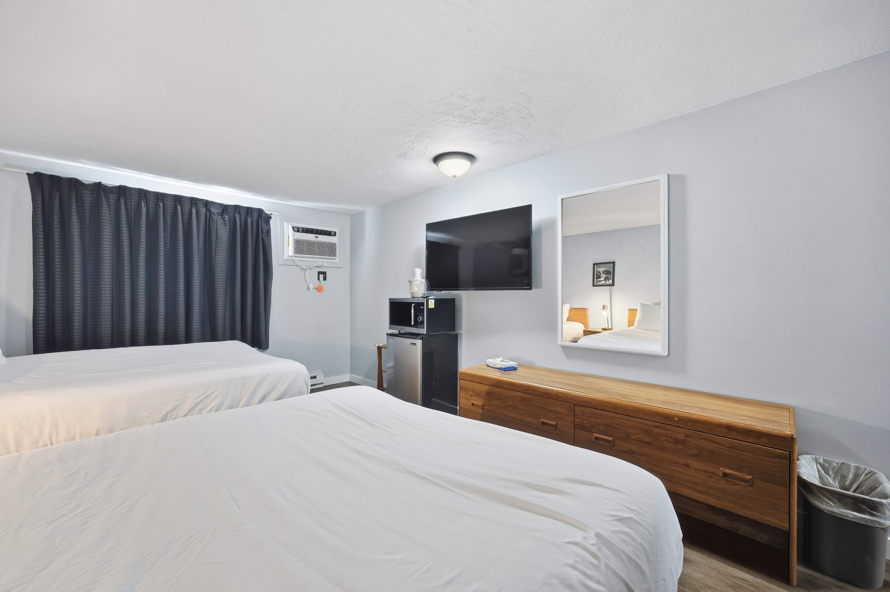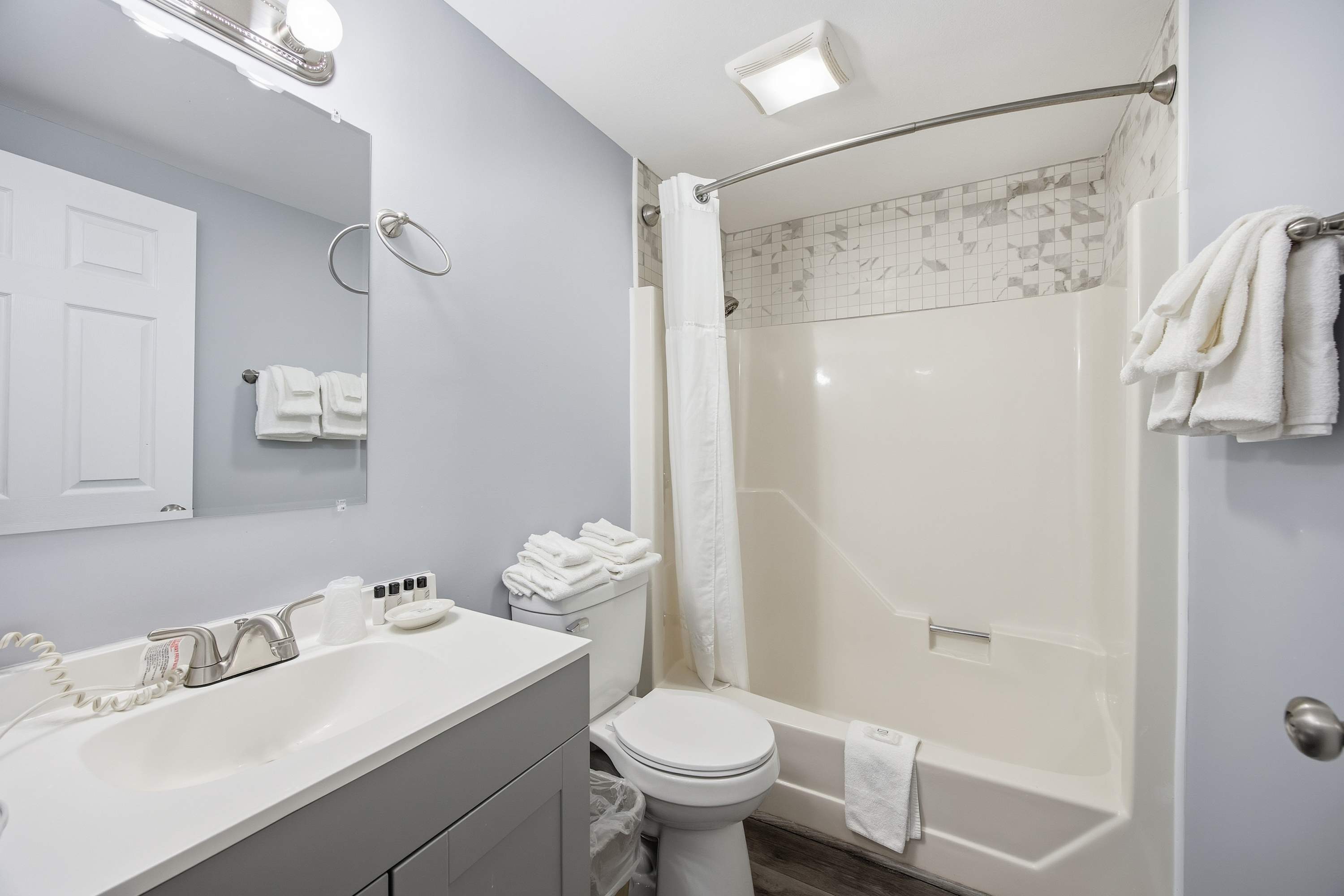 Unwind in this thoughtfully designed hotel-style room, ideal for travelers seeking comfort and convenience without unnecessary extras. The space includes cable TV for easy entertainment, while a mini-fridge and microwave provide the essentials for quick snacks and light meals. A small bistro-style dining table tucked into the corner creates the perfect spot to enjoy breakfast, sip coffee, or plan the day’s adventures. The full bath is designed with classic hotel functionality, featuring a sink and vanity area located in the hallway so multiple guests can get ready with ease while keeping the bathroom private. Clean, simple, and efficient, this setup makes relaxing between outings effortless.