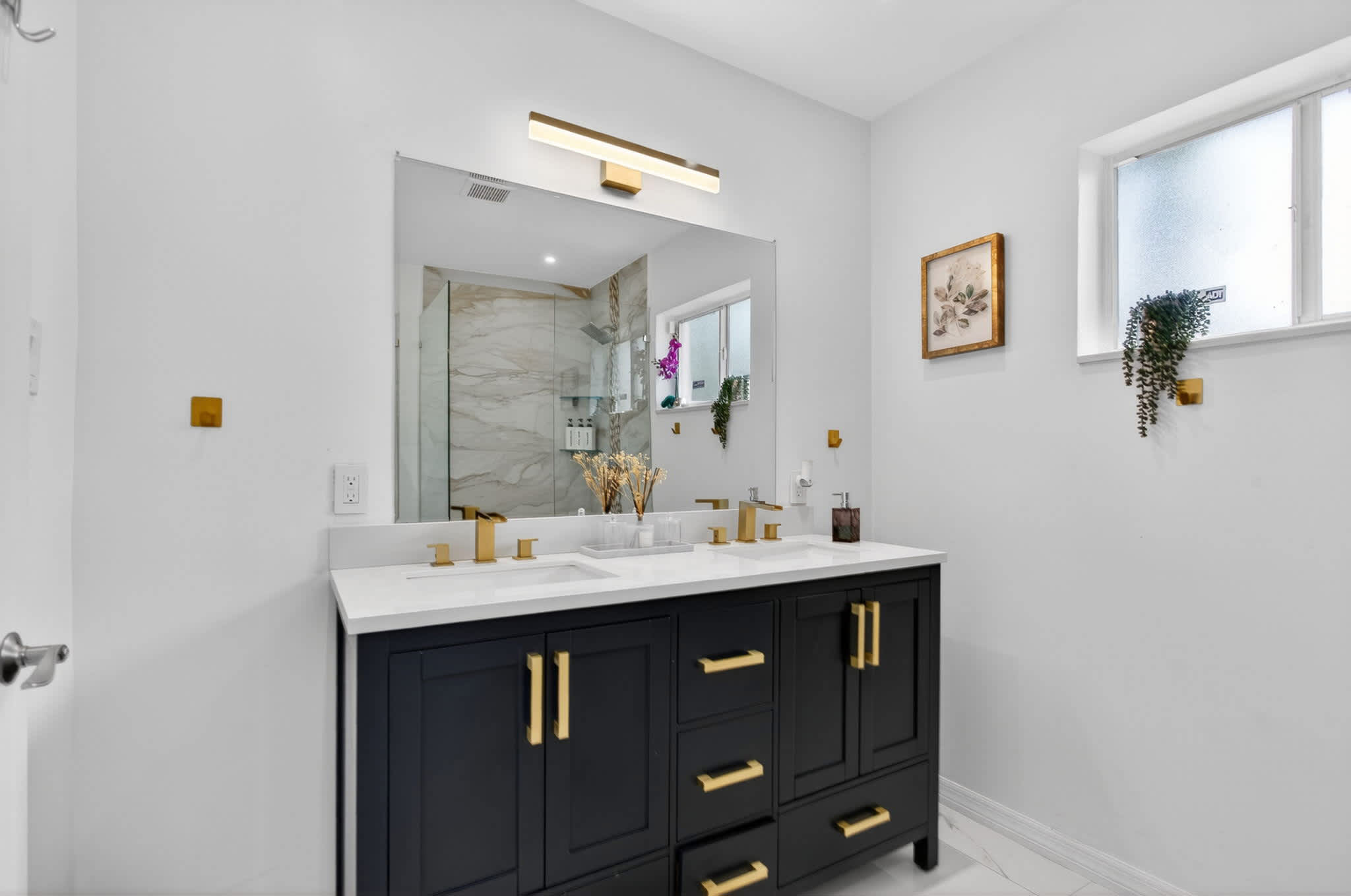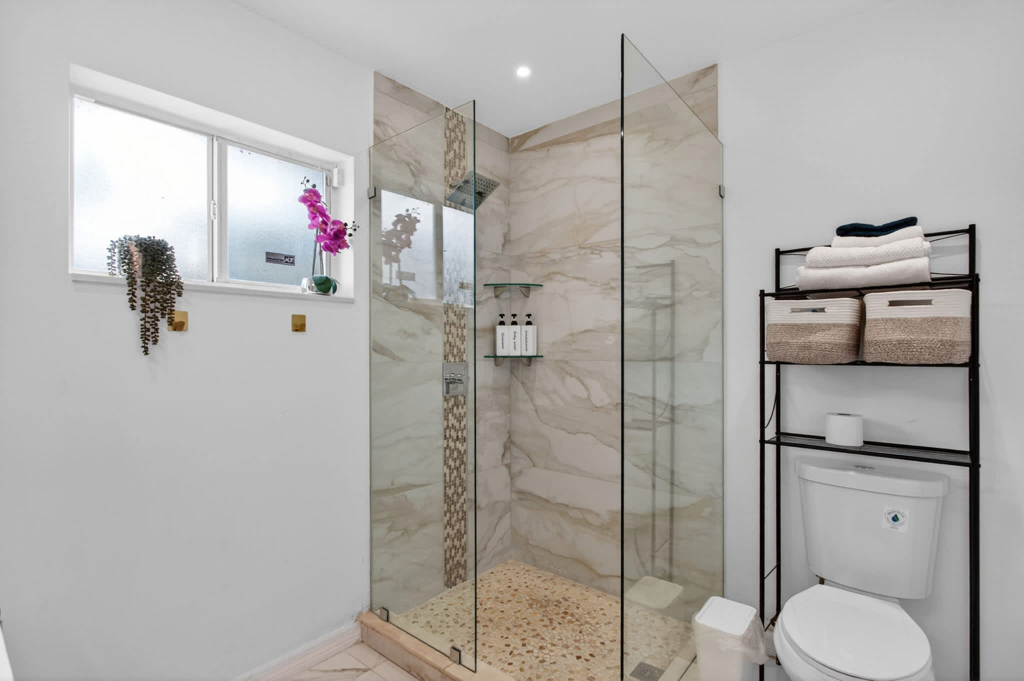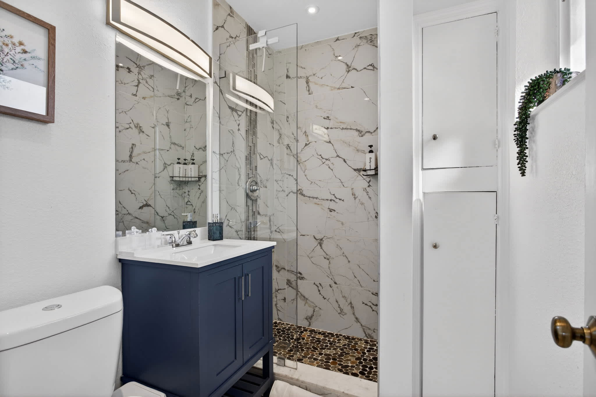This home also includes an additional full guest bathroom with a pedestal sink and a walk-in shower.