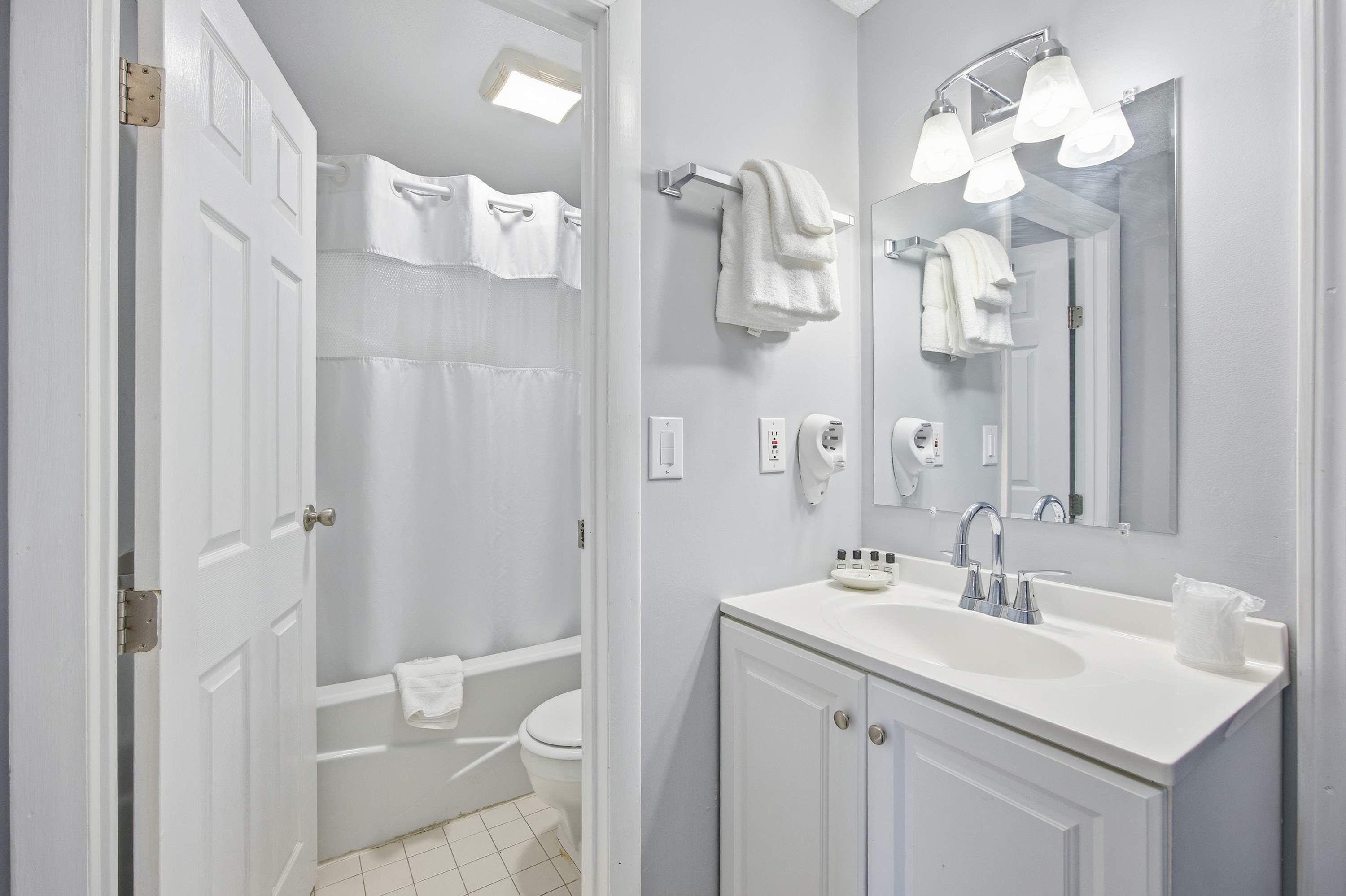 This unit also includes a full guest bathroom with a single vanity and a shower/tub combo.