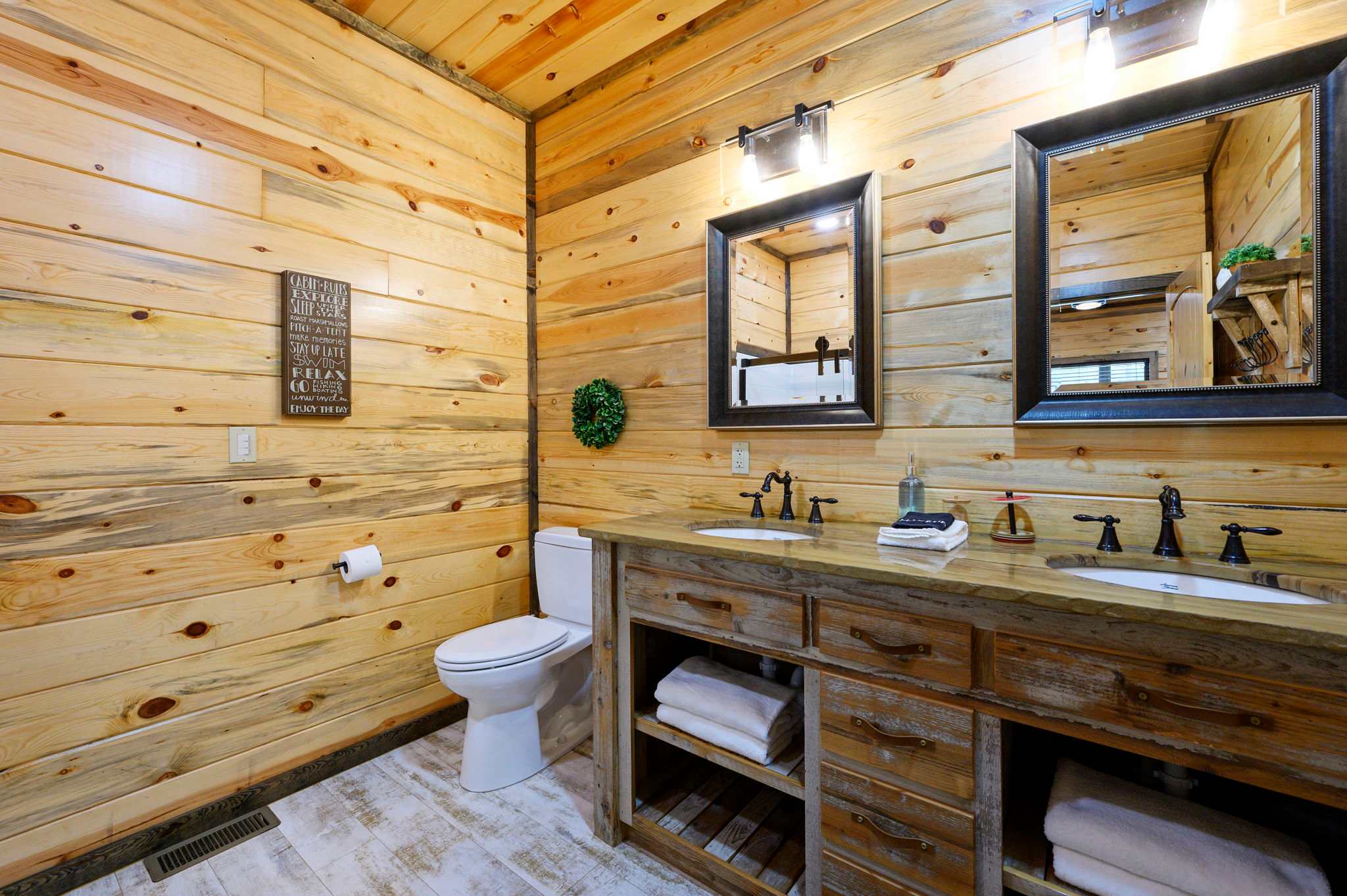 Bedroom #3 includes 2 queen size beds, a smart TV, and an ensuite bathroom with a dual vanity and a shower/tub combo.