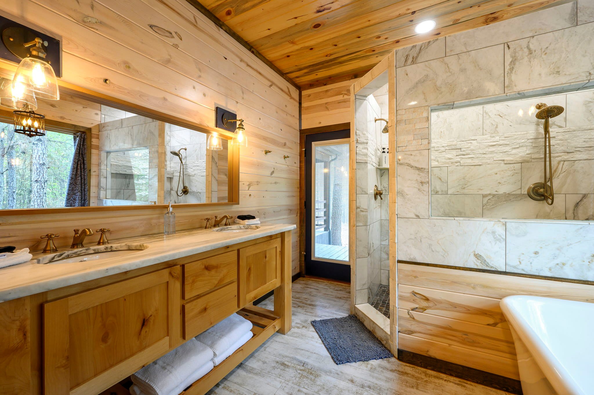 Bedroom #1 includes a king size bed, a smart TV, a chair, deck access, and an ensuite bathroom with a dual vanity, a soaking tub, and a walk-in shower.