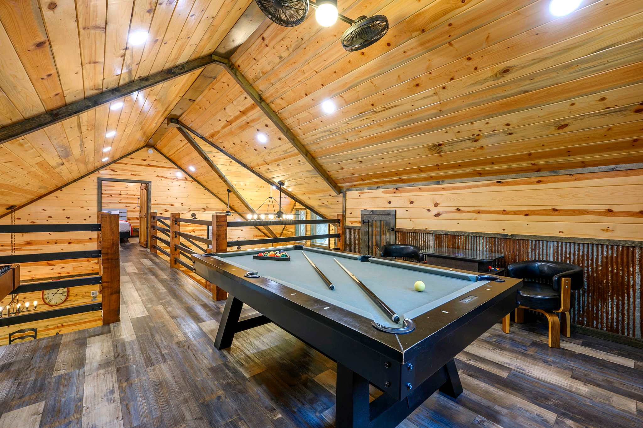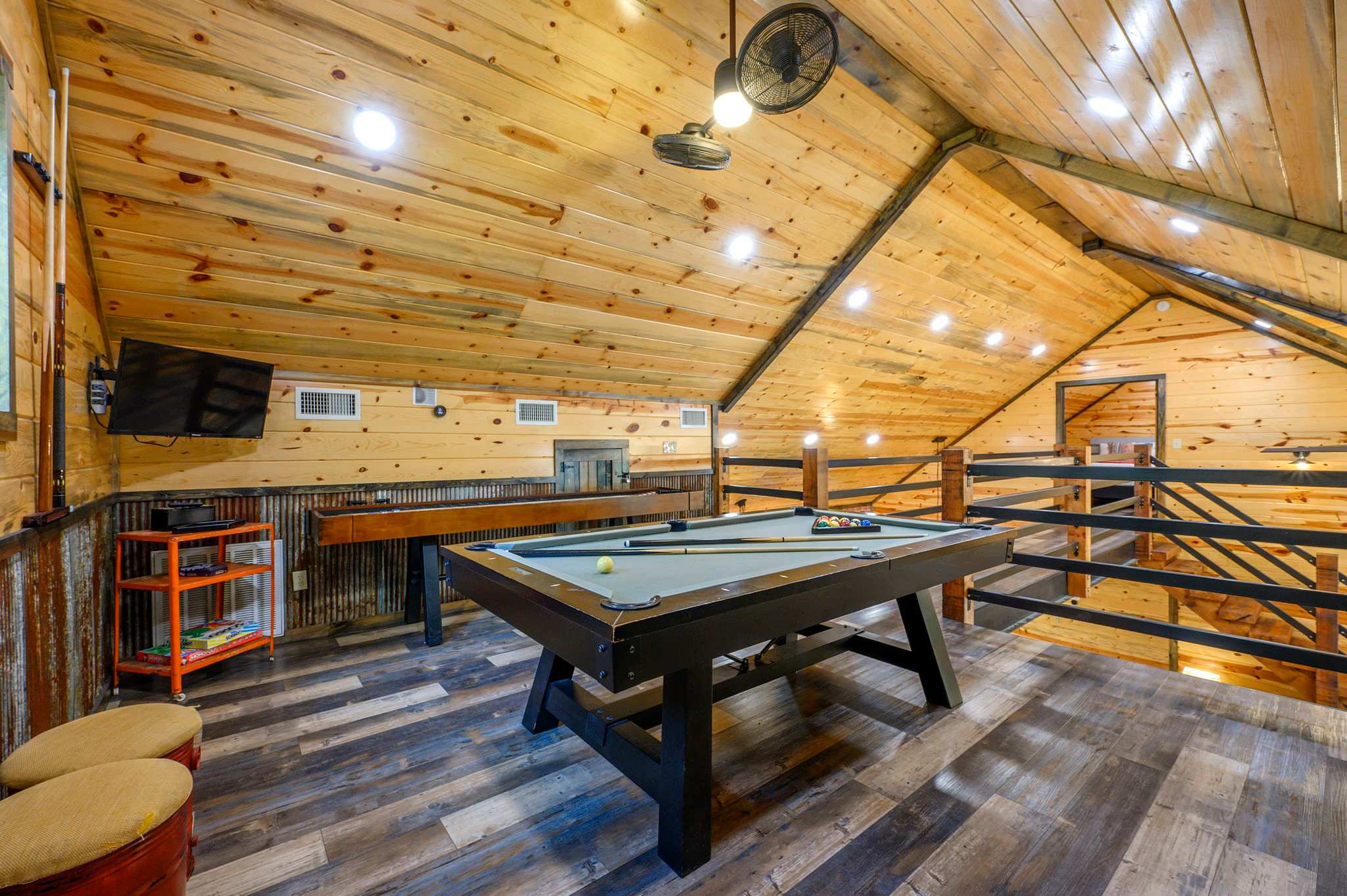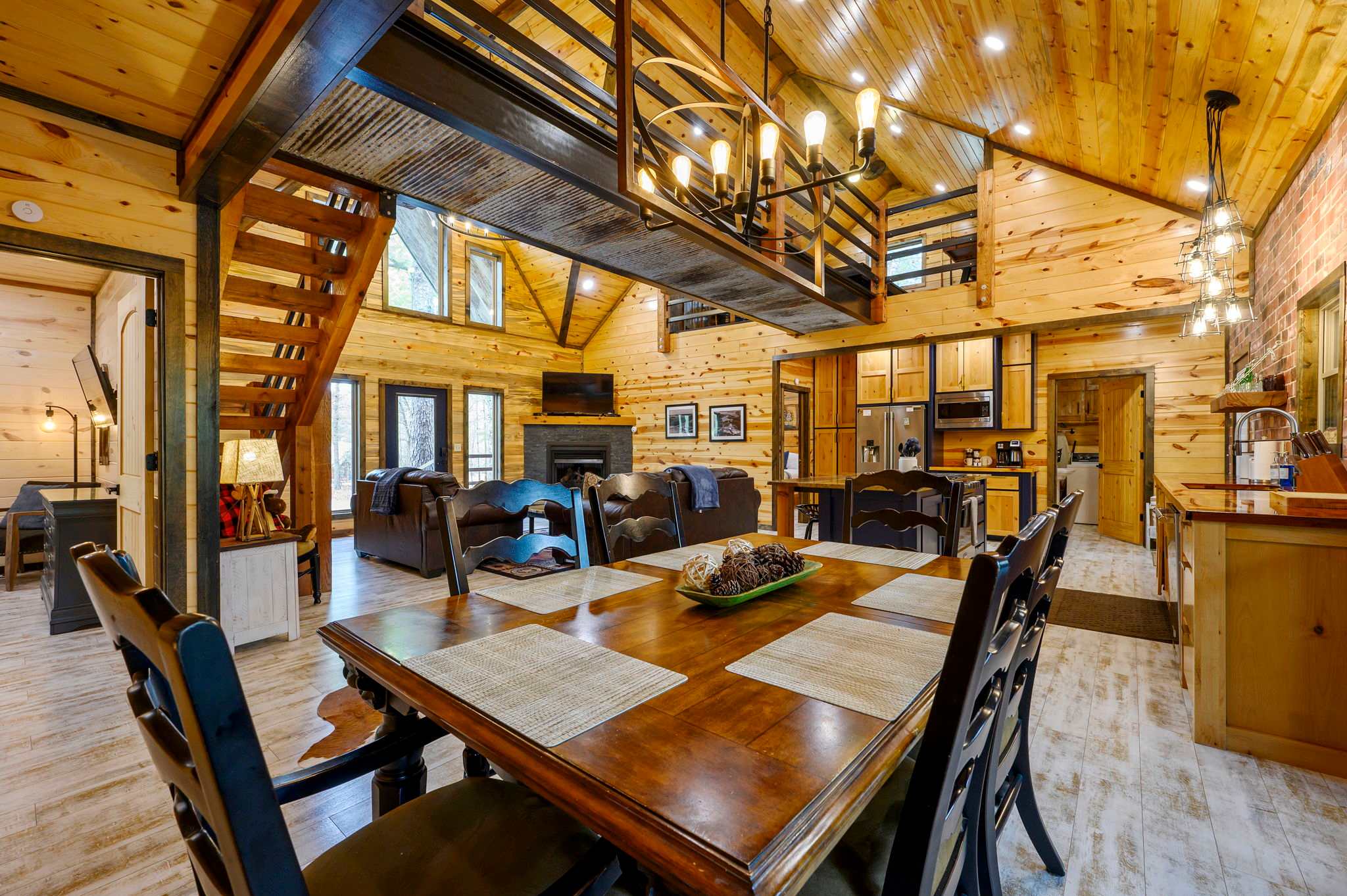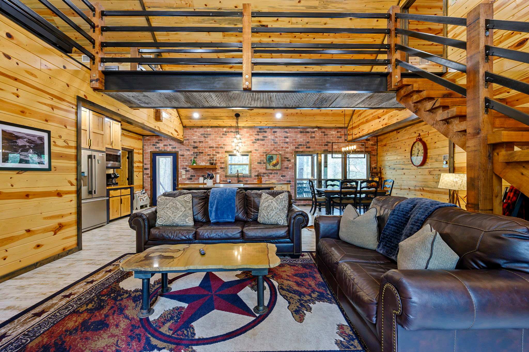 Inside, the open-concept kitchen, living, and dining area creates a warm and inviting place to gather. The kitchen features stainless steel appliances, a brick wall accent, island stove, and counter seating for three, along with both Keurig and traditional coffee options for easy mornings. Just beyond, the dining table for six offers a comfortable spot for shared meals. The living room opens up with comfy leather furniture, a smart TV, and large windows that overlook the front yard, filling the space with natural light. Above the main space, a catwalk leads to the lofted game room, adding both character and entertainment to the home. This fun-filled space includes a smart TV, pool table, shuffleboard, and a video game setup, creating the perfect hangout for all ages.