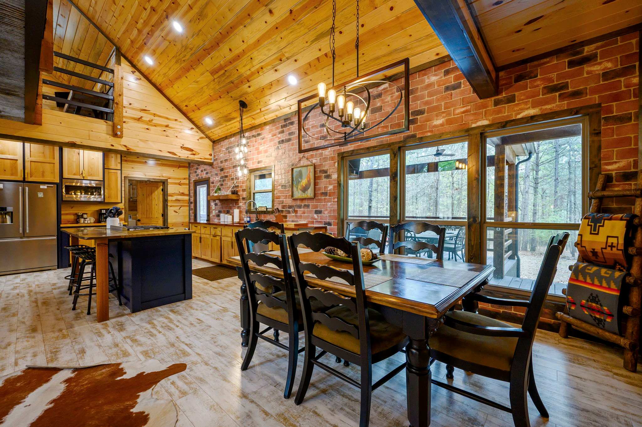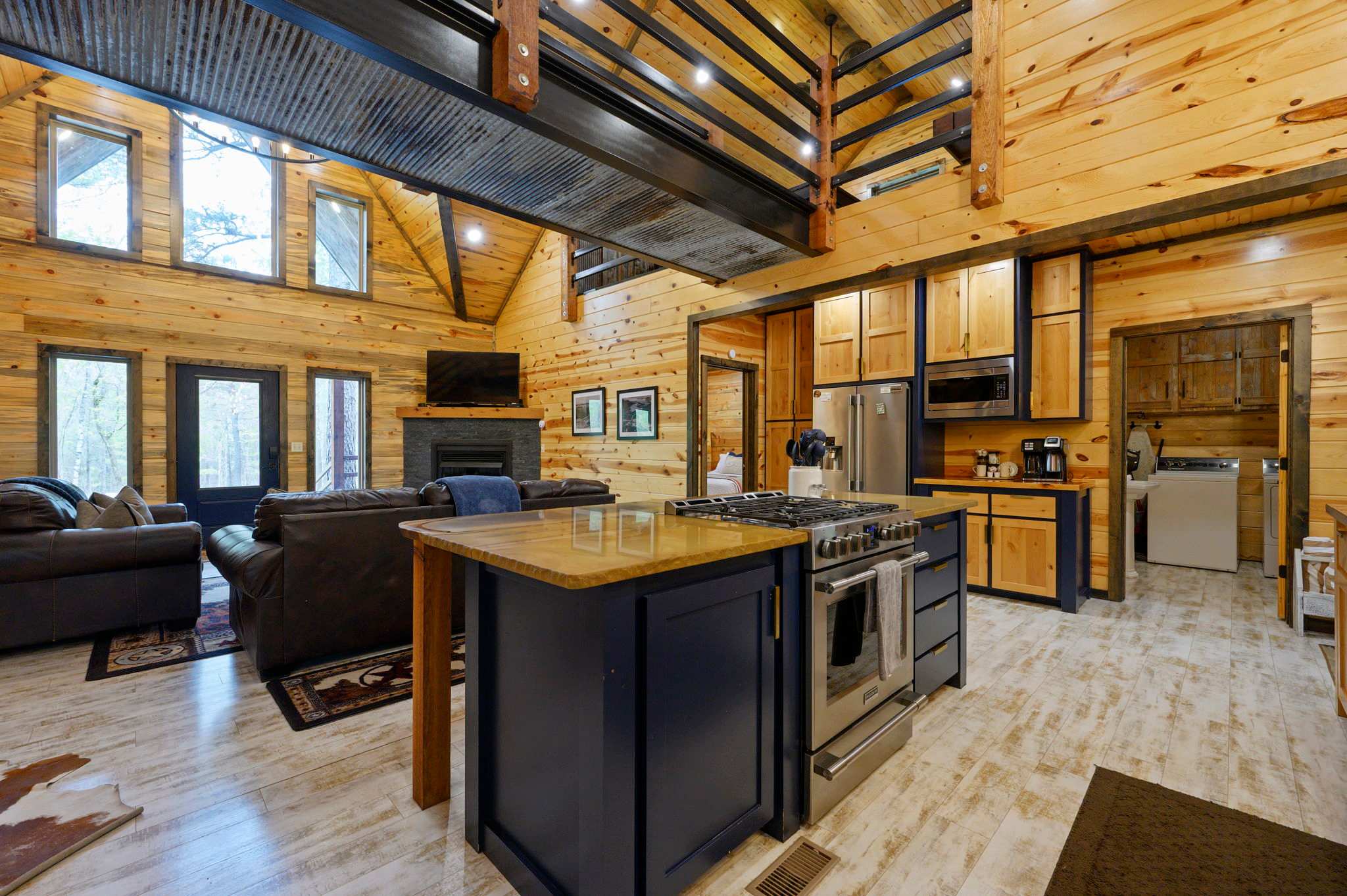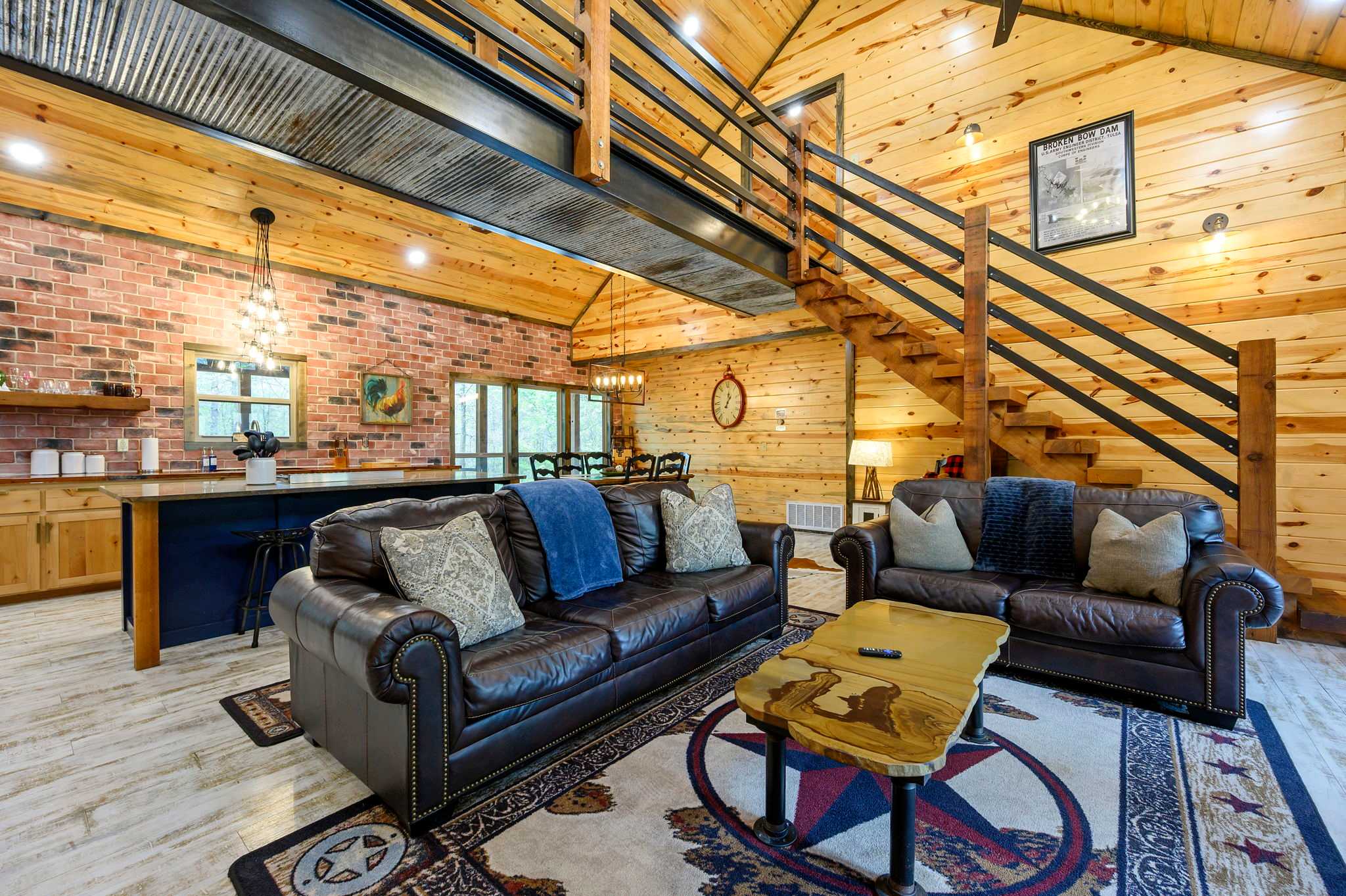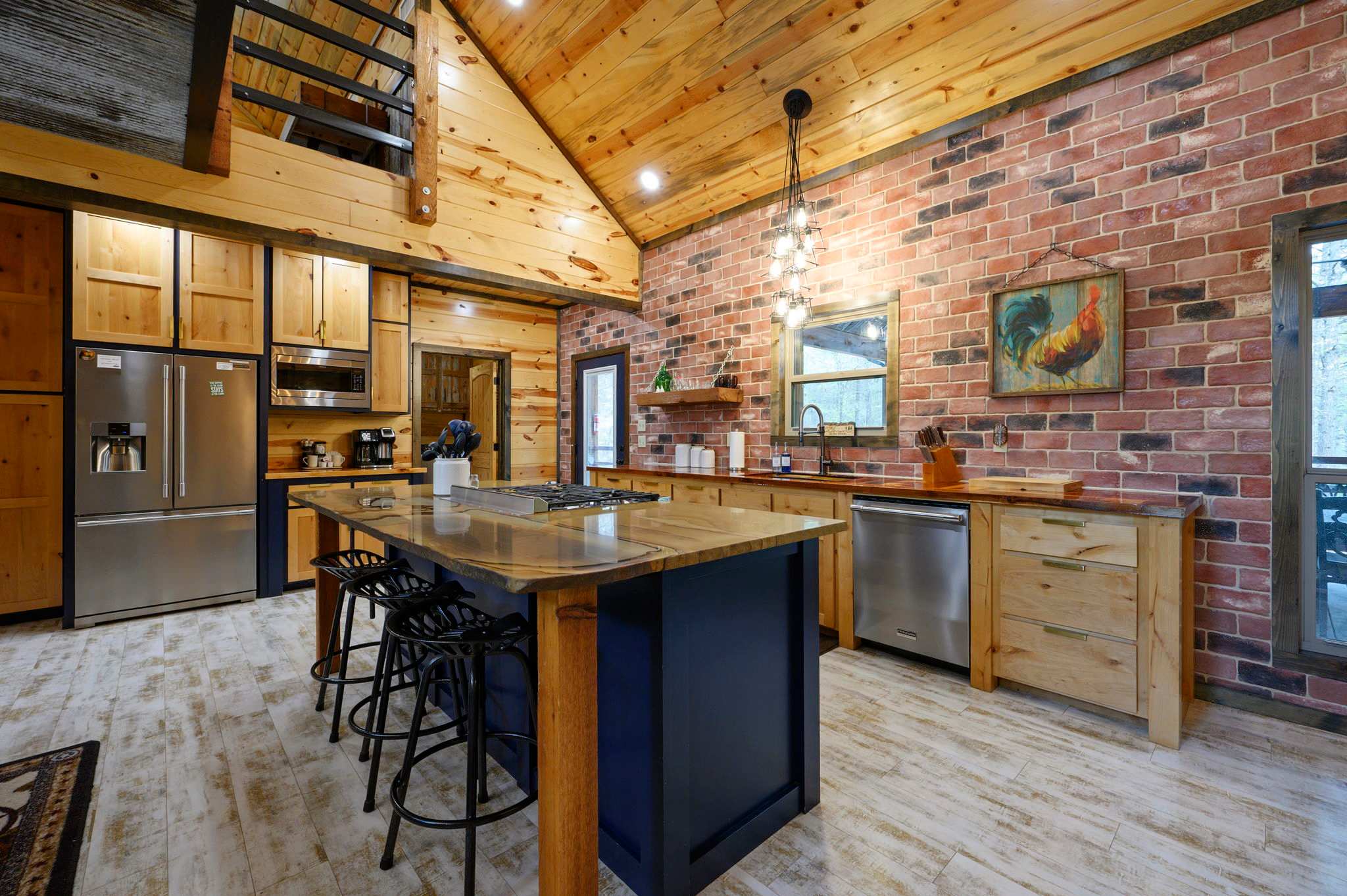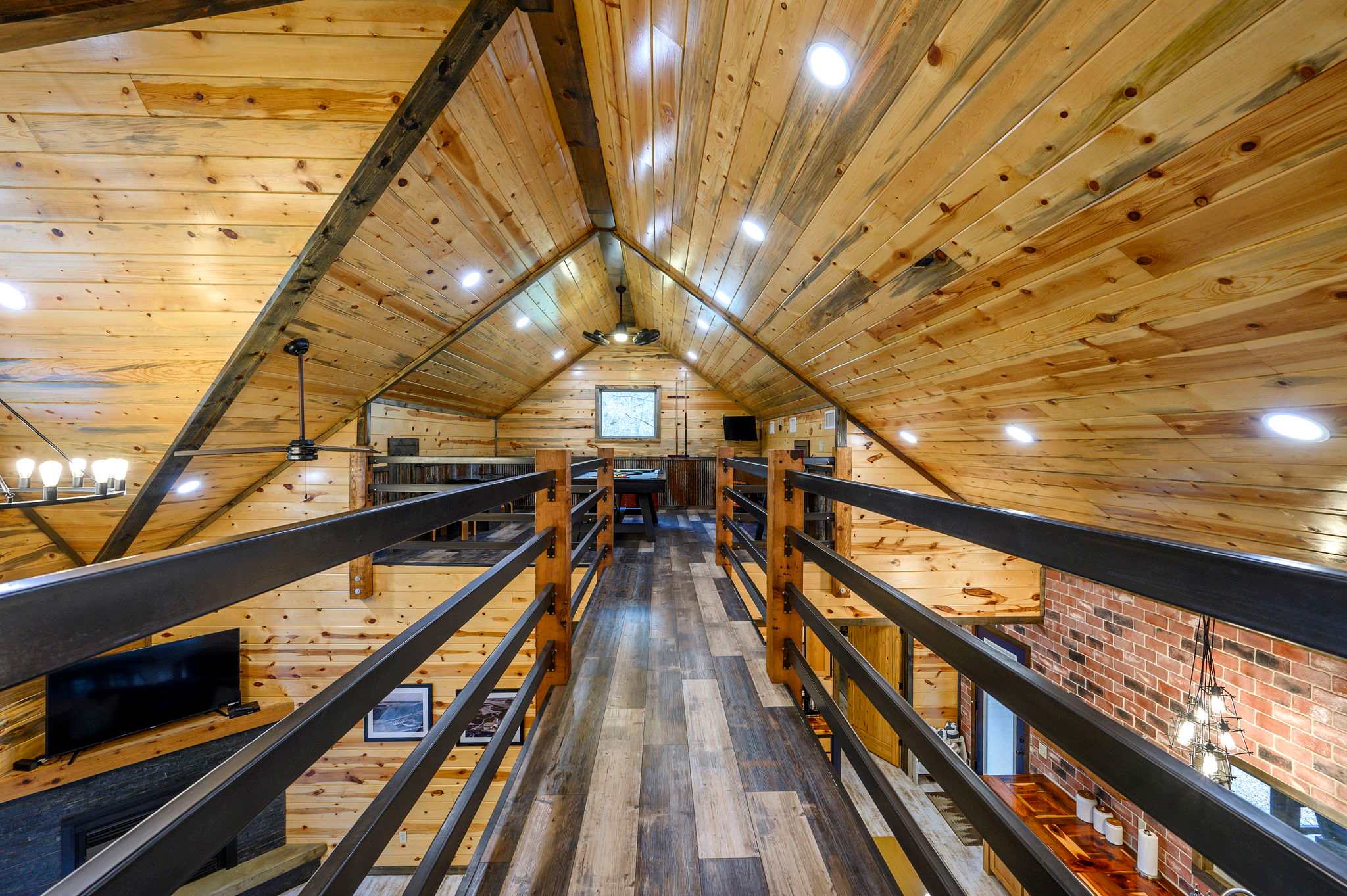Inside, the open-concept kitchen, living, and dining area creates a warm and inviting place to gather. The kitchen features stainless steel appliances, a brick wall accent, island stove, and counter seating for three, along with both Keurig and traditional coffee options for easy mornings. Just beyond, the dining table for six offers a comfortable spot for shared meals. The living room opens up with comfy leather furniture, a smart TV, and large windows that overlook the front yard, filling the space with natural light. Above the main space, a catwalk leads to the lofted game room, adding both character and entertainment to the home. This fun-filled space includes a smart TV, pool table, shuffleboard, and a video game setup, creating the perfect hangout for all ages.