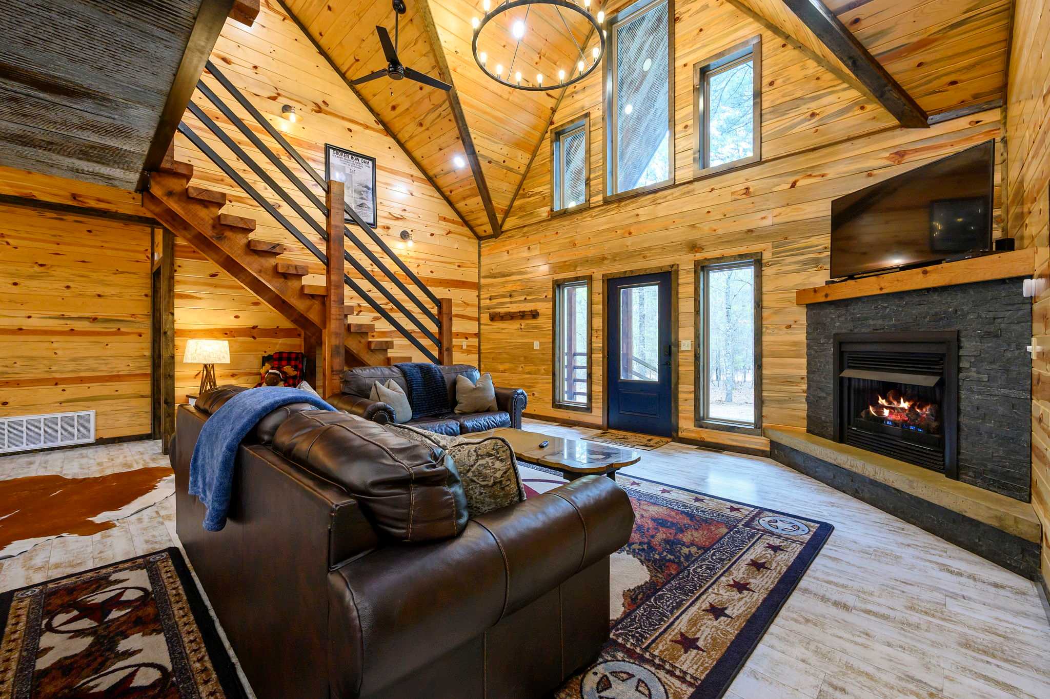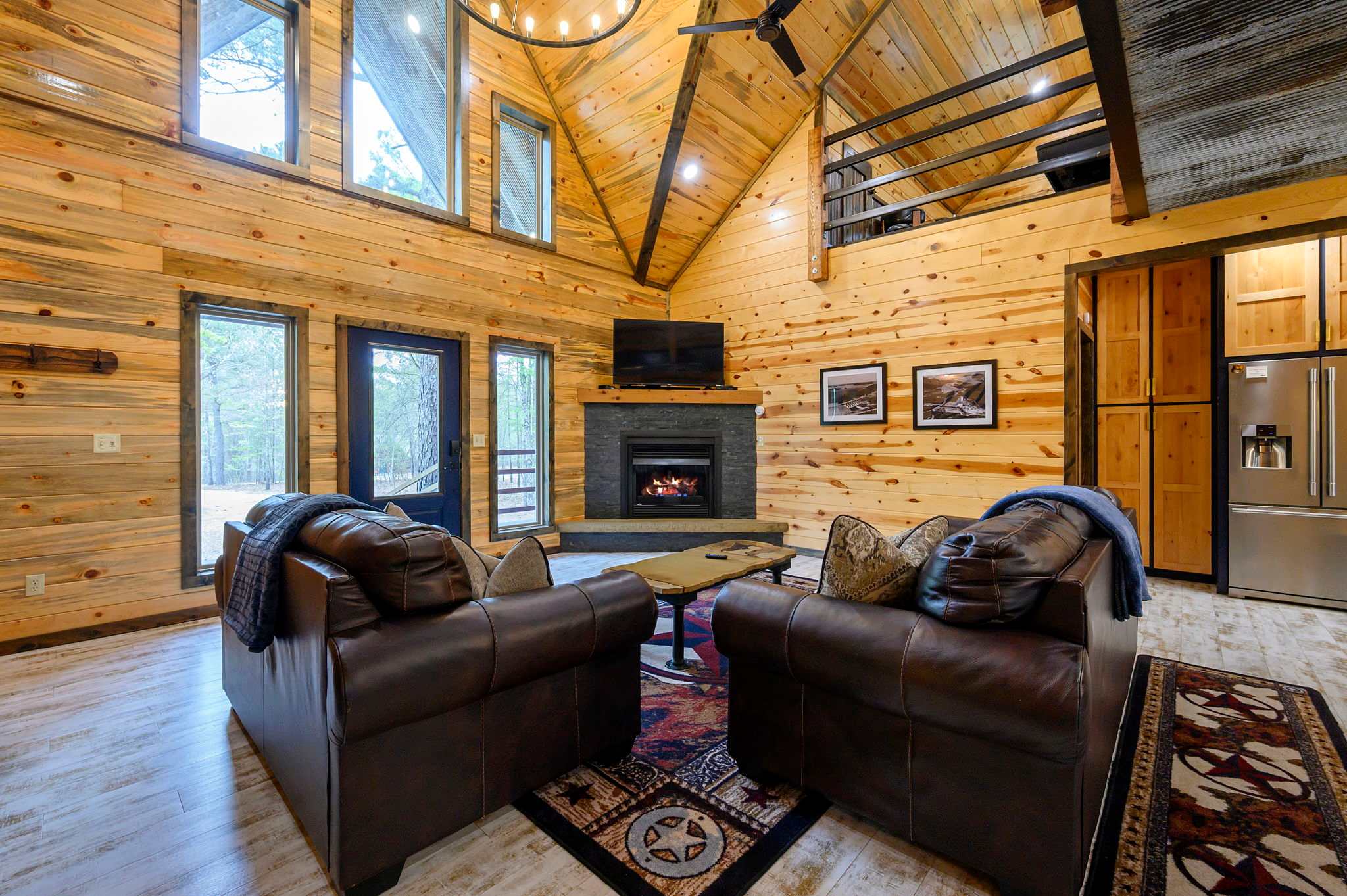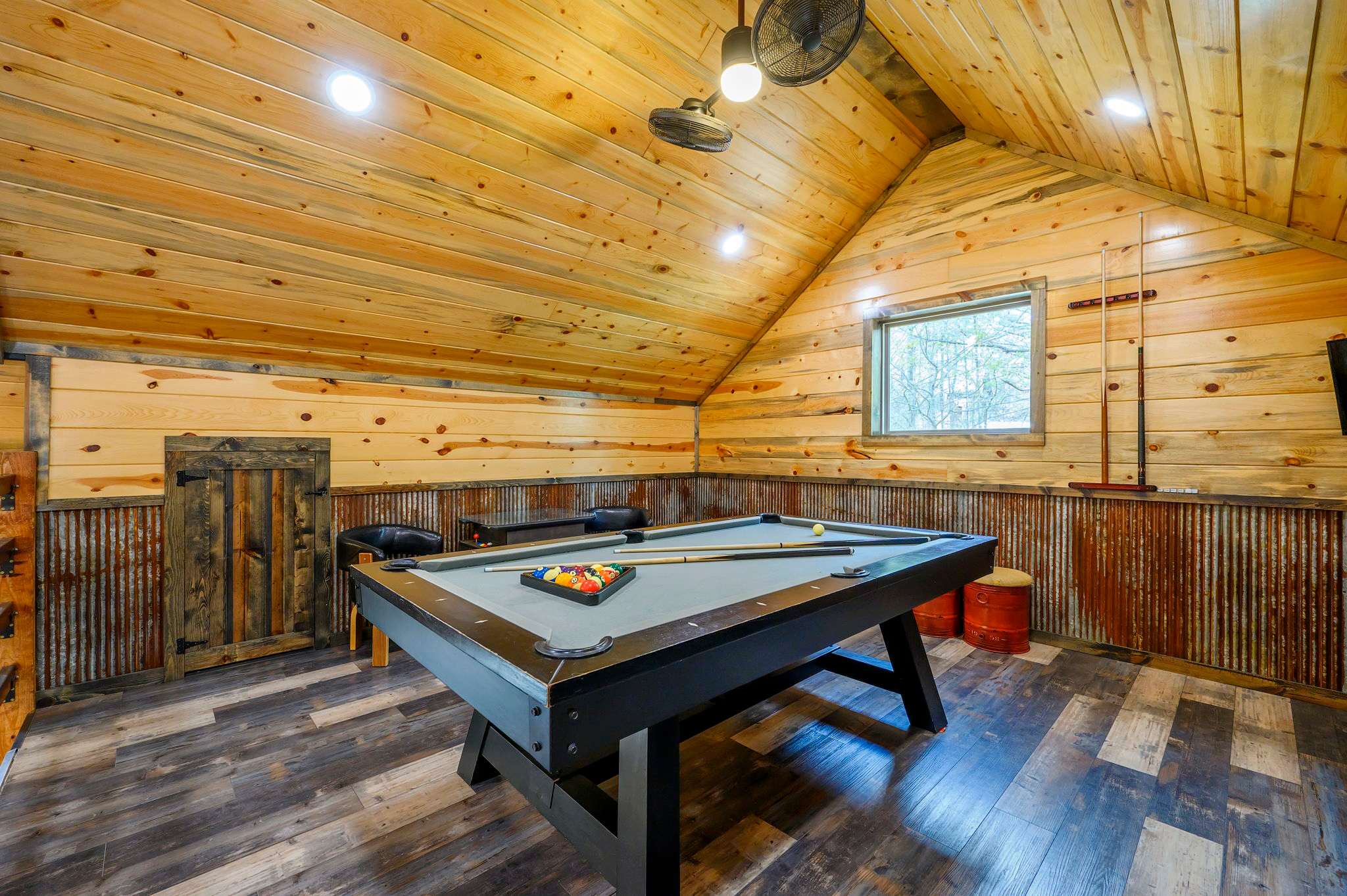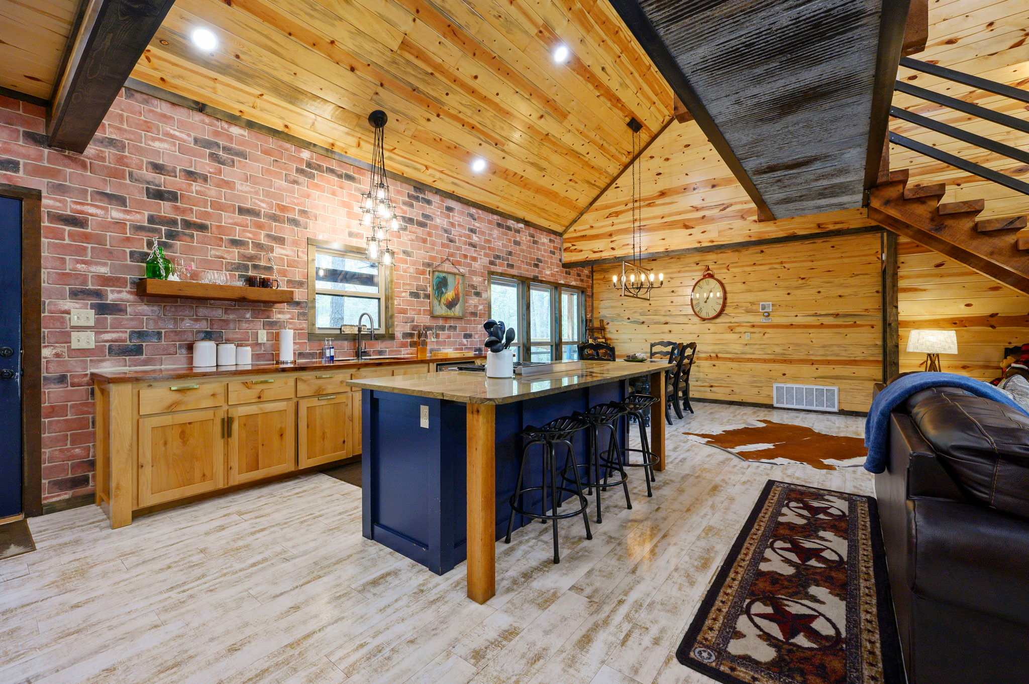Inside, the open-concept kitchen, living, and dining area creates a warm and inviting place to gather. The kitchen features stainless steel appliances, a brick wall accent, island stove, and counter seating for three, along with both Keurig and traditional coffee options for easy mornings. Just beyond, the dining table for six offers a comfortable spot for shared meals. The living room opens up with comfy leather furniture, a smart TV, and large windows that overlook the front yard, filling the space with natural light. Above the main space, a catwalk leads to the lofted game room, adding both character and entertainment to the home. This fun-filled space includes a smart TV, pool table, shuffleboard, and a video game setup, creating the perfect hangout for all ages.