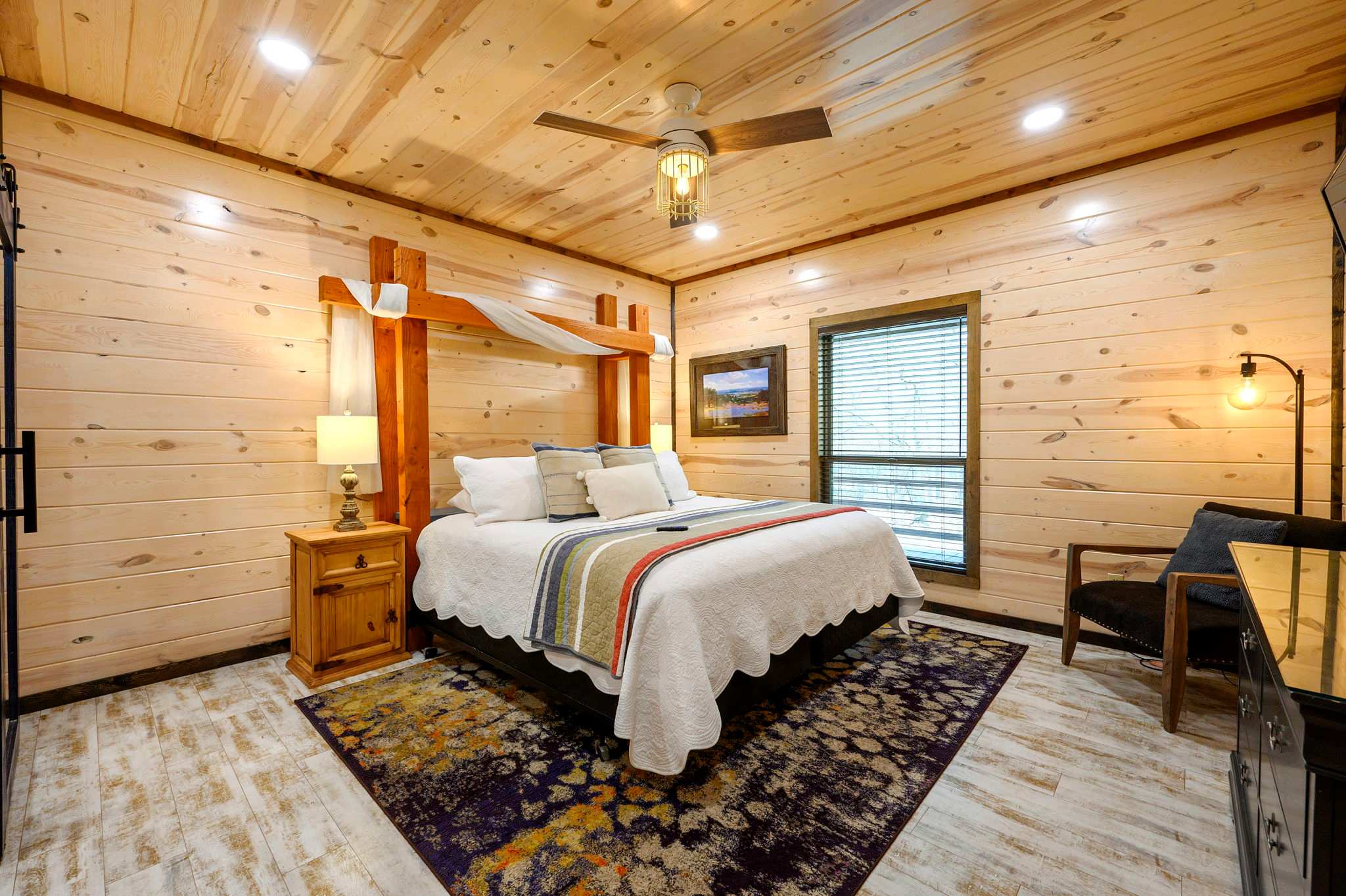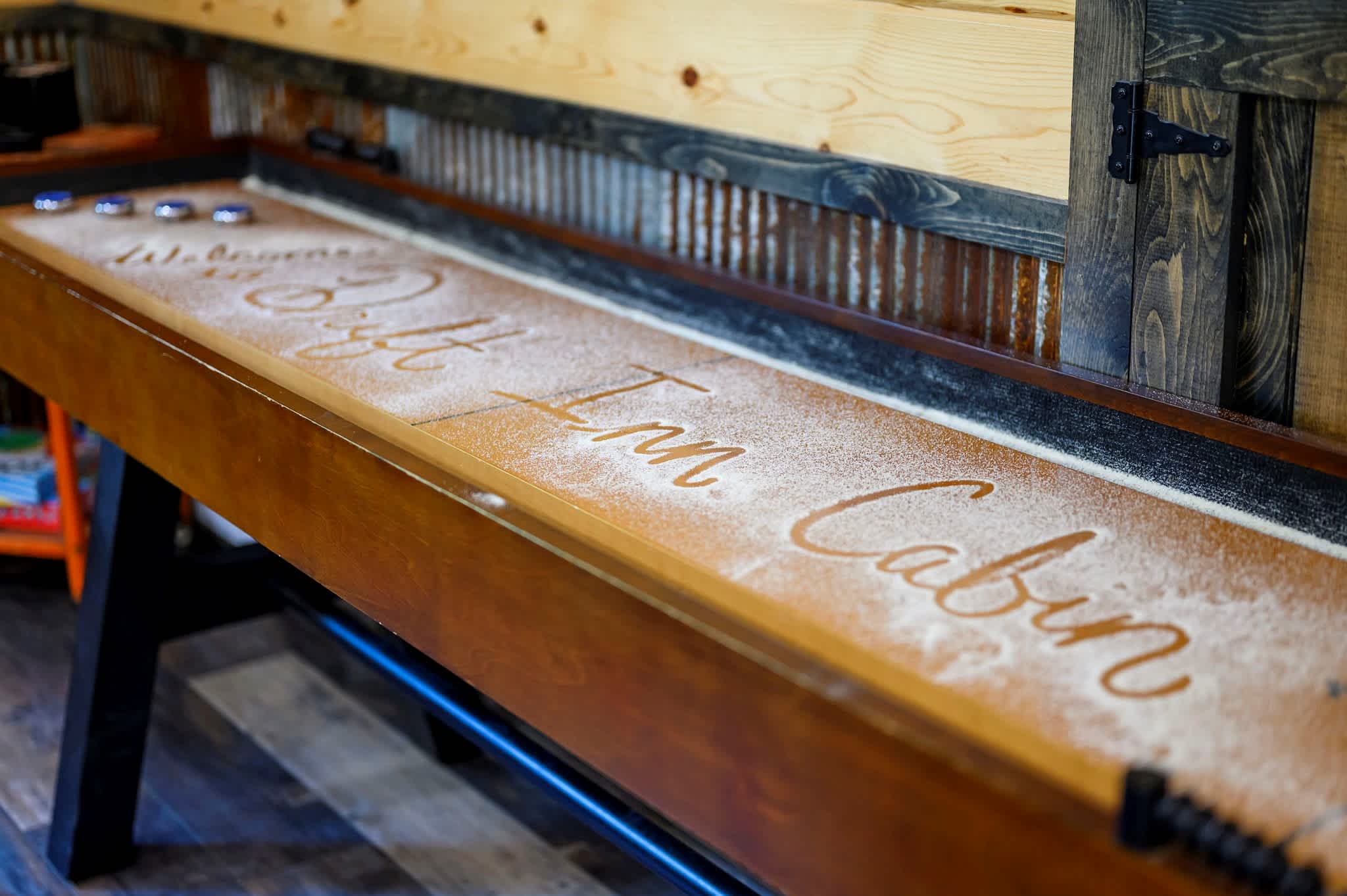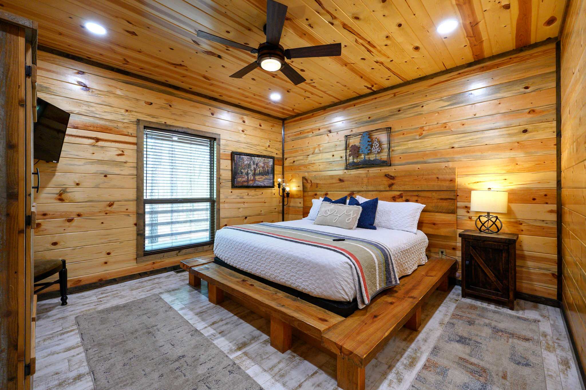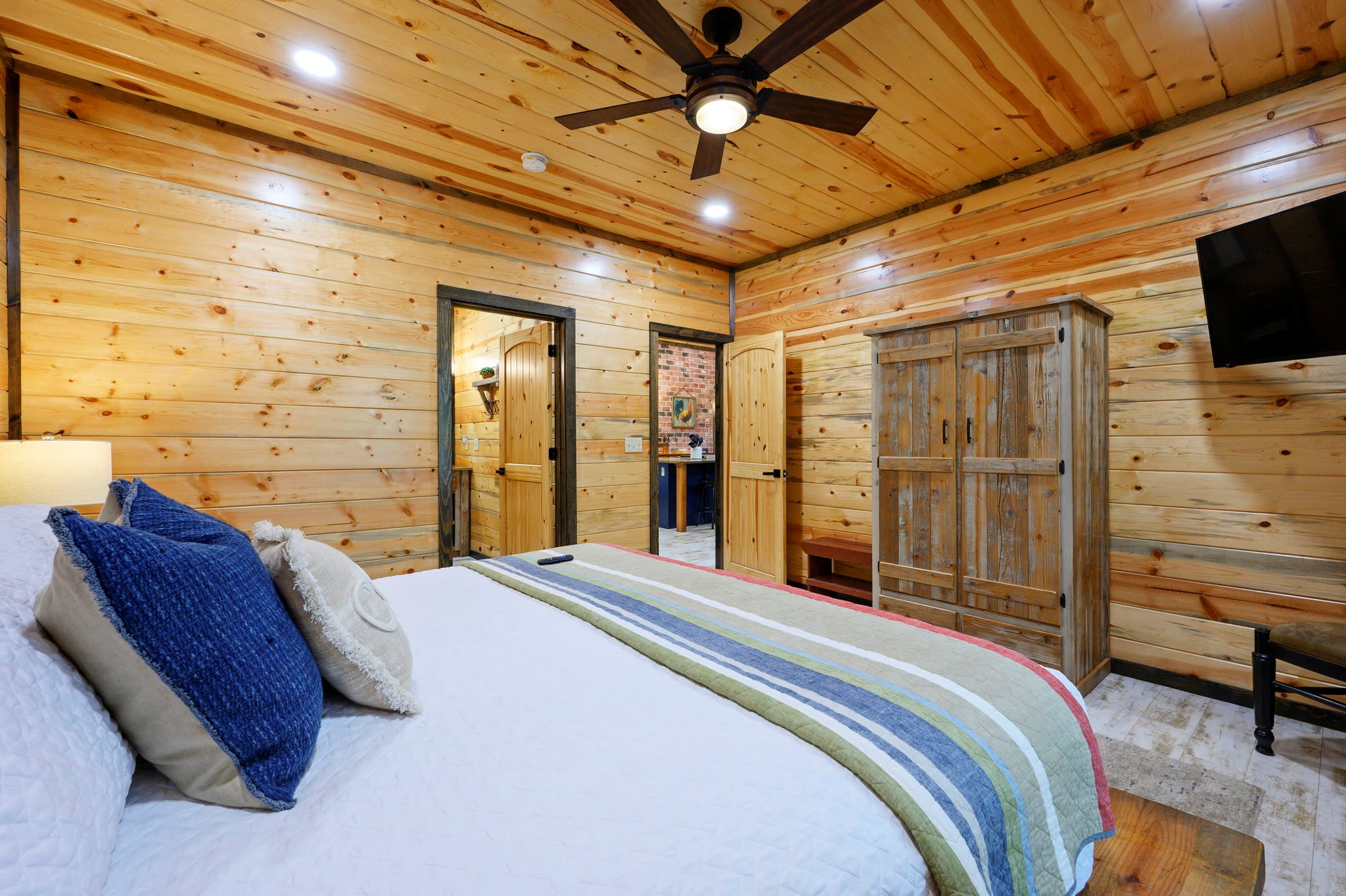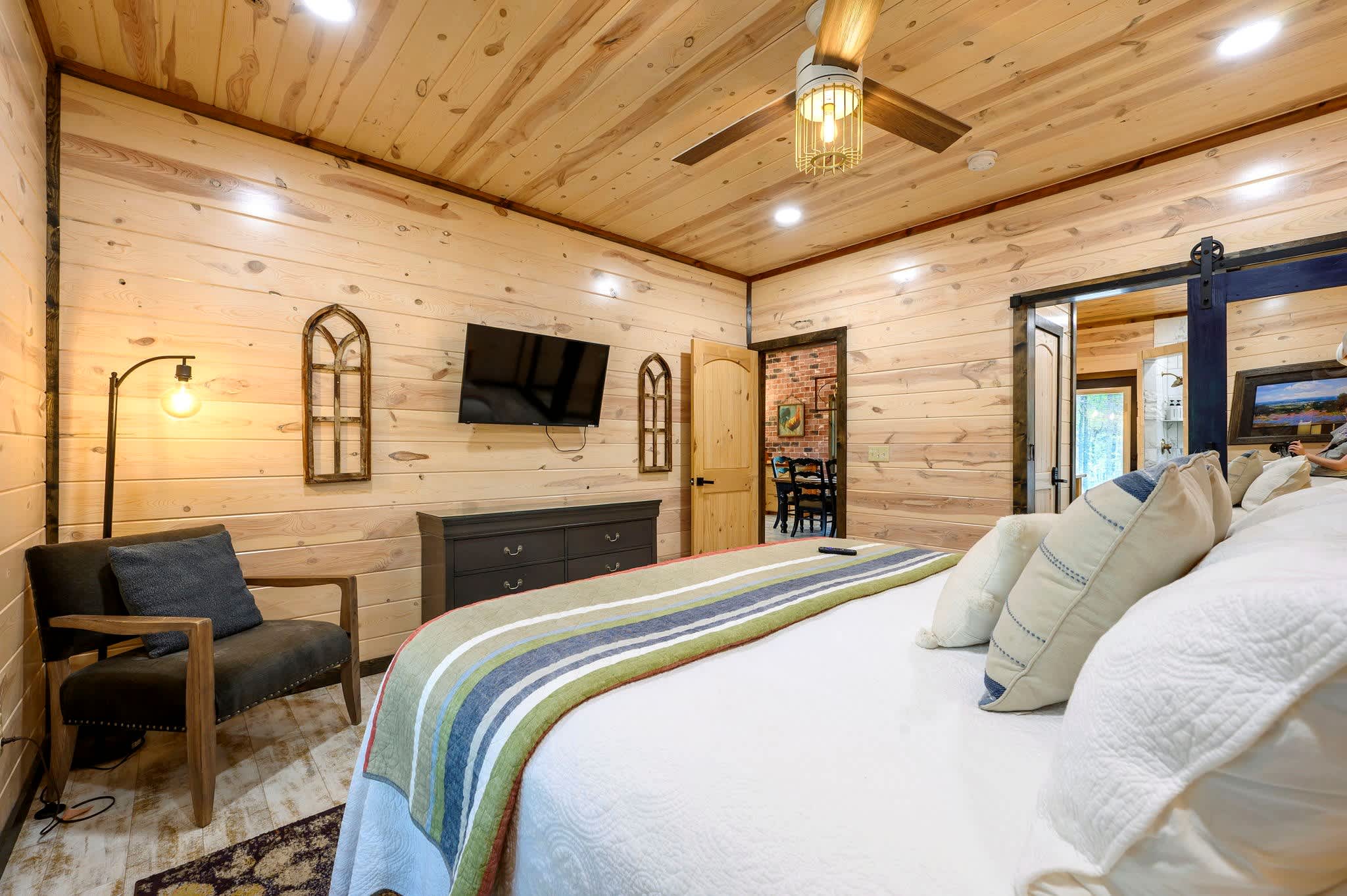Inside, the open-concept kitchen, living, and dining area creates a warm and inviting place to gather. The kitchen features stainless steel appliances, a brick wall accent, island stove, and counter seating for three, along with both Keurig and traditional coffee options for easy mornings. Just beyond, the dining table for six offers a comfortable spot for shared meals. The living room opens up with comfy leather furniture, a smart TV, and large windows that overlook the front yard, filling the space with natural light. Above the main space, a catwalk leads to the lofted game room, adding both character and entertainment to the home. This fun-filled space includes a smart TV, pool table, shuffleboard, and a video game setup, creating the perfect hangout for all ages.