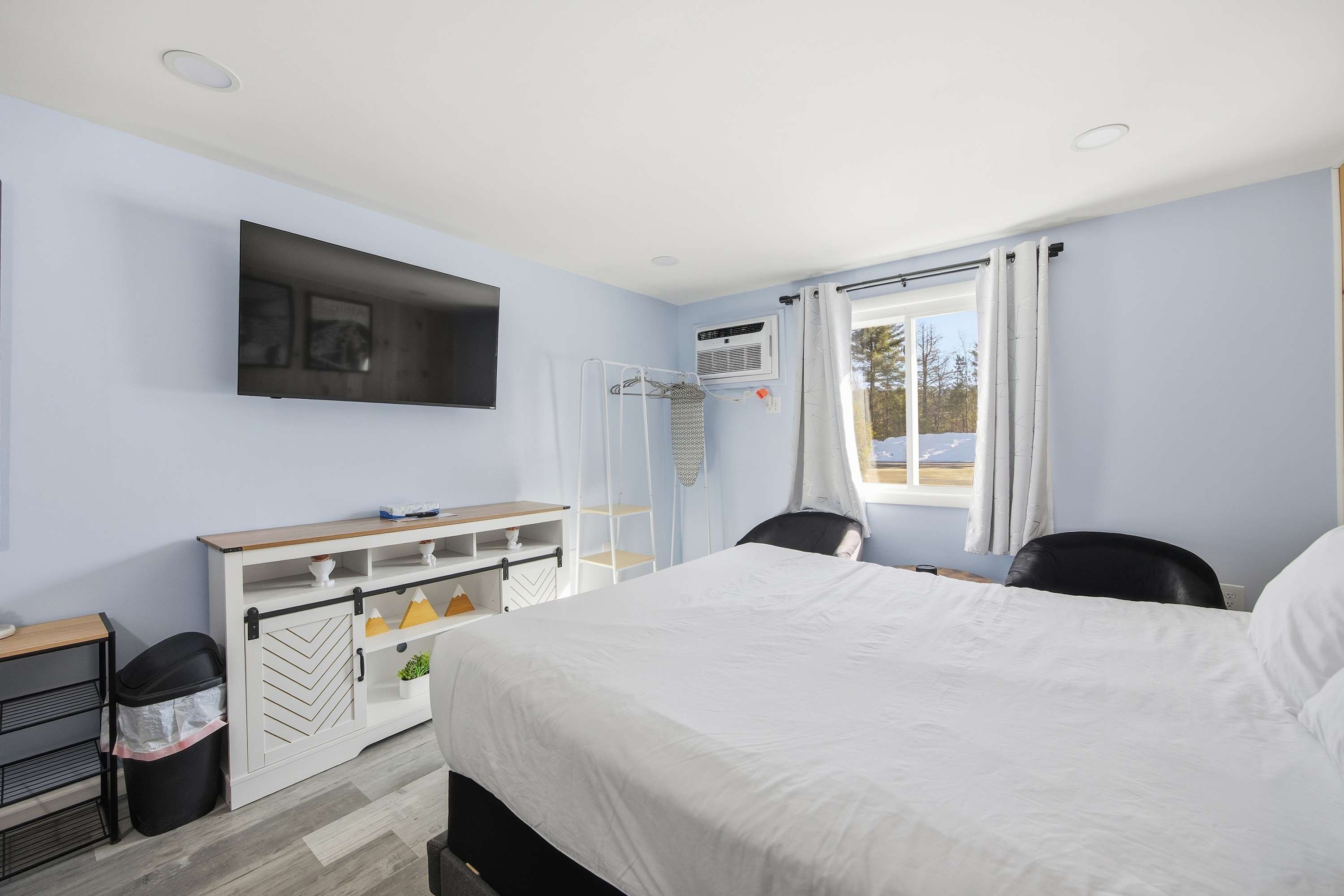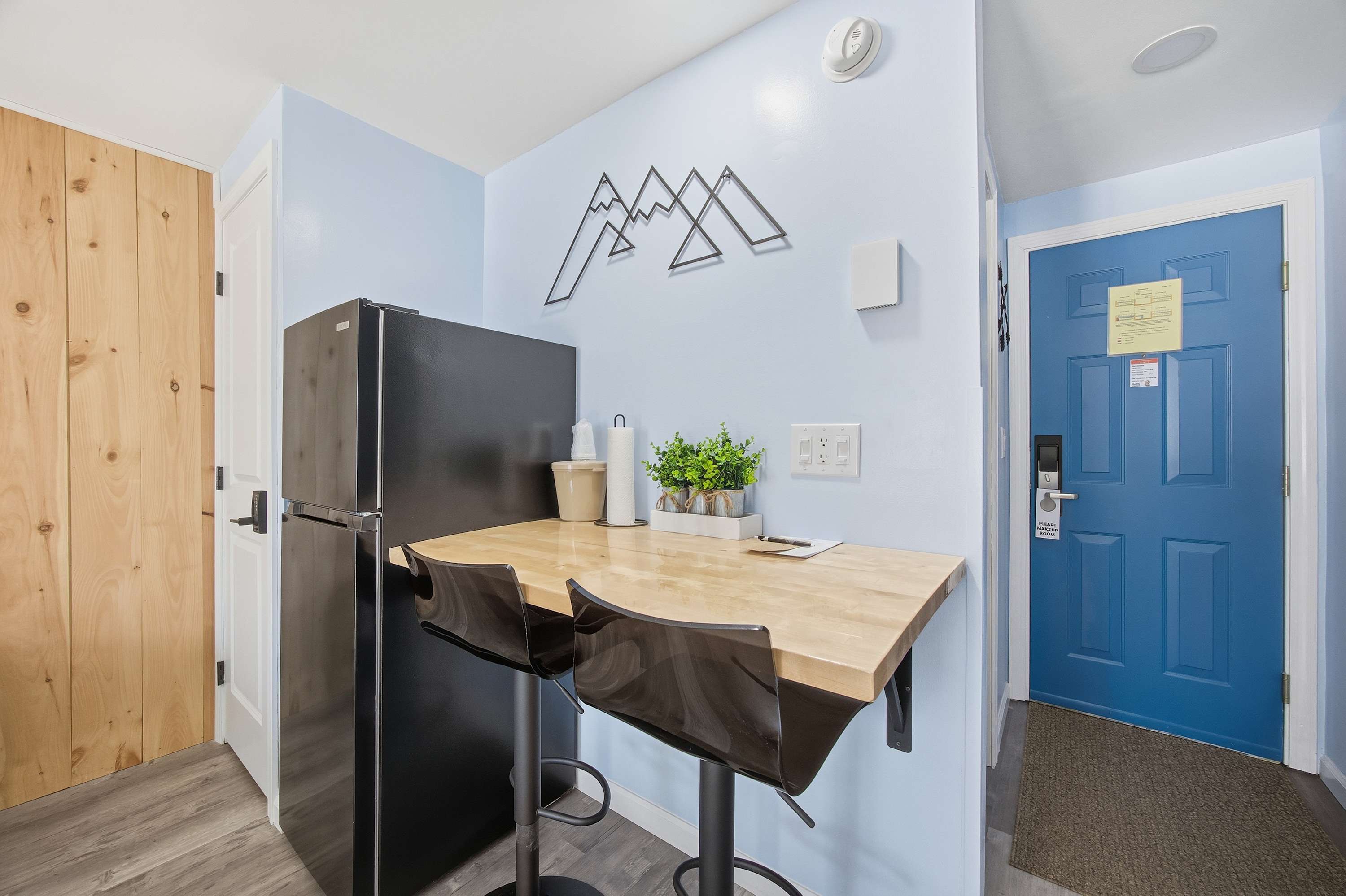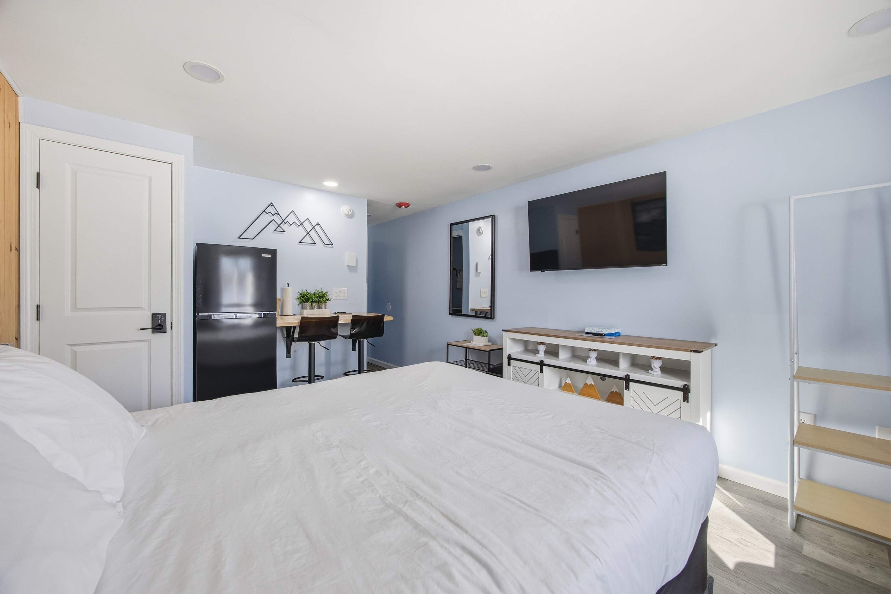 Inside, this comfortable hotel-style studio offers a relaxed and functional space for your stay. Unwind with cable TV after a day of adventure, or sip your morning coffee at the small high-top table tucked neatly into the room. A full size fridge and microwave provide simple meal and snack options, perfect for quick getaways or guests planning to dine out. Clean, practical, and welcoming, this studio serves as a cozy place to recharge between outings.