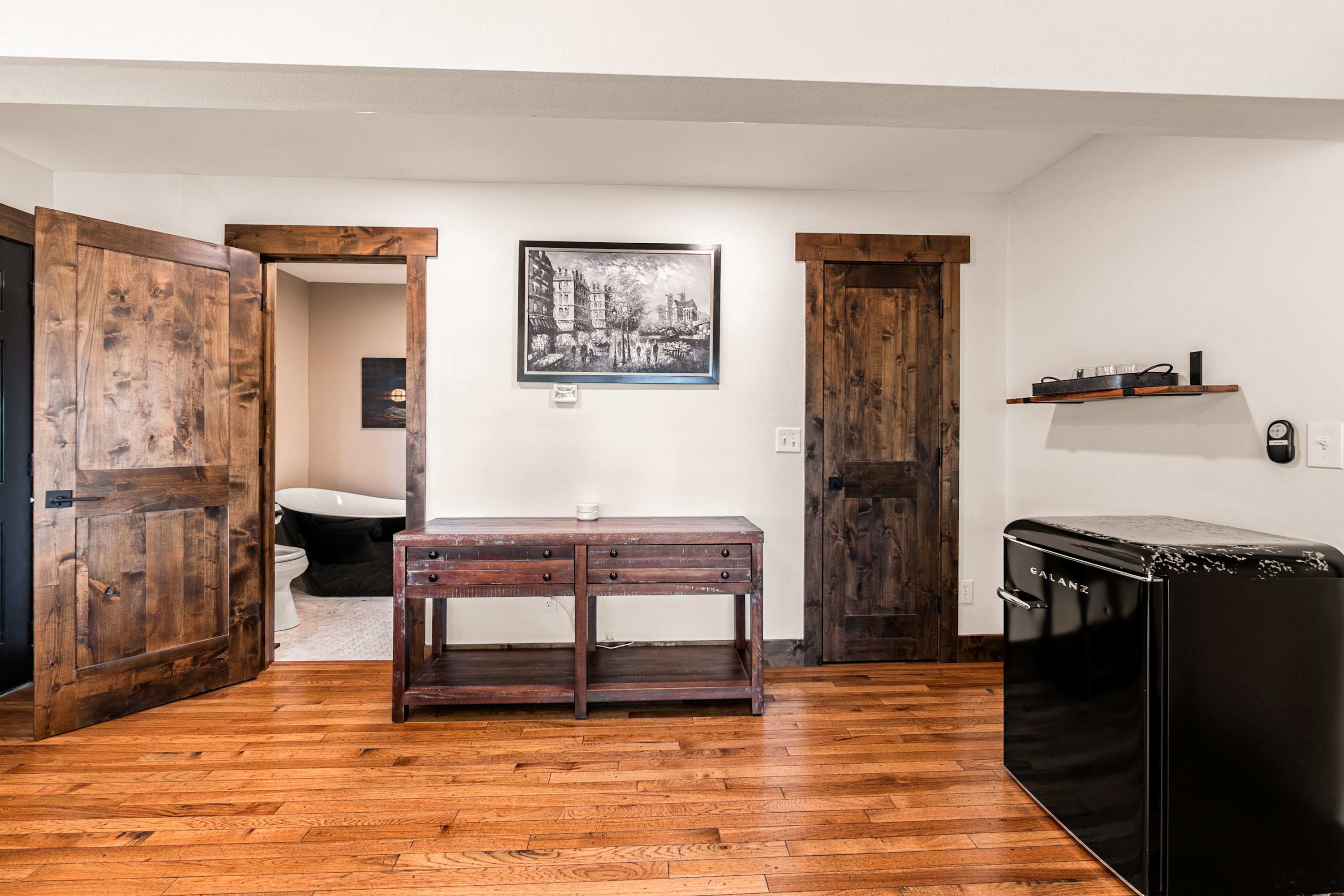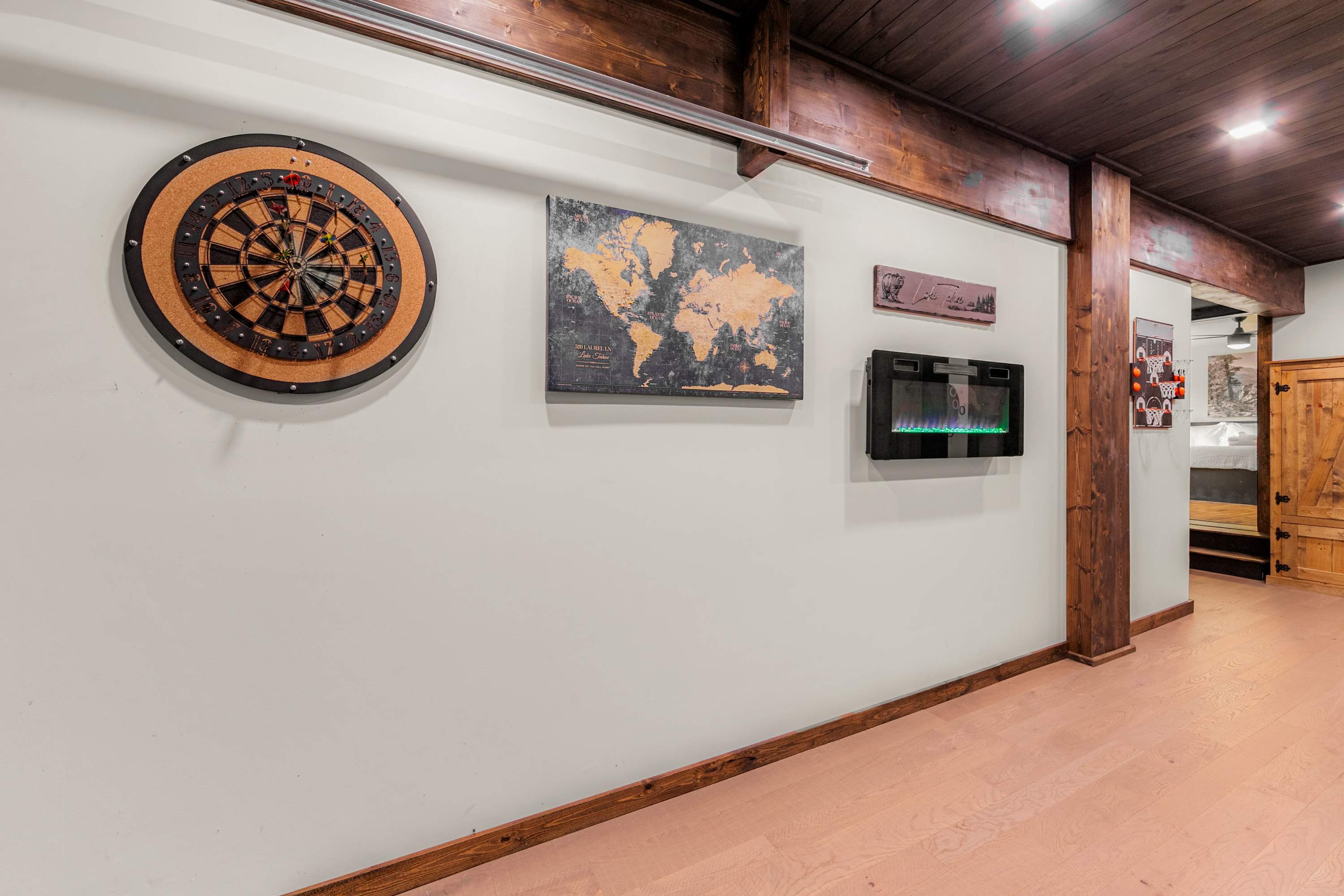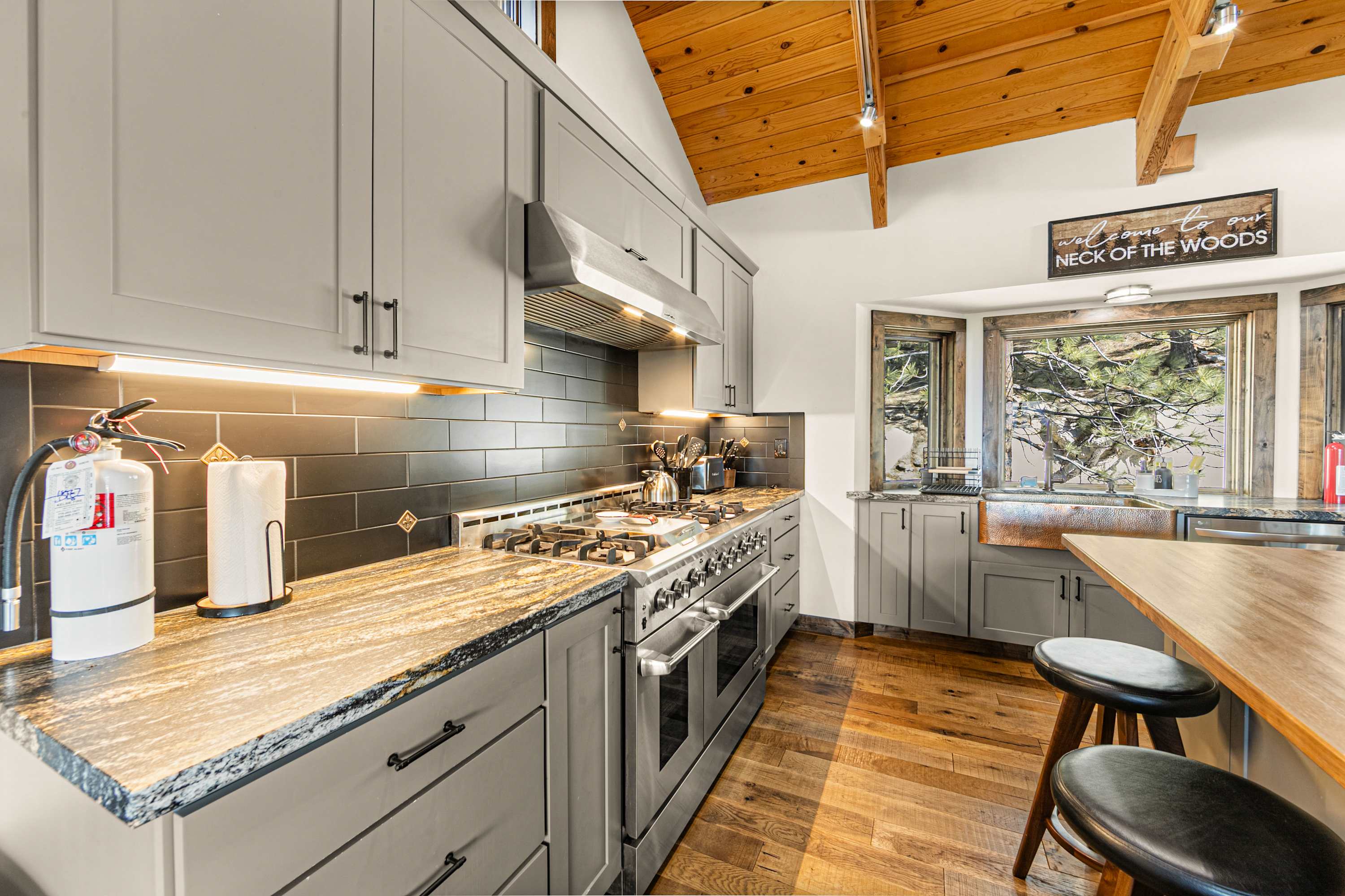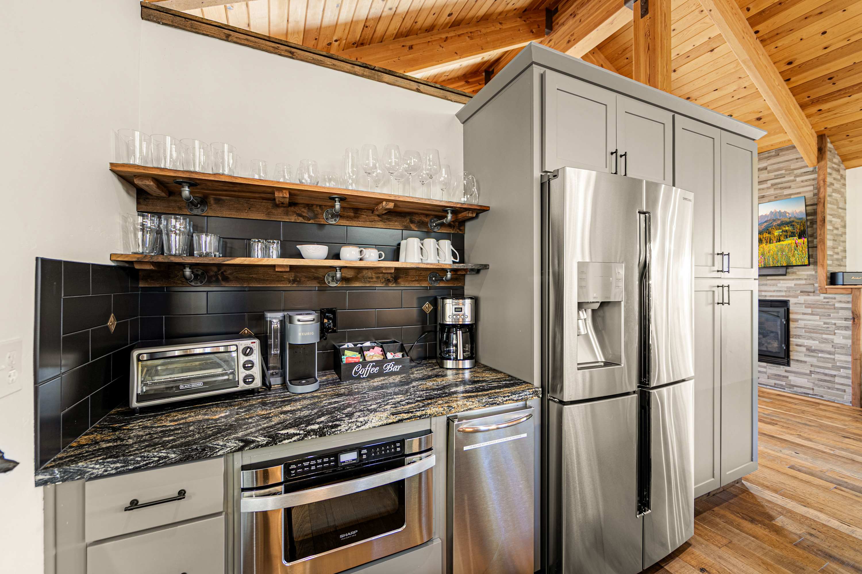 Inside, the main living spaces are located on the third level, where high vaulted ceilings and abundant natural light create an airy, elevated feel. The living room invites you to unwind with a large couch that seats six, a cozy loveseat, and a gas fireplace, all centered around a smart TV for relaxing evenings. The open-concept layout flows seamlessly into the updated kitchen, featuring a spacious design with a huge six-burner oven, two coffee pots for easy mornings, and seating for four at the kitchen island. A nearby dining area for four offers a comfortable spot for meals while keeping everyone connected.