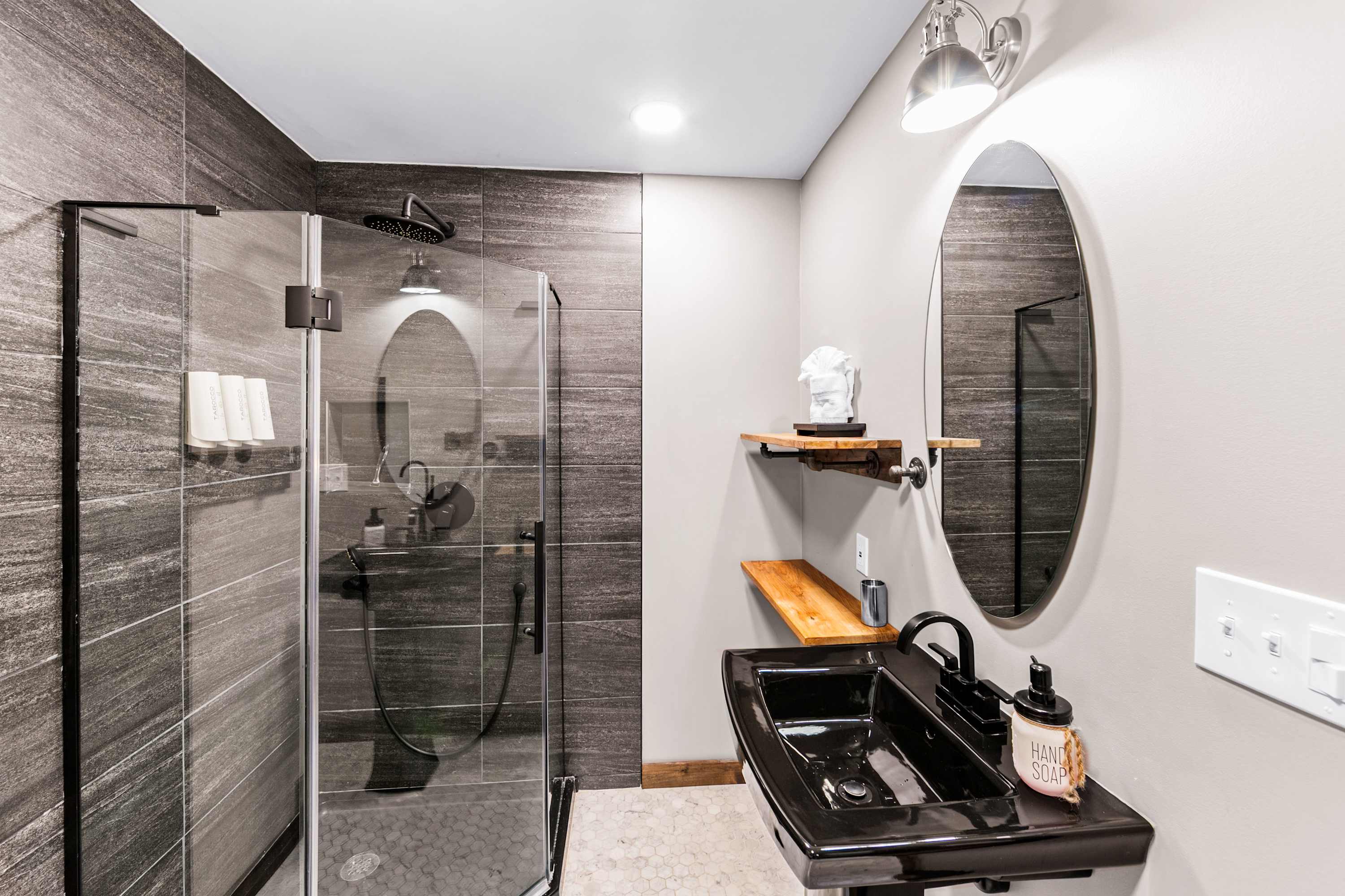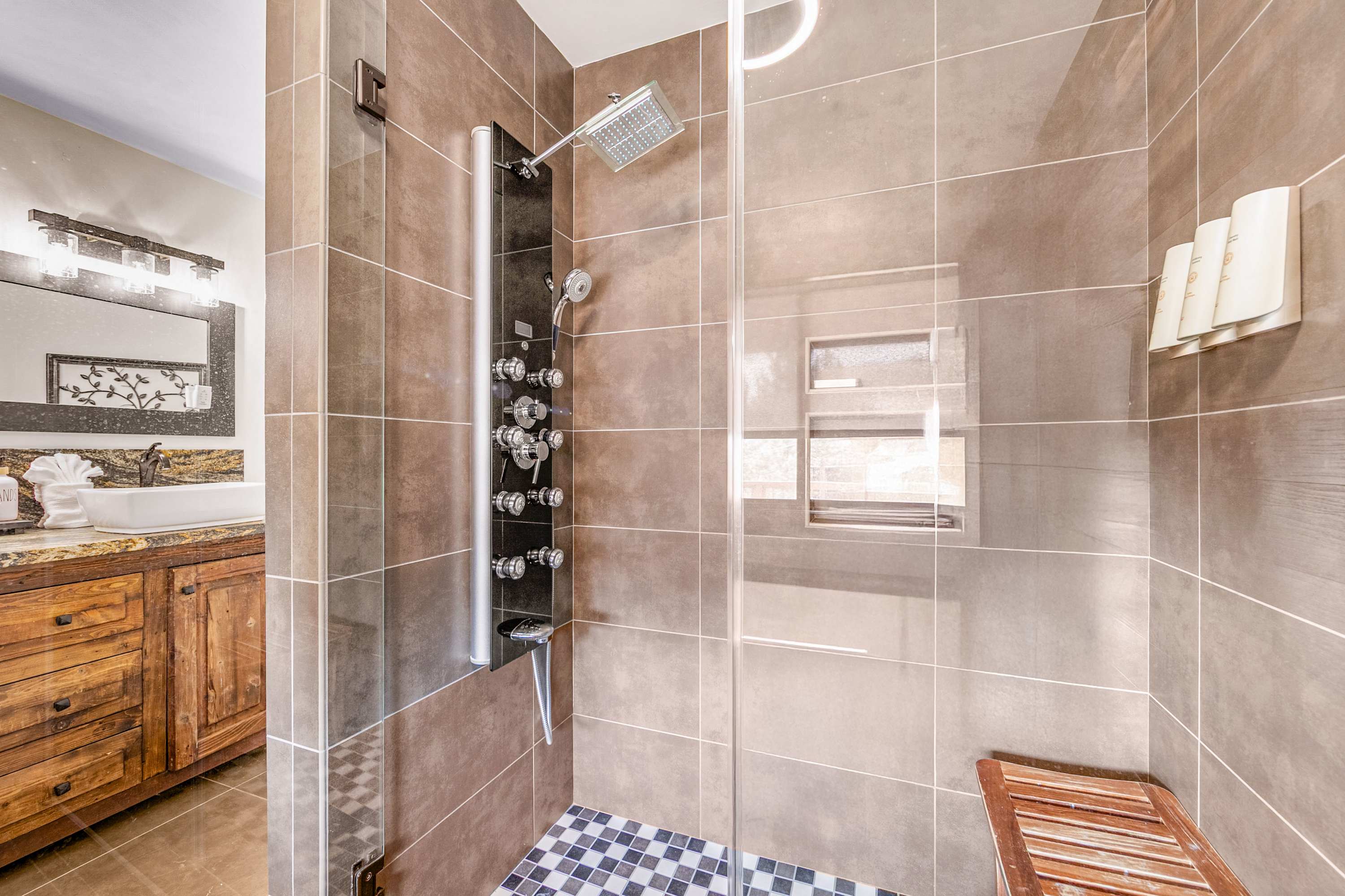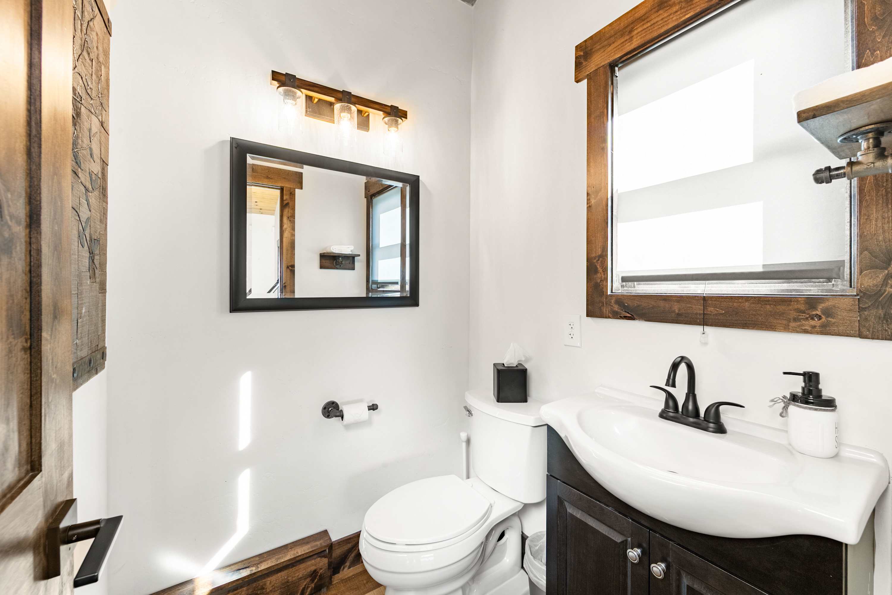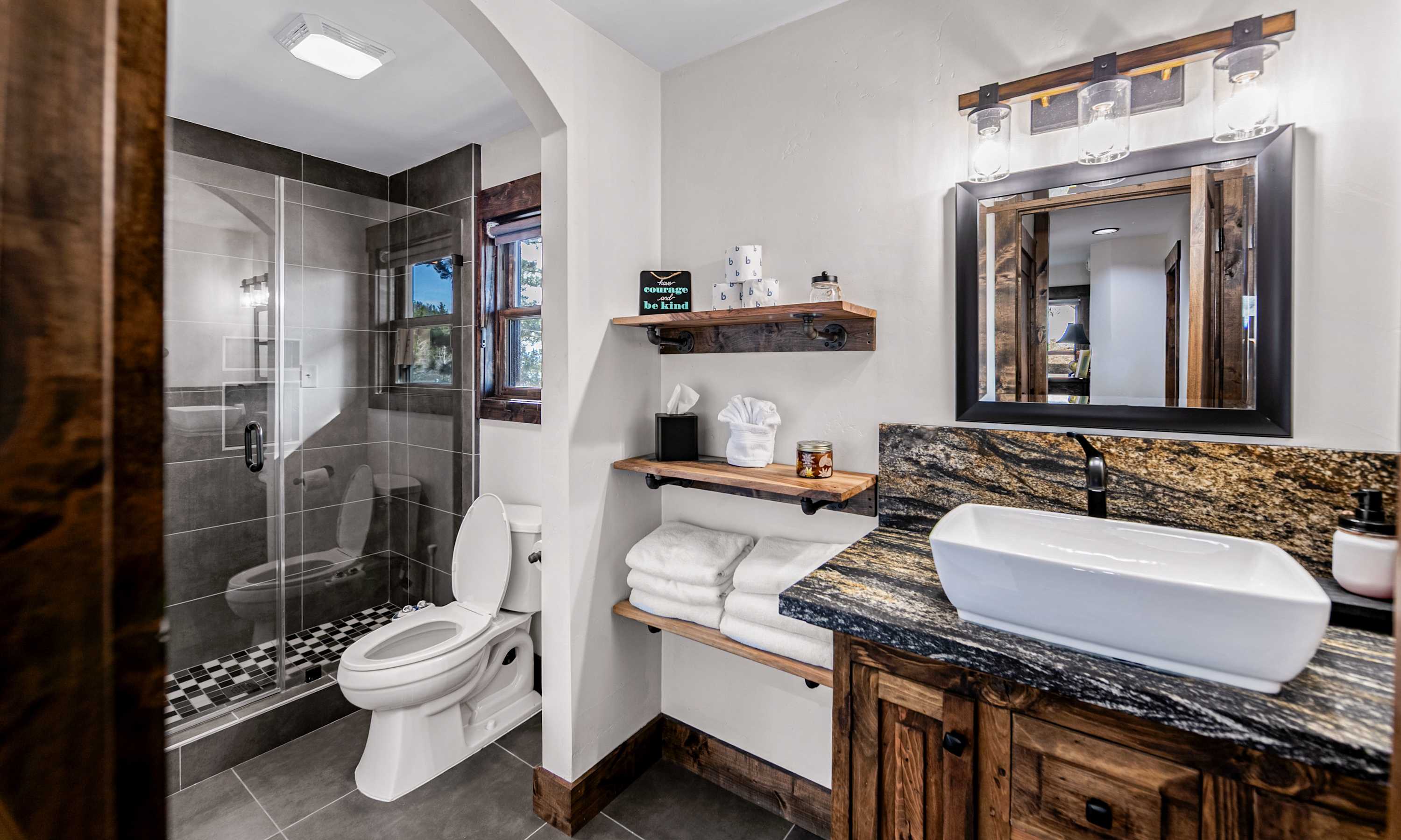 This home includes a half bathroom and an additional full guest bathroom with a single vanity and a walk-in shower.
