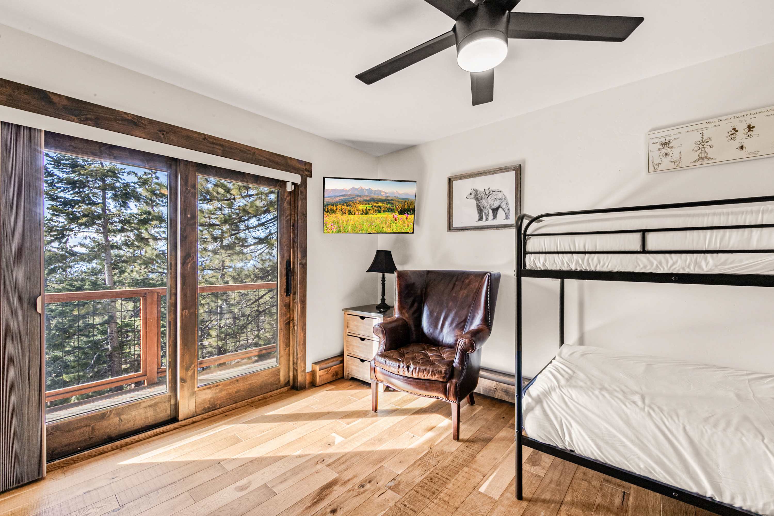 Bedroom #3 includes 2 sets of twin-over-twin size bunk beds, a smart TV, and balcony access.