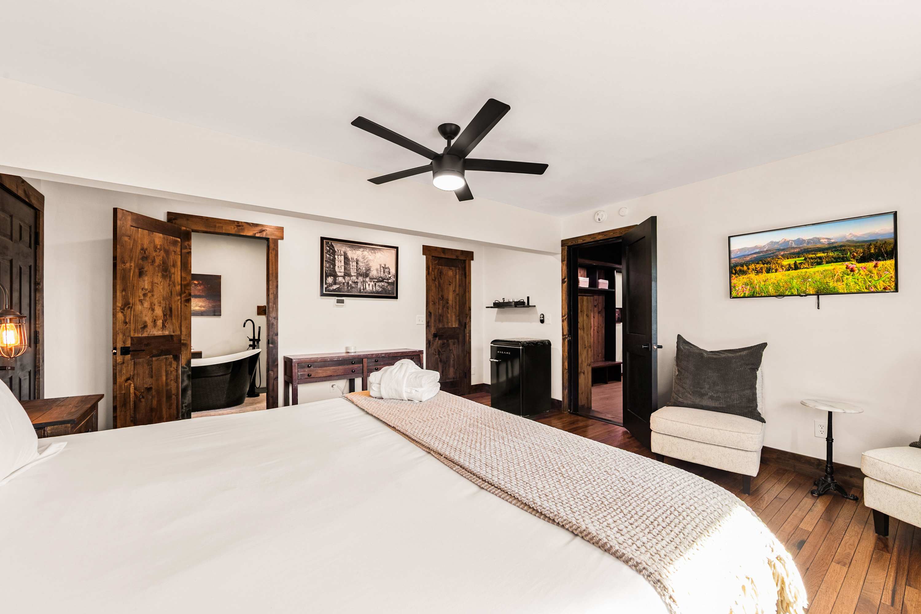 Bedroom #4 includes a queen size bed, a smart TV, and an ensuite bathroom with a single vanity, a soaking tub, and a walk-in shower.