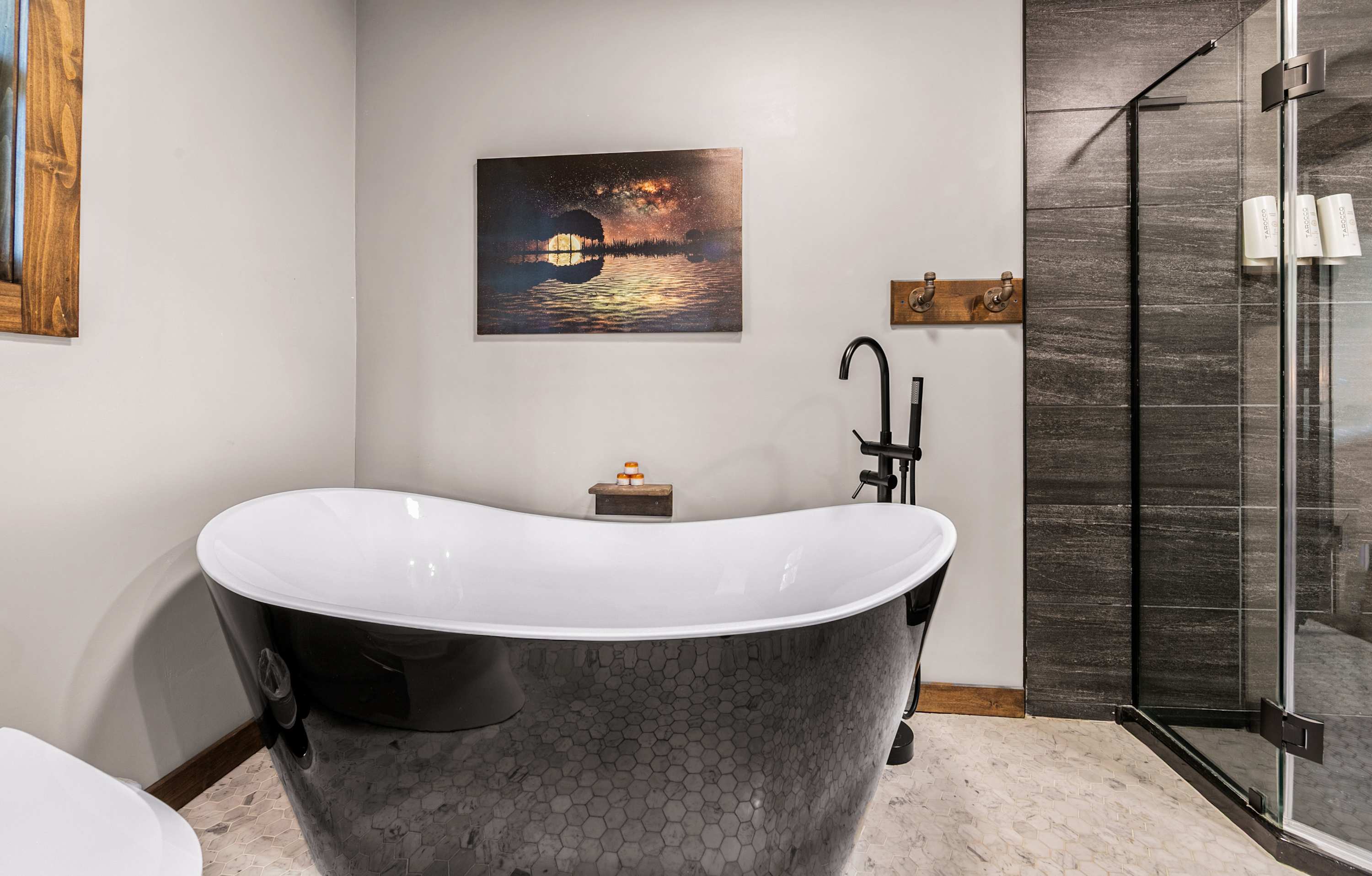 Bedroom #1 includes a king size bed, a smart TV, a smart TV, deck access, and an ensuite bathroom with a dual vanity, a soaking tub, and a walk-in shower.