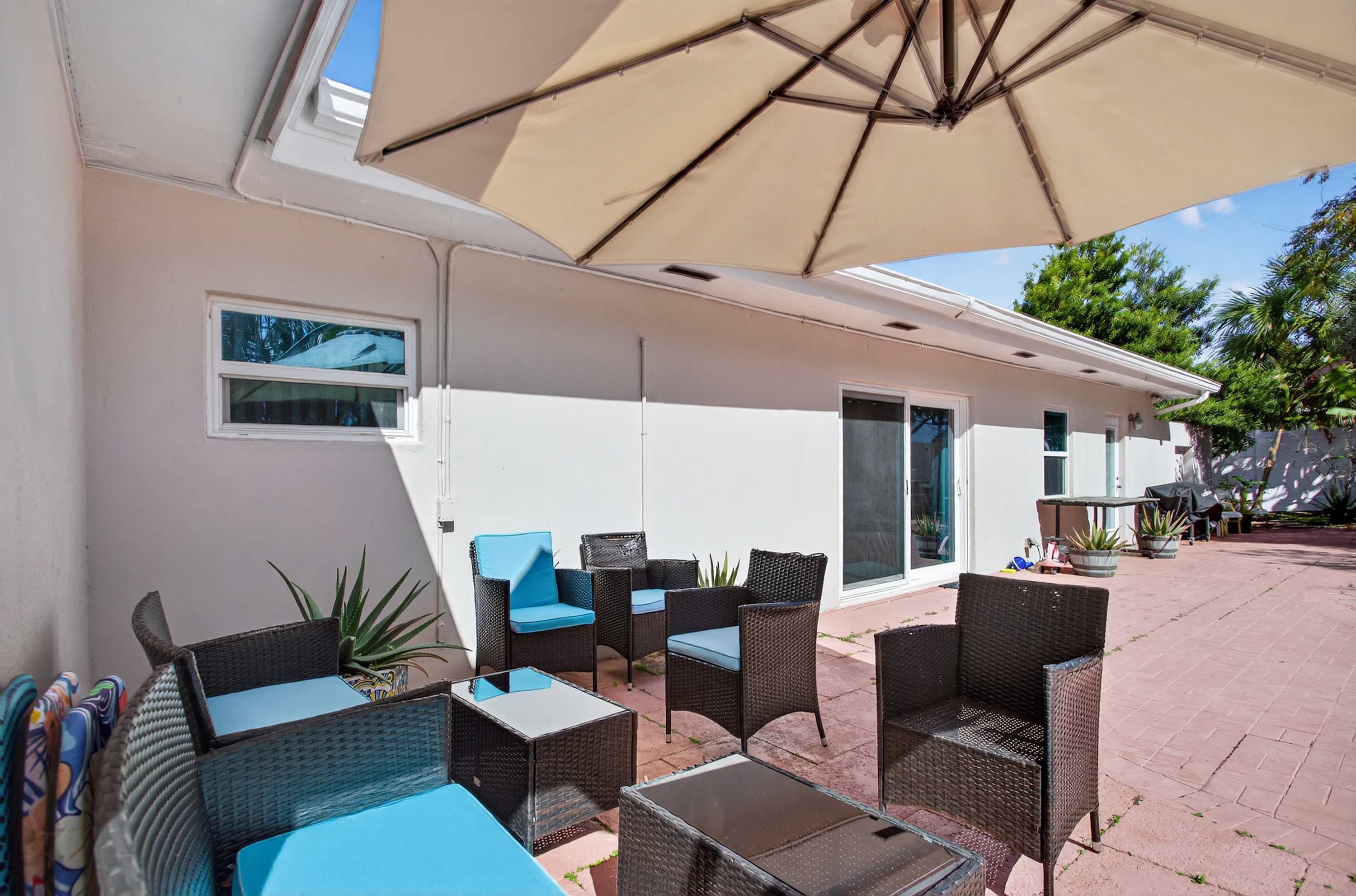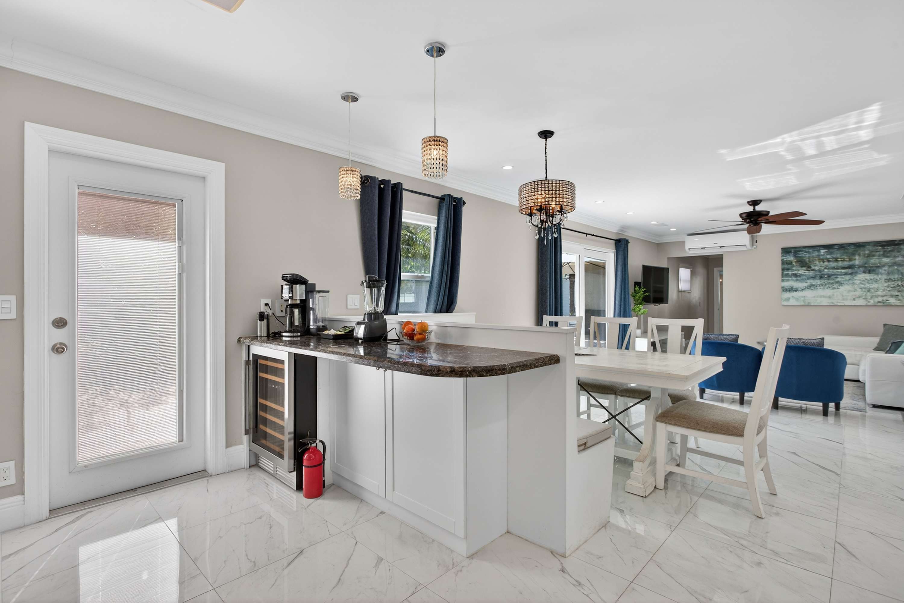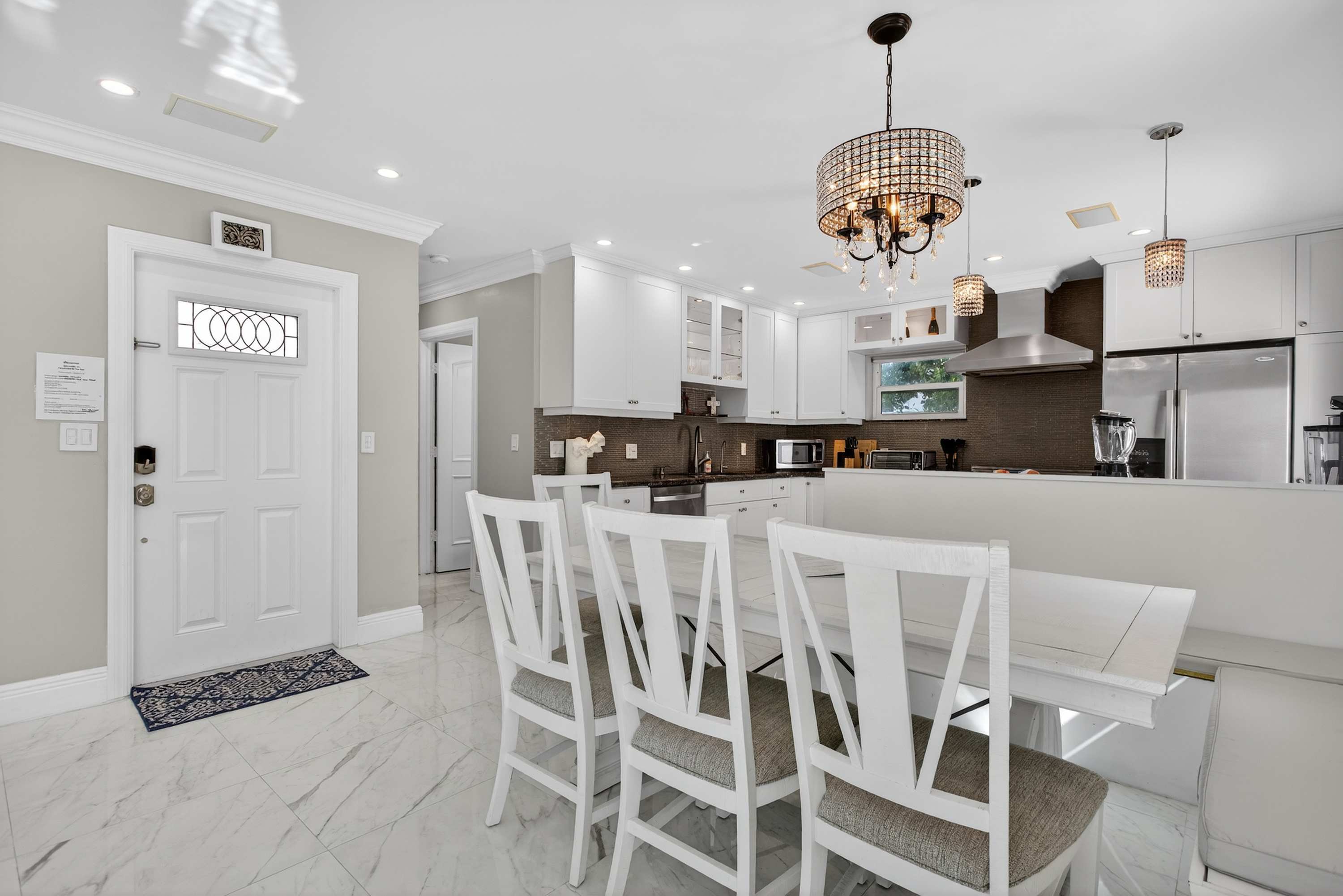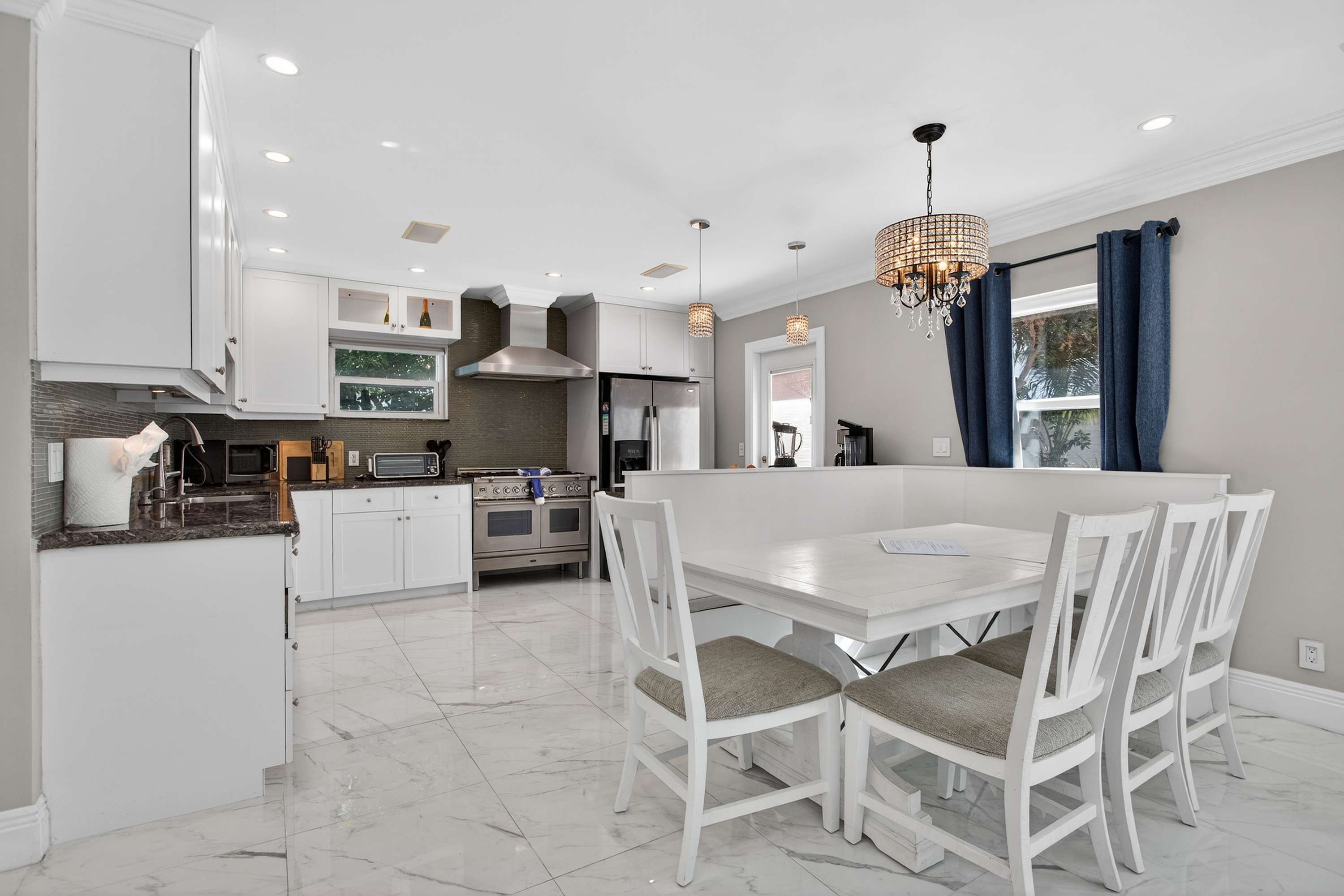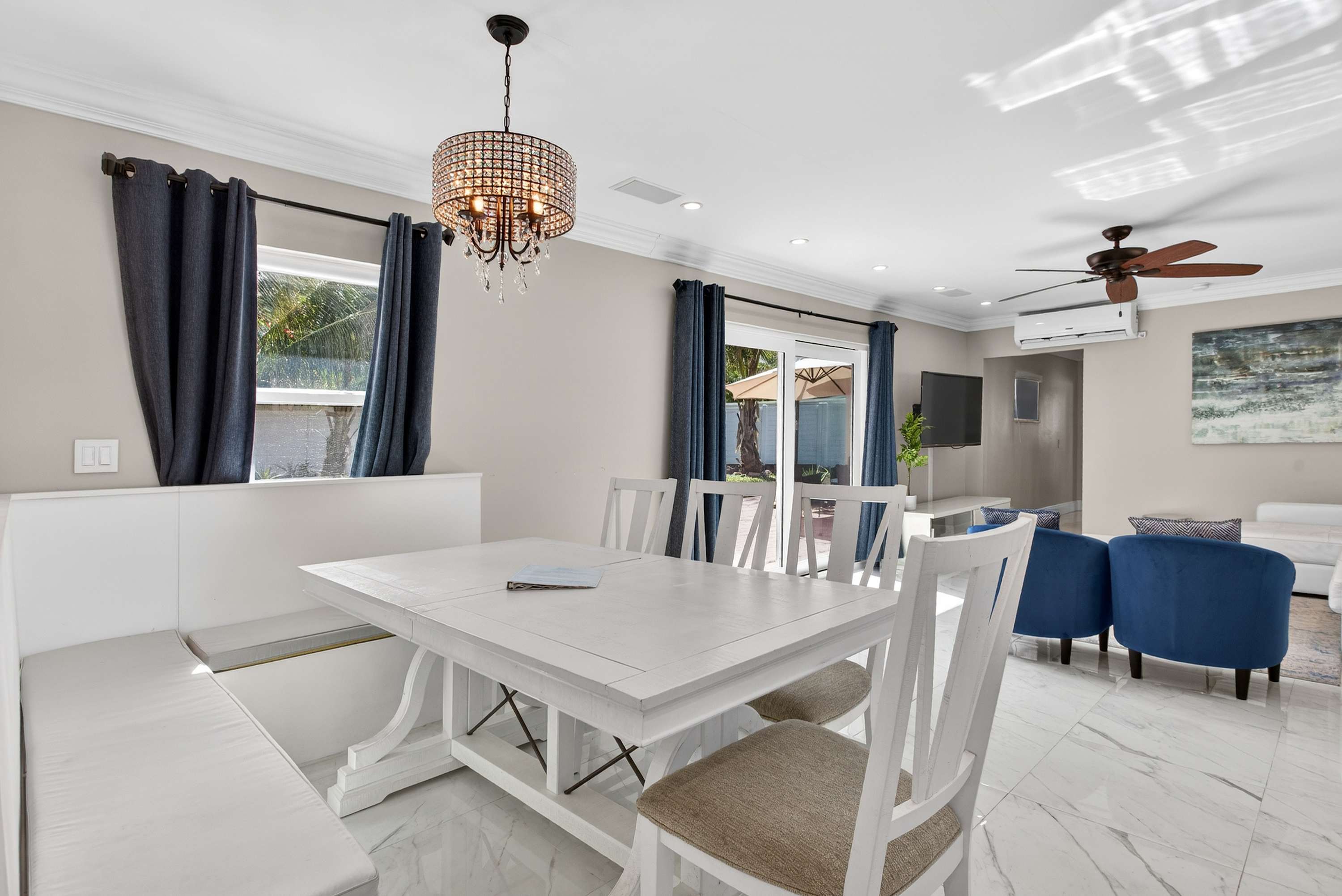 This inviting home offers a relaxed South Florida lifestyle with comfortable furnishings, a bright open layout, and thoughtfully designed spaces perfect for families or small groups. Inside, the spacious living area flows easily into the dining and kitchen spaces. The living room features a couch and chairs facing the smart TV, creating a comfortable spot to unwind after a day at the beach. Just beside it, a unique square dining booth wraps around the cabinetry with seating for six, ideal for shared meals or game nights. The kitchen is white, bright, and fully equipped with stone counters and a Keurig for easy mornings.