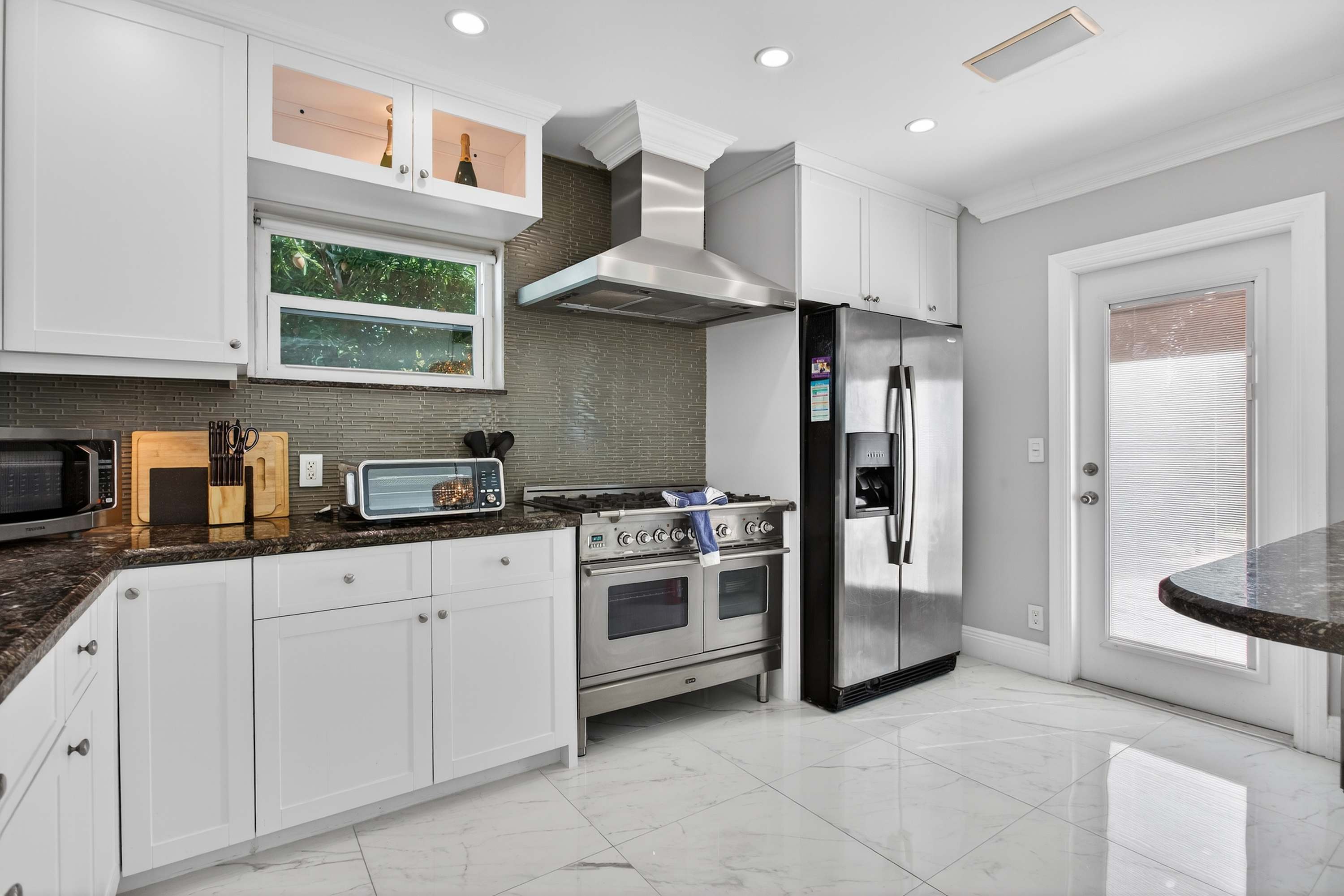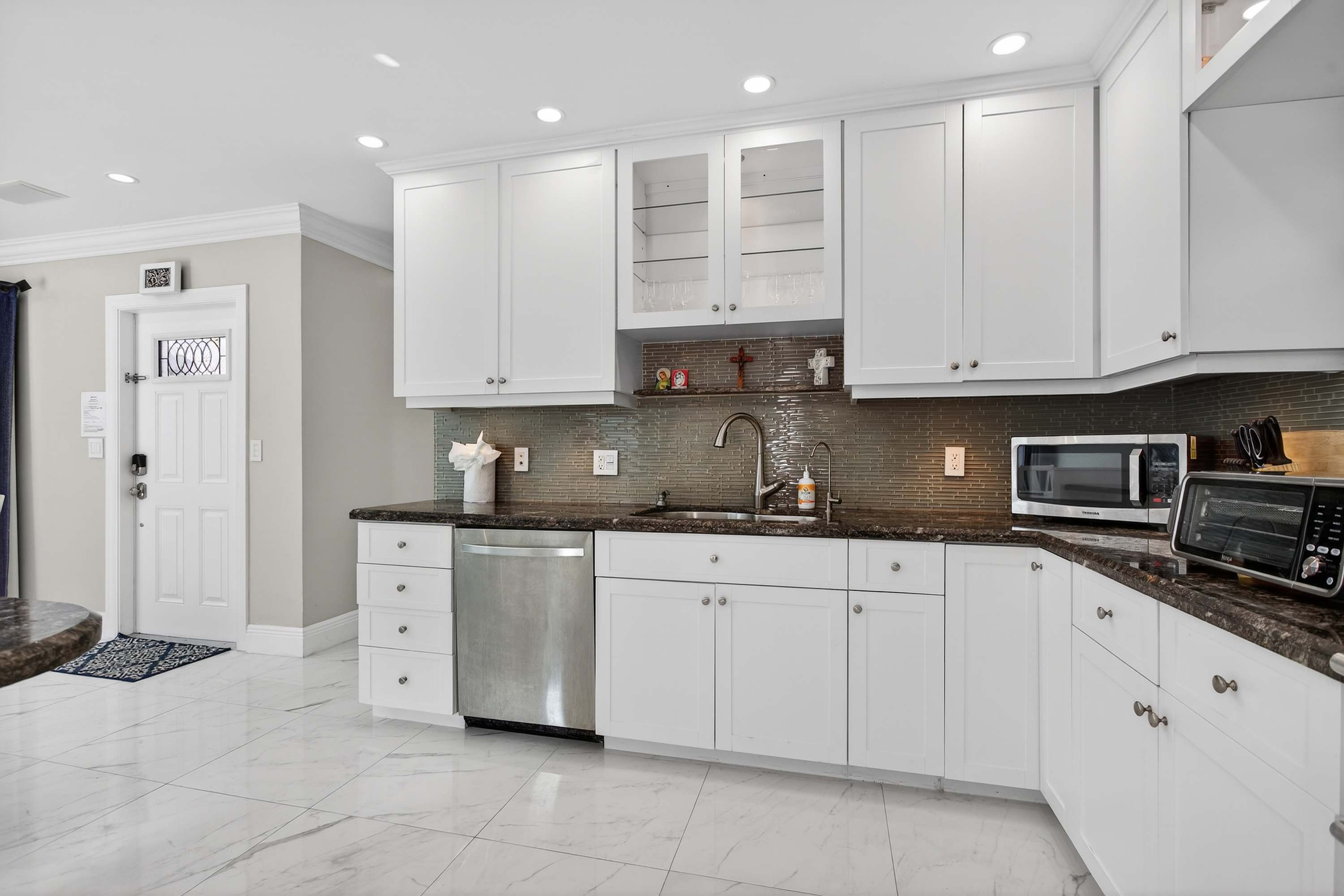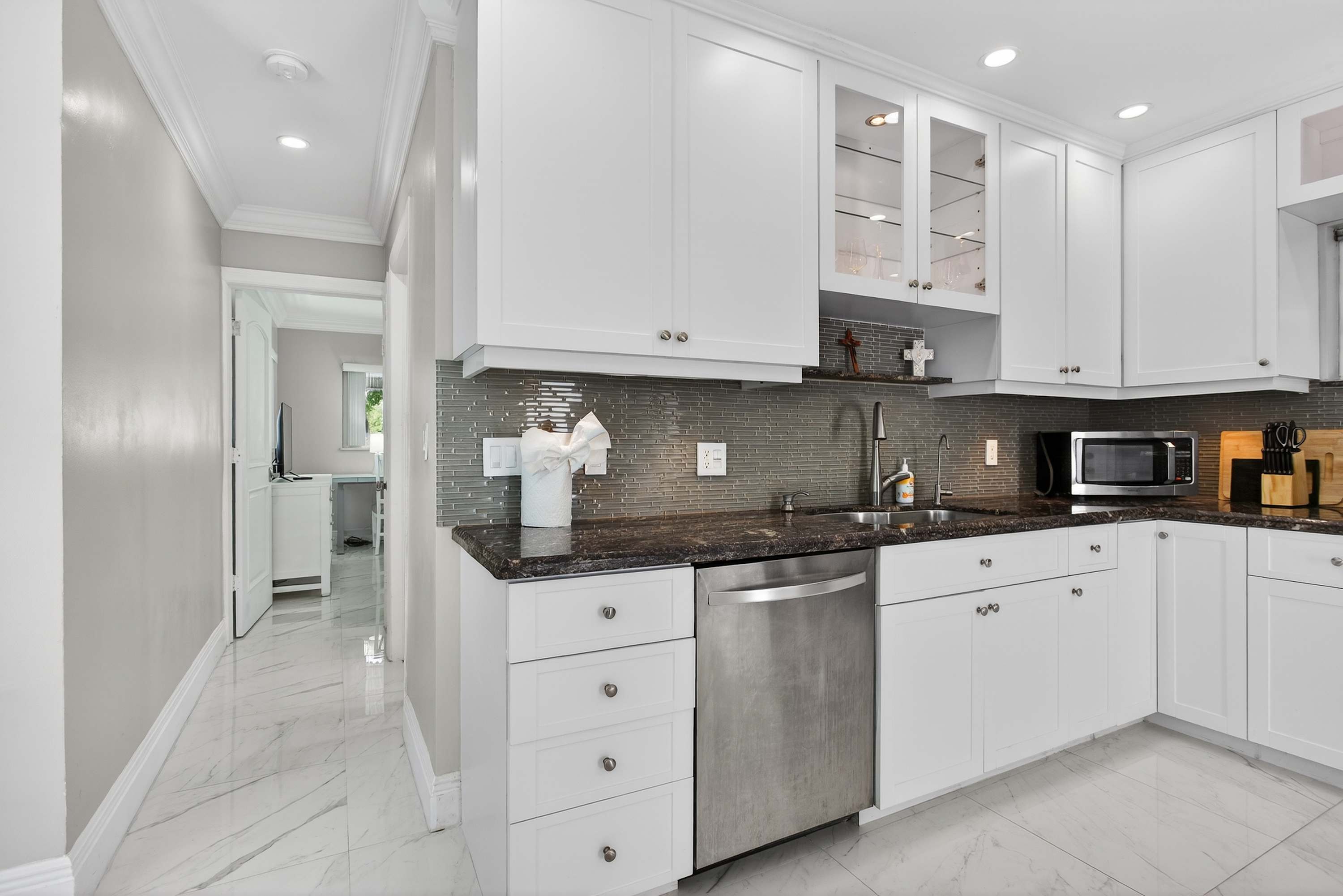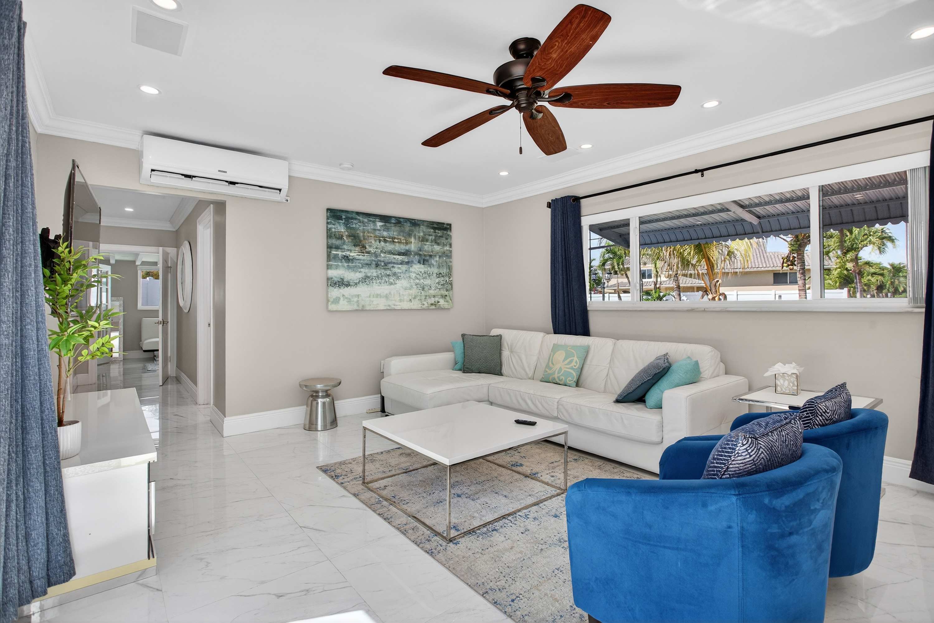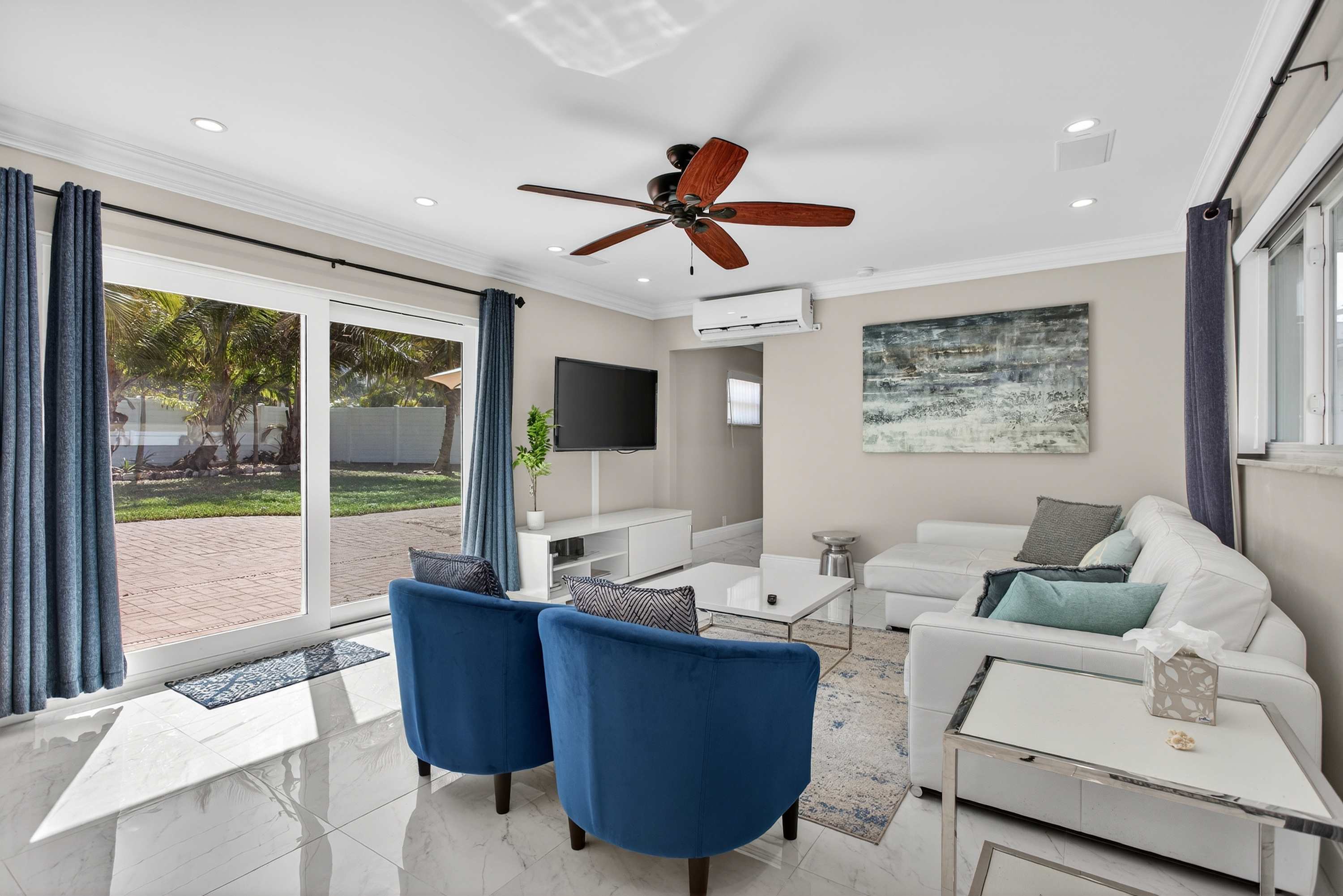 This inviting home offers a relaxed South Florida lifestyle with comfortable furnishings, a bright open layout, and thoughtfully designed spaces perfect for families or small groups. Inside, the spacious living area flows easily into the dining and kitchen spaces. The living room features a couch and chairs facing the smart TV, creating a comfortable spot to unwind after a day at the beach. Just beside it, a unique square dining booth wraps around the cabinetry with seating for six, ideal for shared meals or game nights. The kitchen is white, bright, and fully equipped with stone counters and a Keurig for easy mornings.
