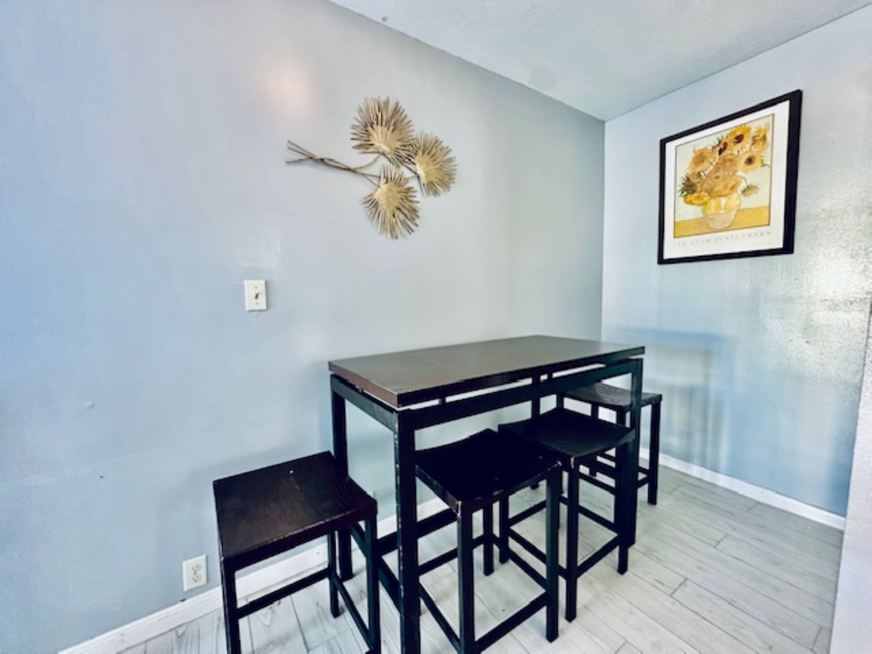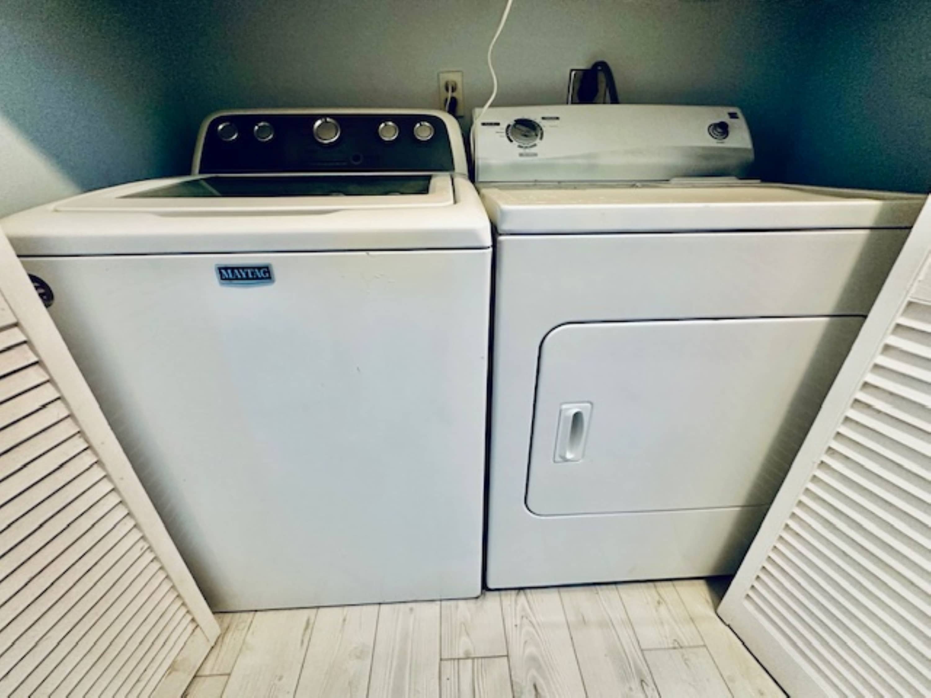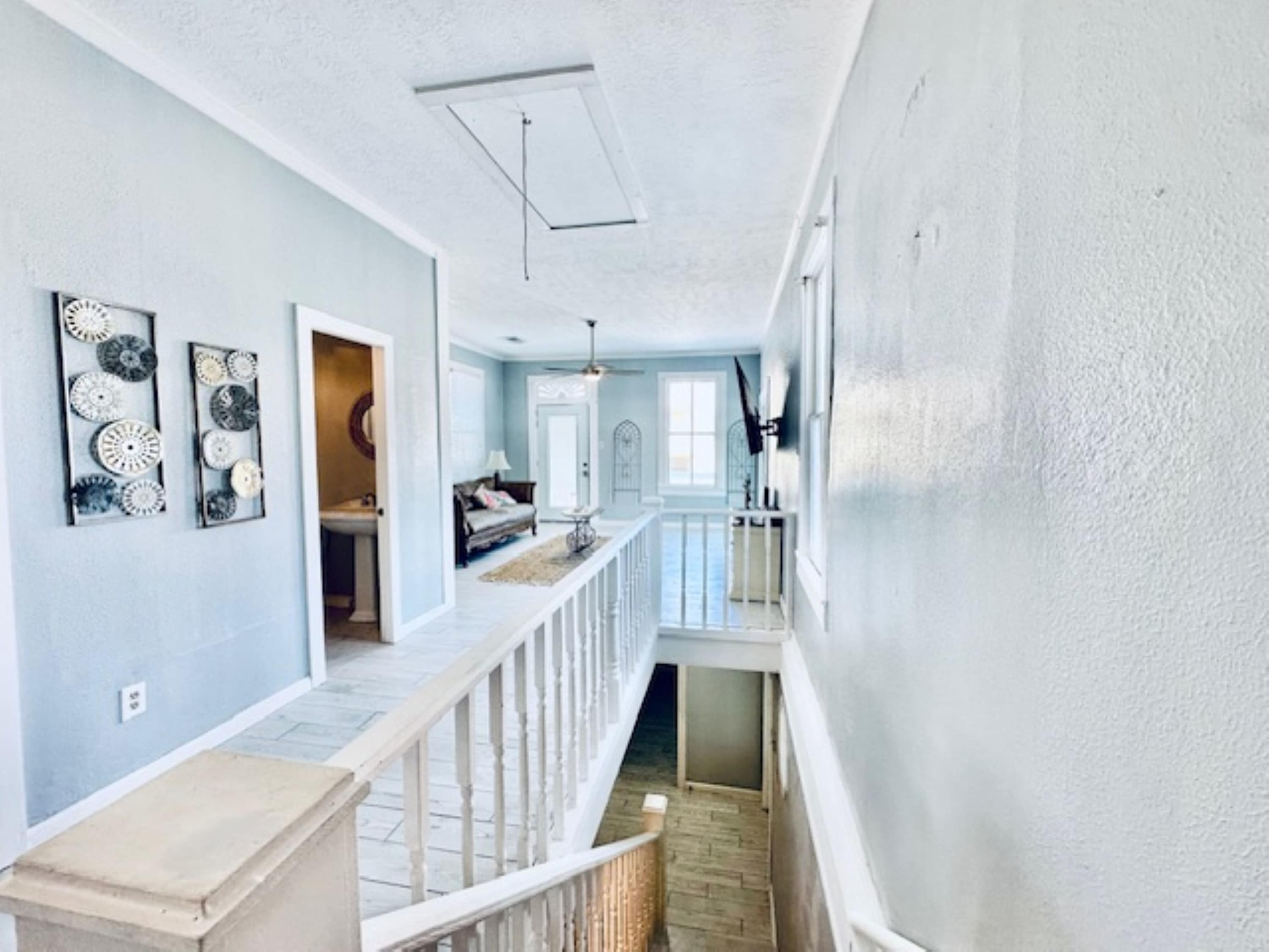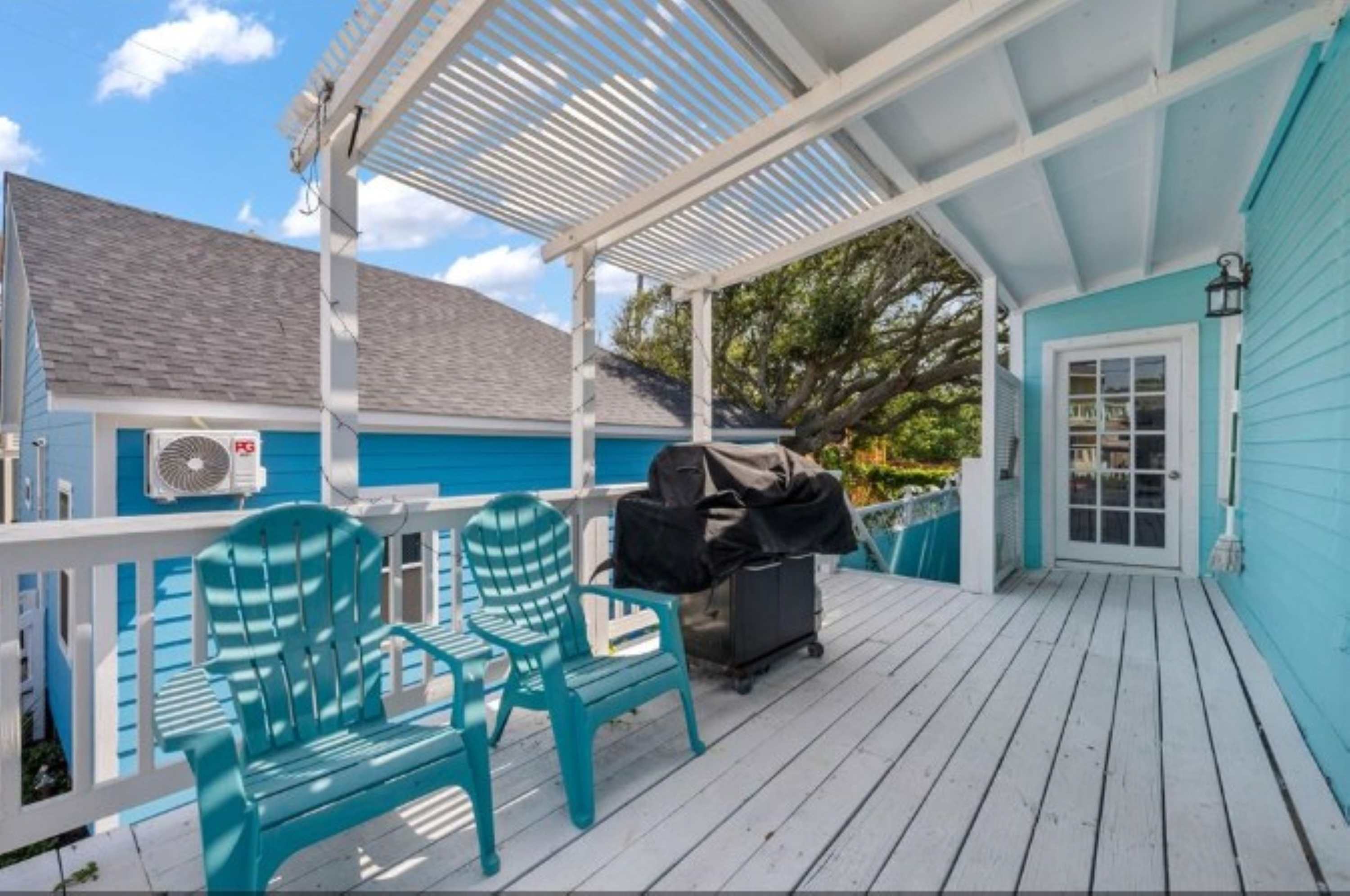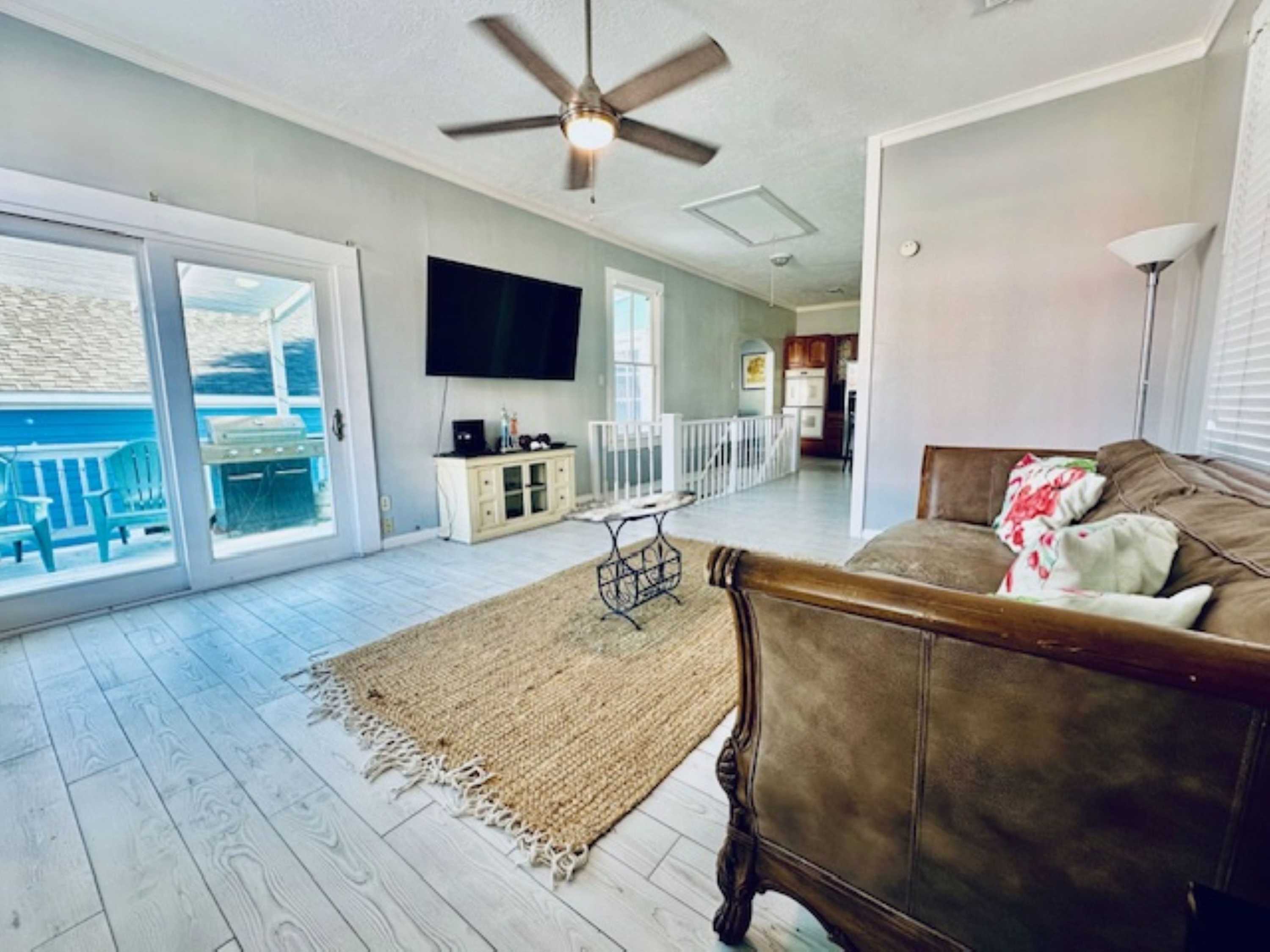 Inside this spacious two-story home, comfort and coastal charm come together across two bedrooms and two full bathrooms. The main living room offers a welcoming space with a sofa, smart TV, and board games for easy evenings in. Just beyond, the expandable dining table for six creates a great gathering spot for meals or planning the next day’s beach adventures. The kitchen features dark stone counters and stainless steel appliances, flowing naturally into the home’s standout feature—an oversized upstairs patio. Step outside to enjoy ample seating and fresh coastal air, making it the perfect place to sip morning coffee or unwind after a day in the sun.