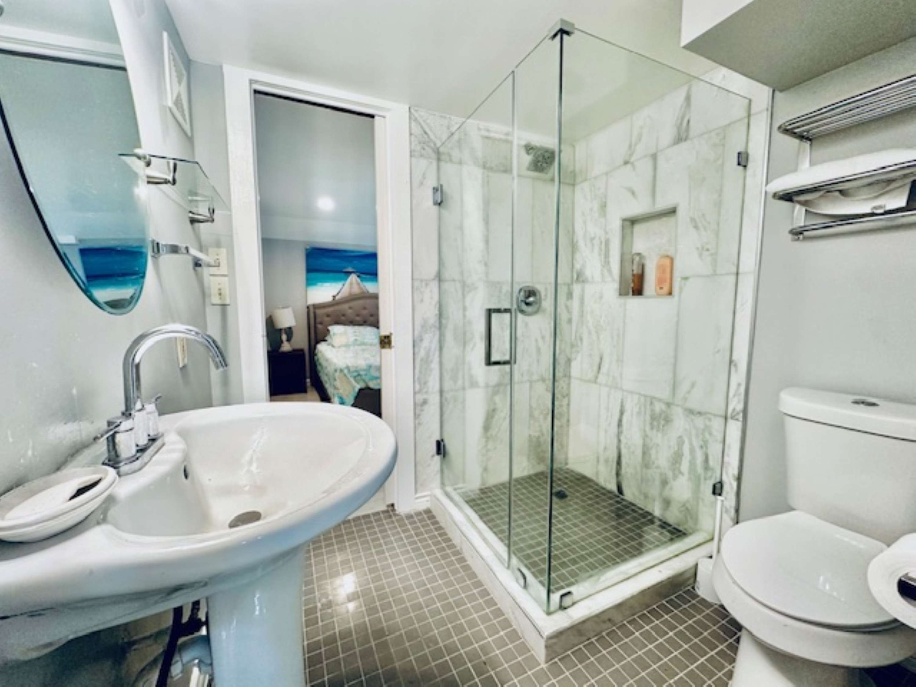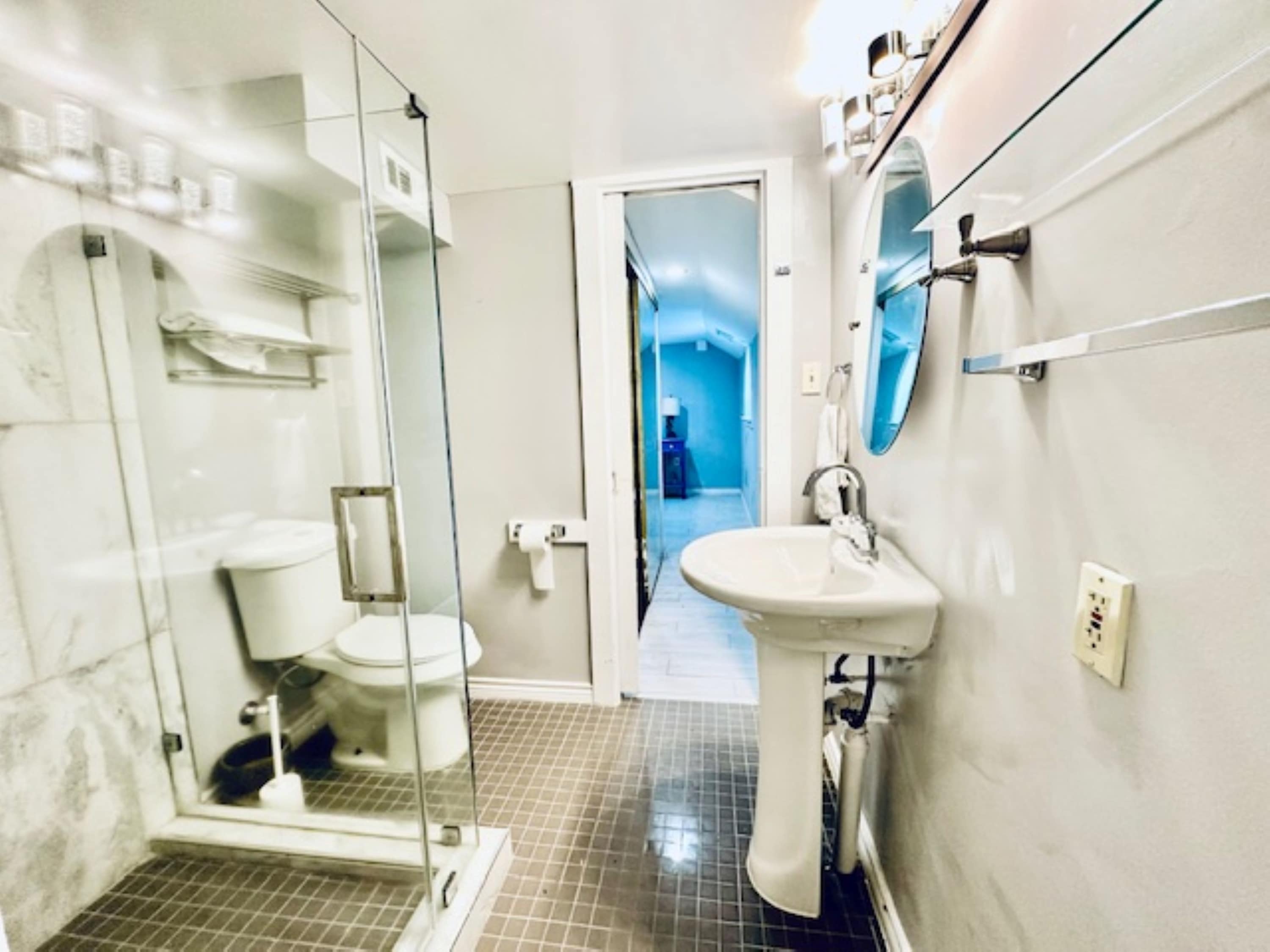 This home also includes a full guest bathroom with a single vanity and a walk-in shower.