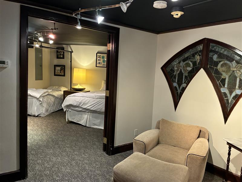 • Bedroom 2 (second level, lofted; accessible only via spiral staircase): Queen bed + twin bed, sleeps 3 in beds.