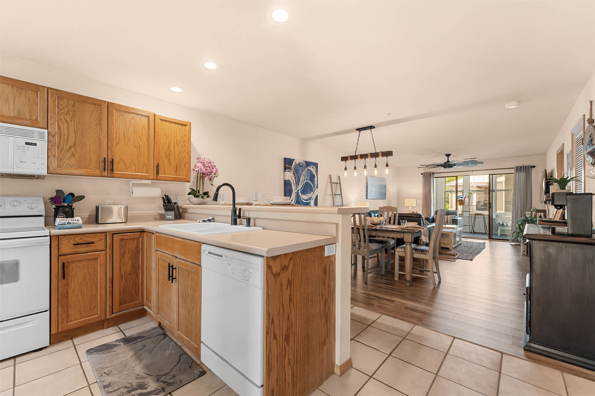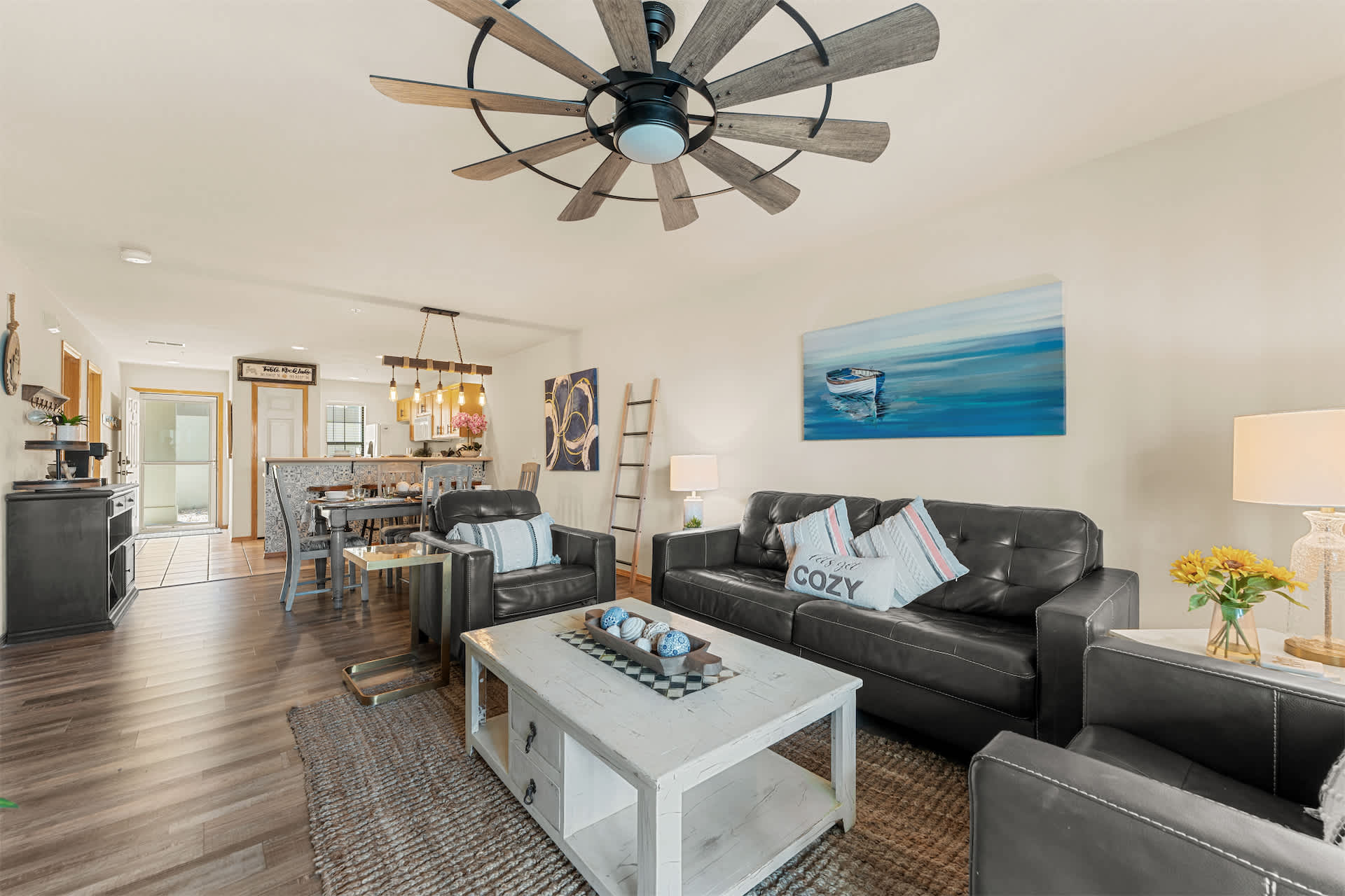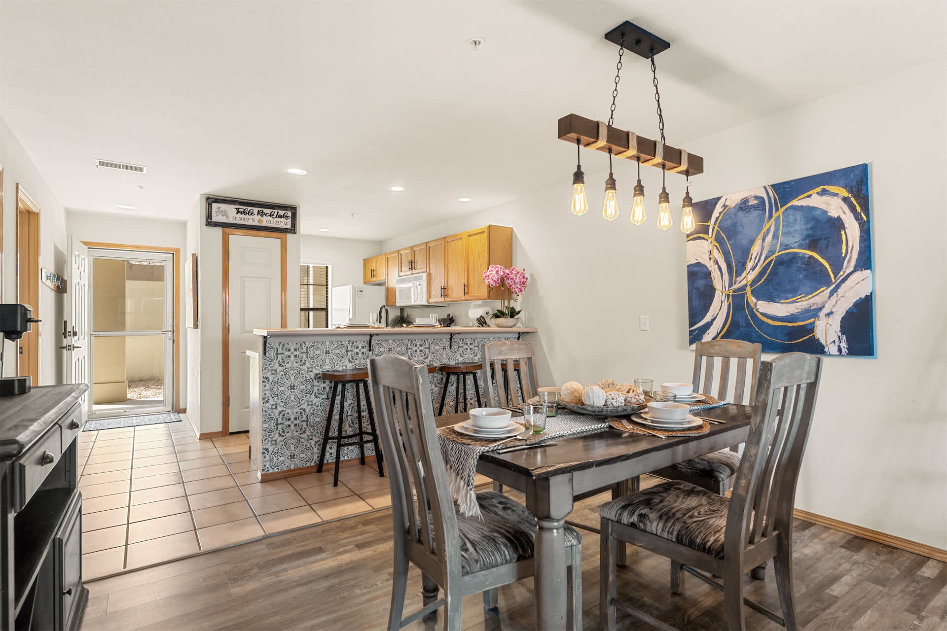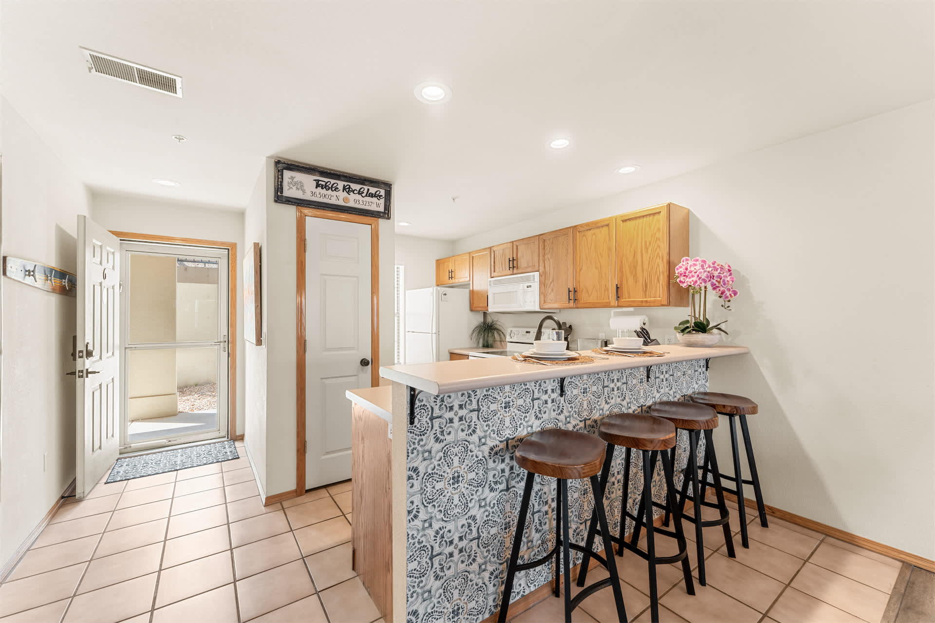 Step inside to a welcoming open layout designed for comfort and easy living. The kitchen is equipped with all the essentials and features counter seating for four, along with a dedicated coffee station offering both drip and Keurig options to start your mornings right. Just beyond, a dining table for four creates a cozy space for meals or game nights. The living room invites you to unwind with a smart TV, board games, a comfortable couch, and armchairs arranged for conversation. Sliding doors open to a private sunroom filled with natural light and plenty of seating — the perfect spot to sip coffee, read a book, or relax after a day exploring the lake.