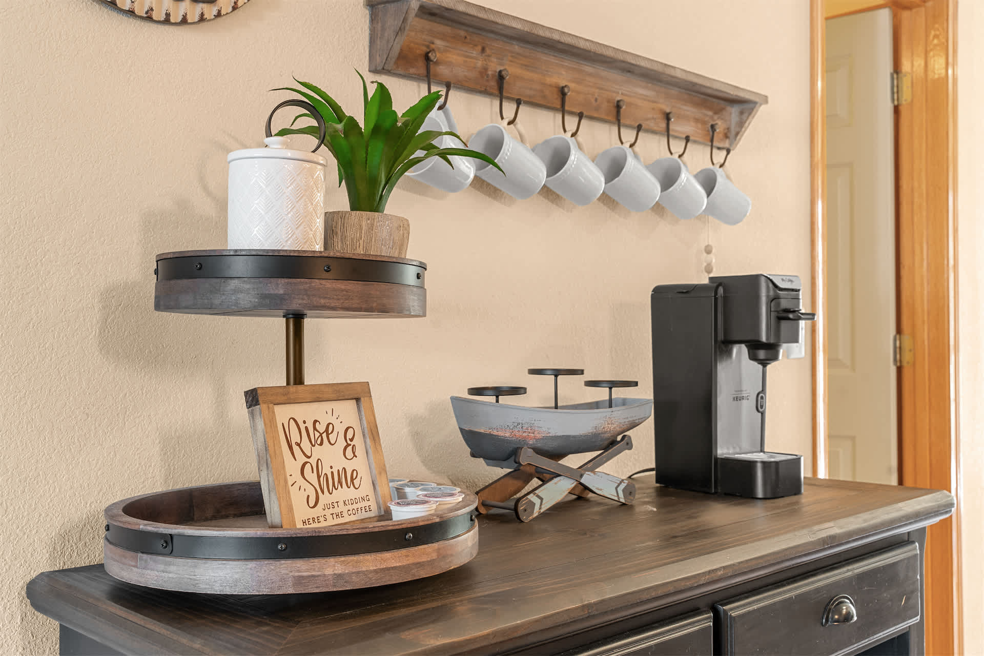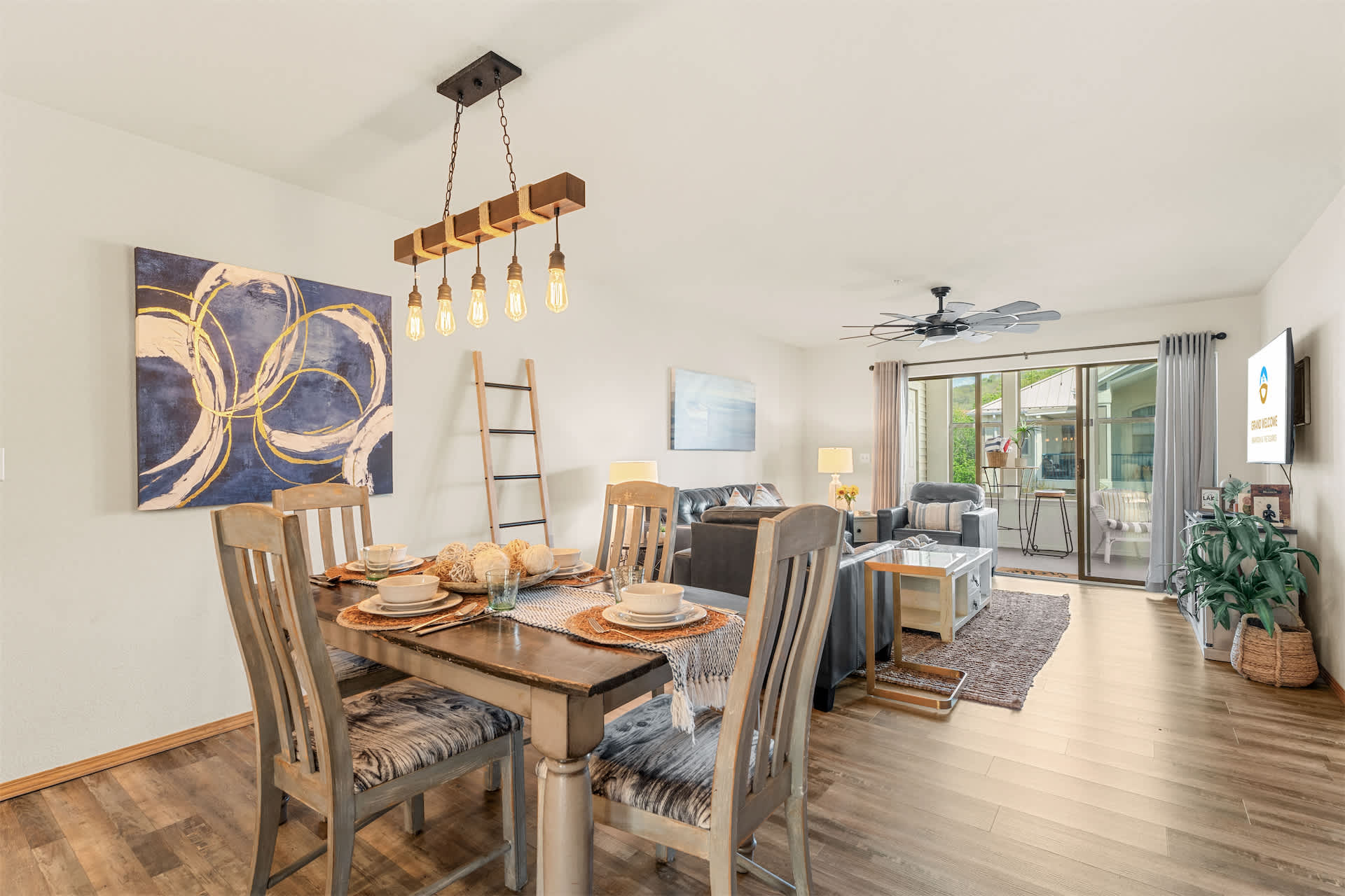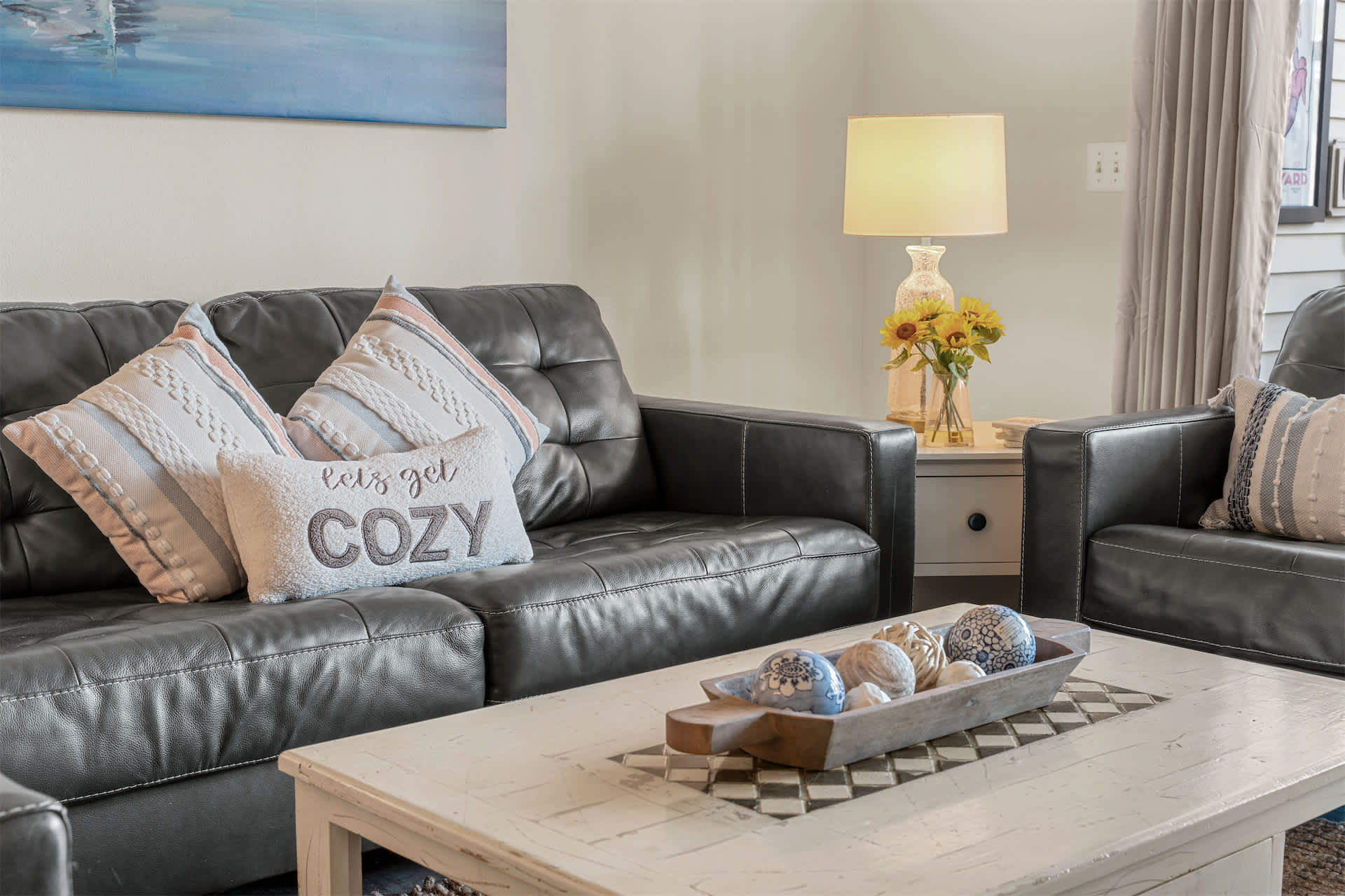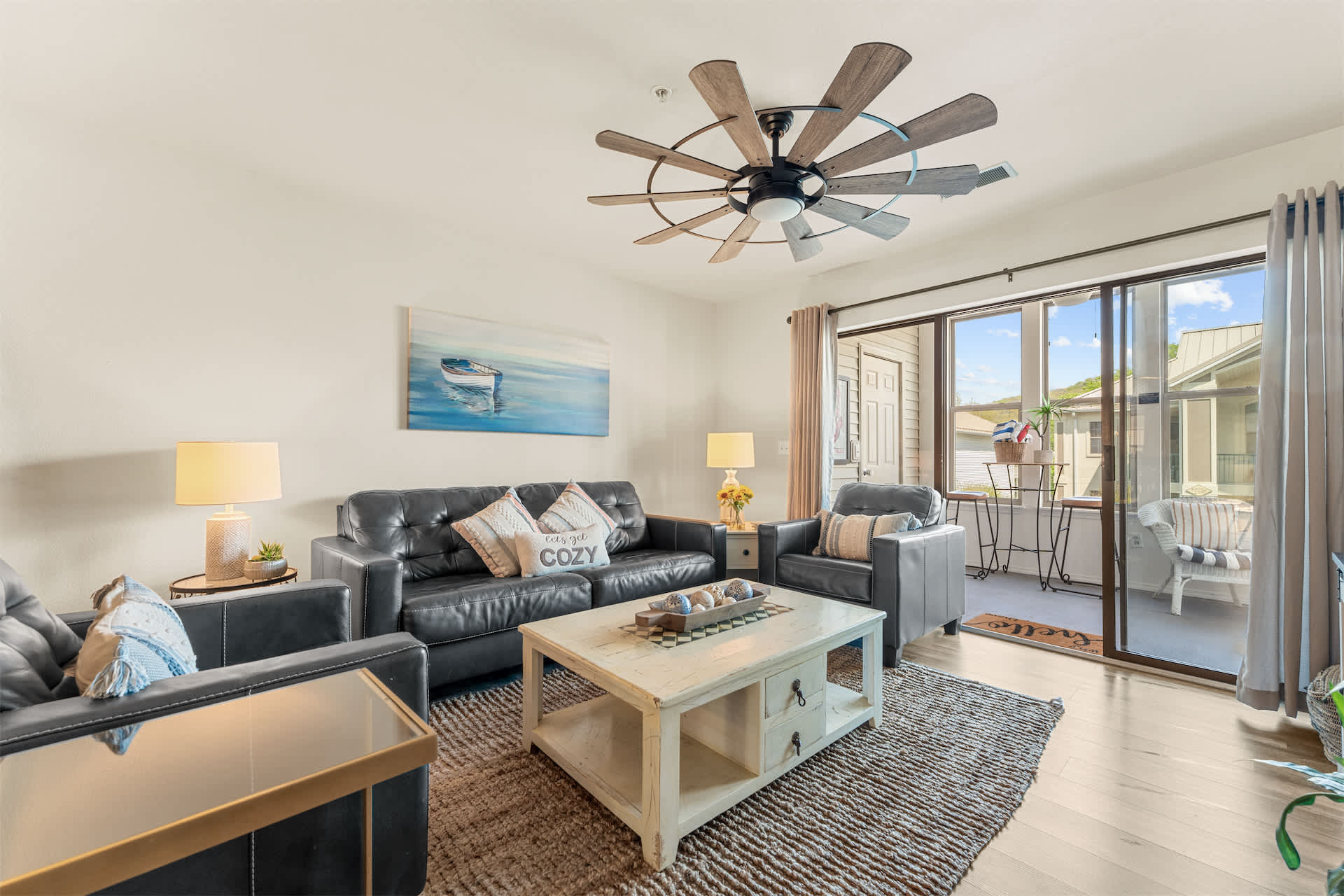 Step inside to a welcoming open layout designed for comfort and easy living. The kitchen is equipped with all the essentials and features counter seating for four, along with a dedicated coffee station offering both drip and Keurig options to start your mornings right. Just beyond, a dining table for four creates a cozy space for meals or game nights. The living room invites you to unwind with a smart TV, board games, a comfortable couch, and armchairs arranged for conversation. Sliding doors open to a private sunroom filled with natural light and plenty of seating — the perfect spot to sip coffee, read a book, or relax after a day exploring the lake.
