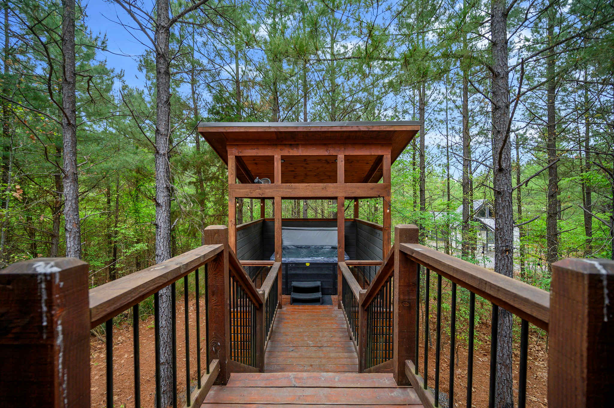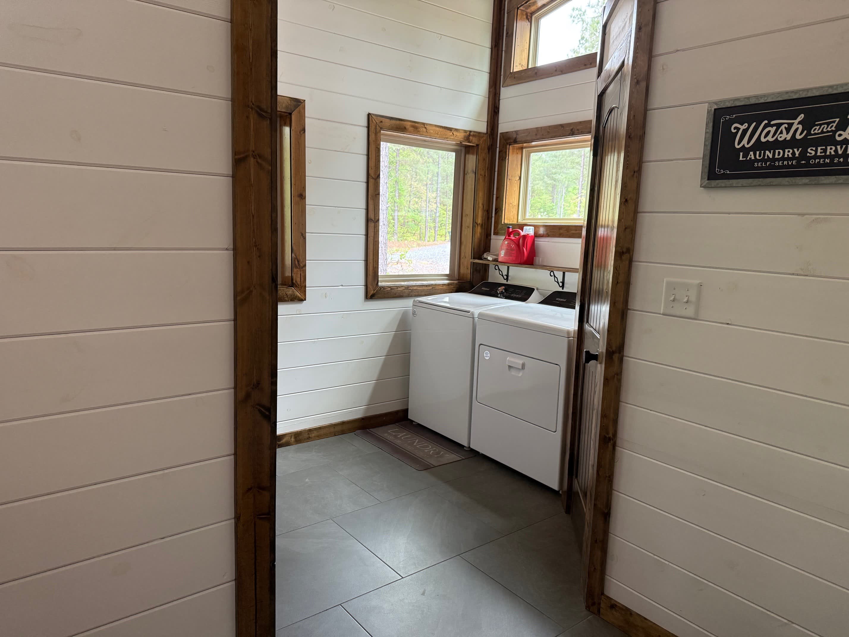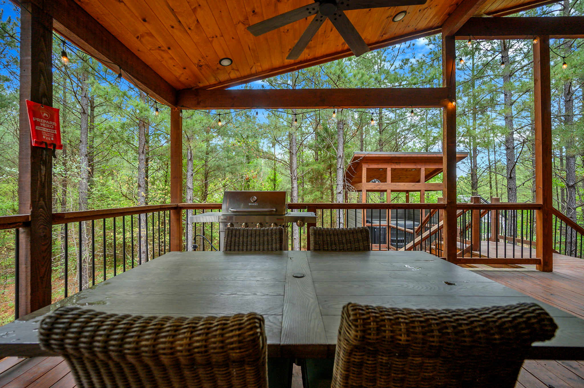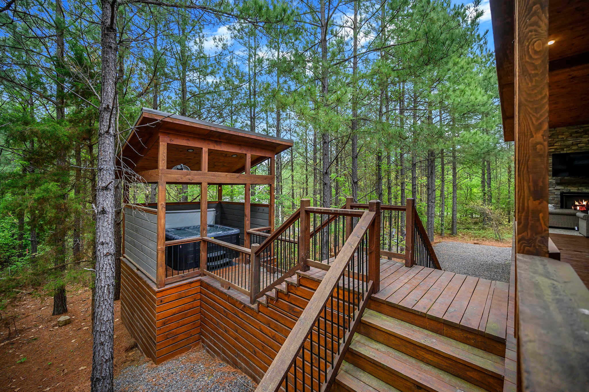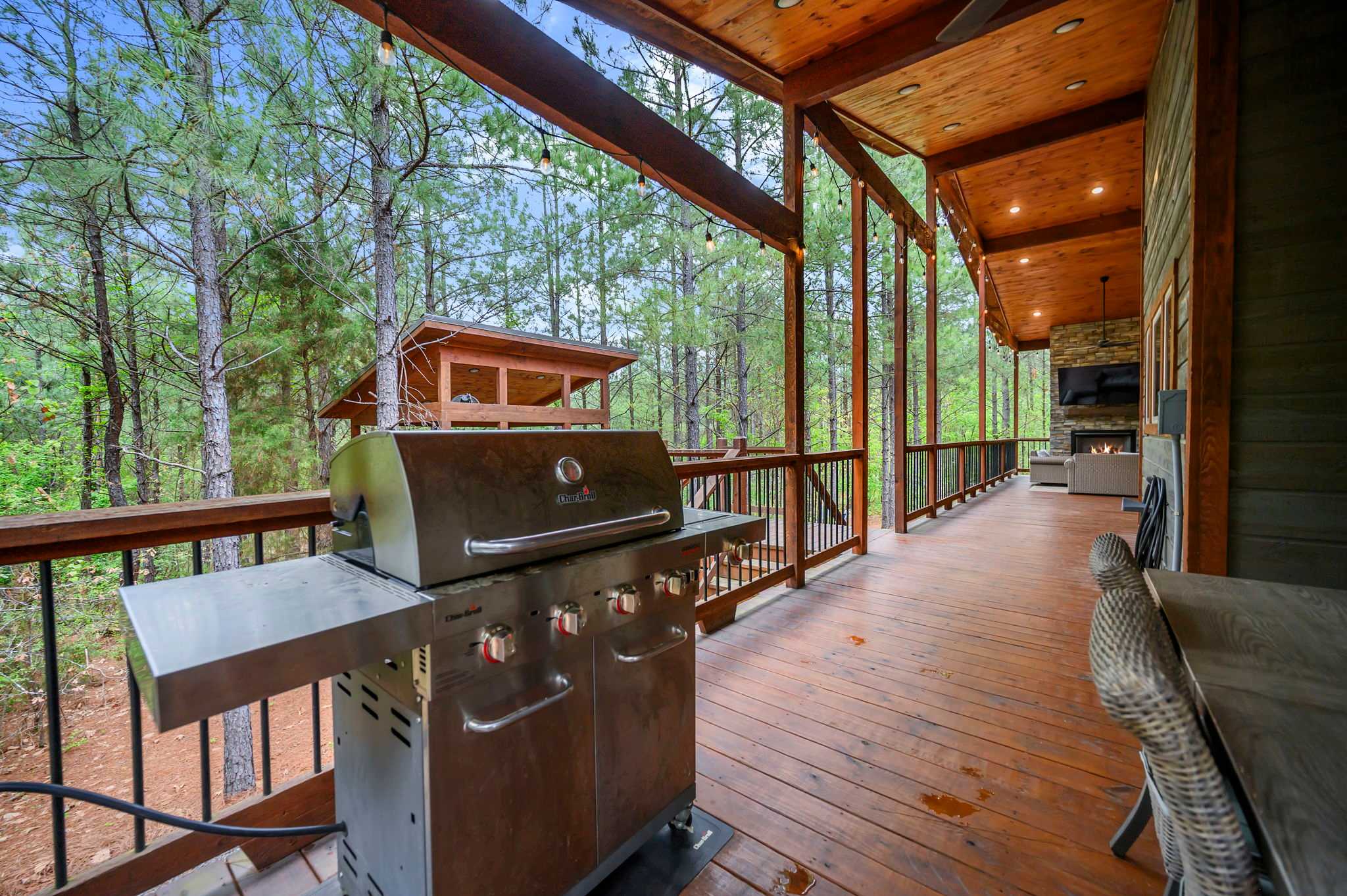 The outdoor spaces set the tone for relaxation from the moment you arrive. A spacious covered deck features comfortable seating gathered around an outdoor fireplace, creating the perfect place to unwind in any season. Nearby, a grill and table for four make al fresco meals easy while you soak in the peaceful forest setting. Tucked into a more secluded section of the deck, the hot tub offers a private spot to relax beneath the trees, while the yard below invites evenings around the fire pit under the stars. With nature all around, this cabin is designed for making the most of Broken Bow’s fresh air and quiet surroundings.