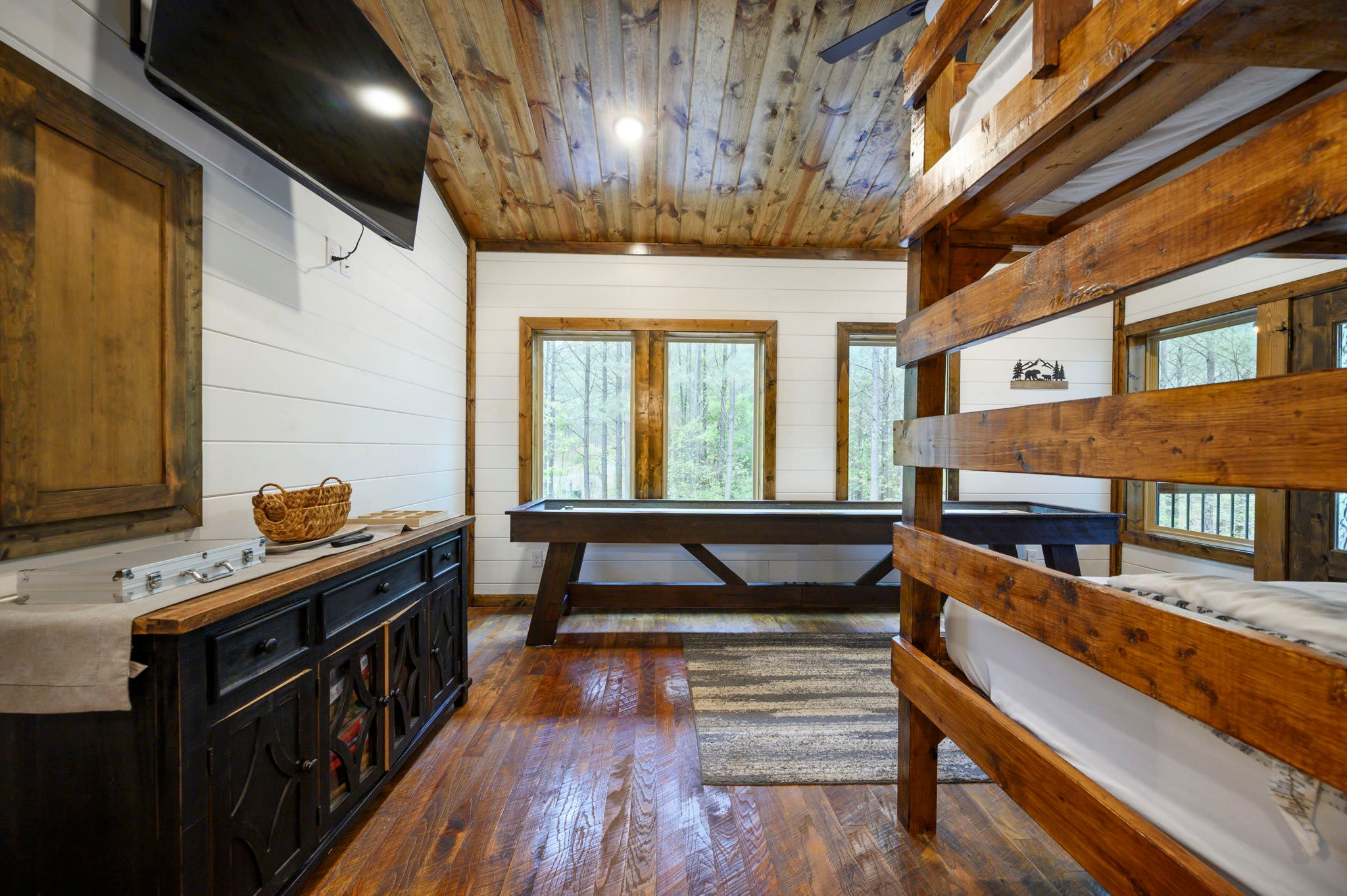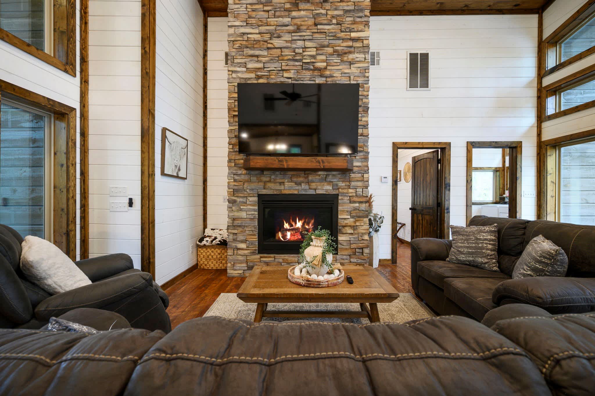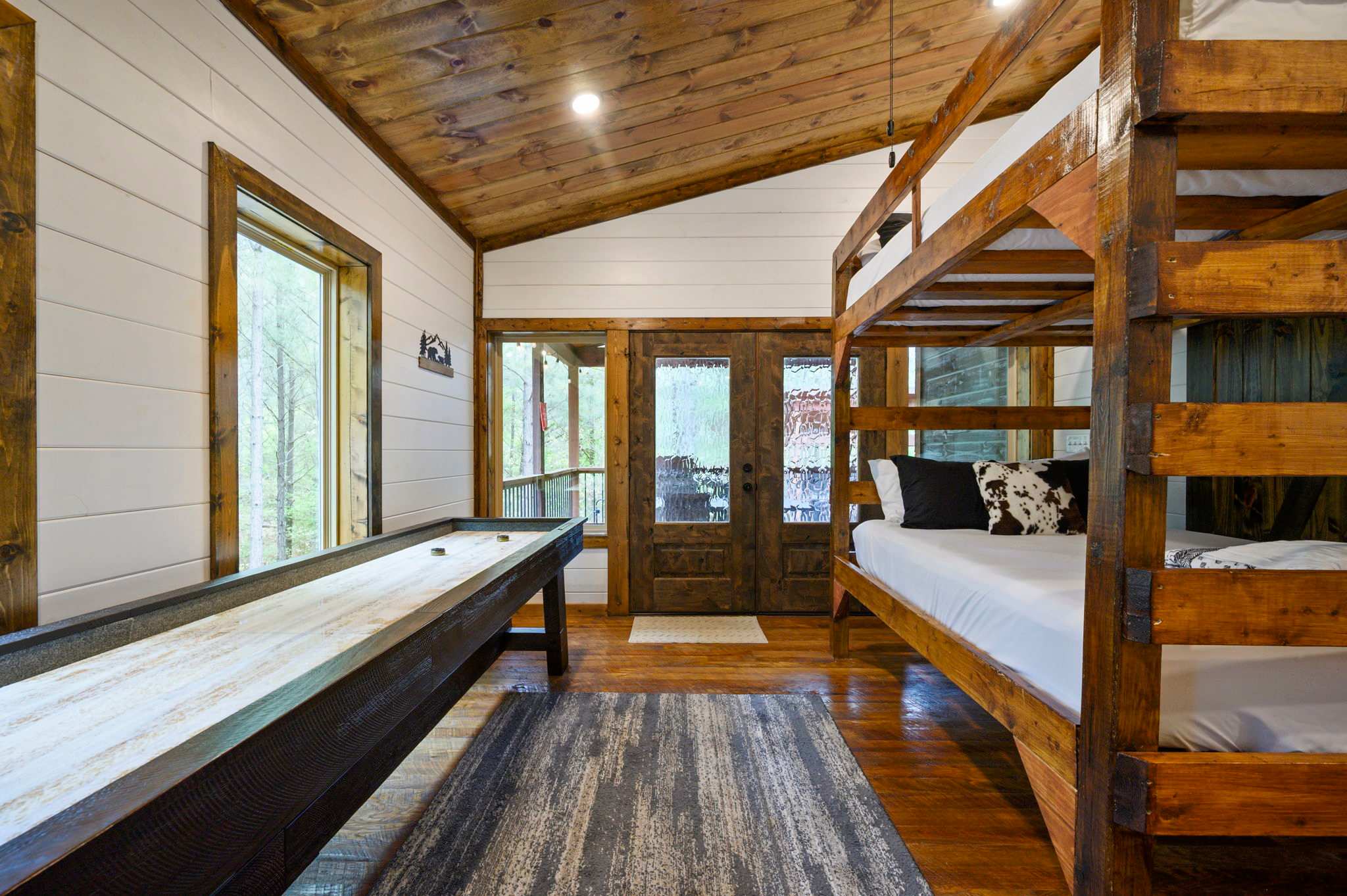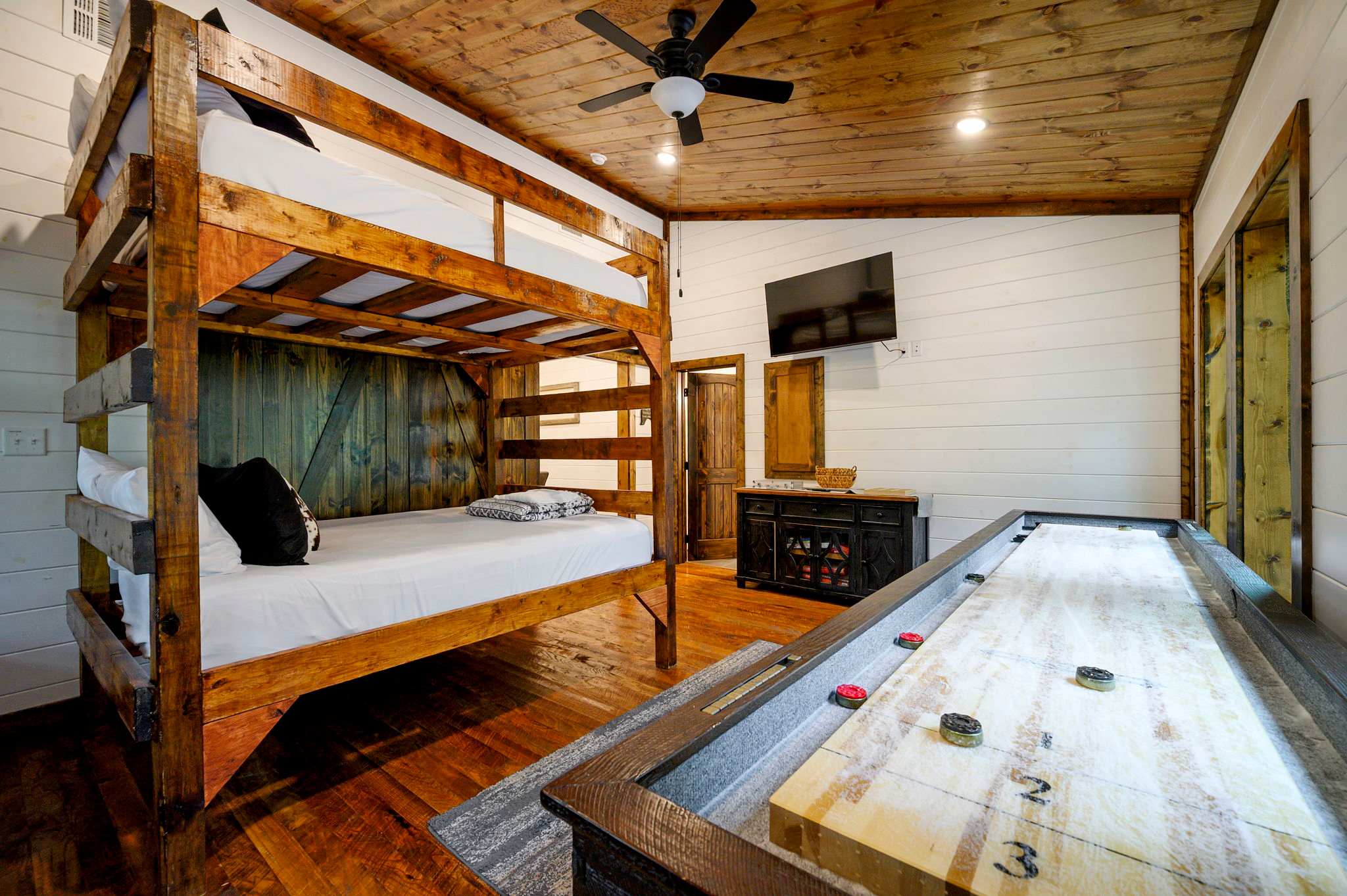 Inside, the warm and inviting living room showcases large windows, comfy leather furniture, a smart TV, and a gas fireplace that makes the space ideal for cozy nights in. The oversized kitchen is fully equipped with modern appliances, both Keurig and traditional coffee makers, and plenty of room for preparing meals for the whole group. Just beyond, the dining table for eight creates a natural gathering place for shared meals and conversation. Each bedroom features its own exterior door for added privacy and easy access to the outdoors, while the bunk room adds extra fun with a shuffleboard table. Thoughtfully designed and surrounded by trees, The Retreat at Red Fern is a relaxing and memorable Broken Bow getaway.